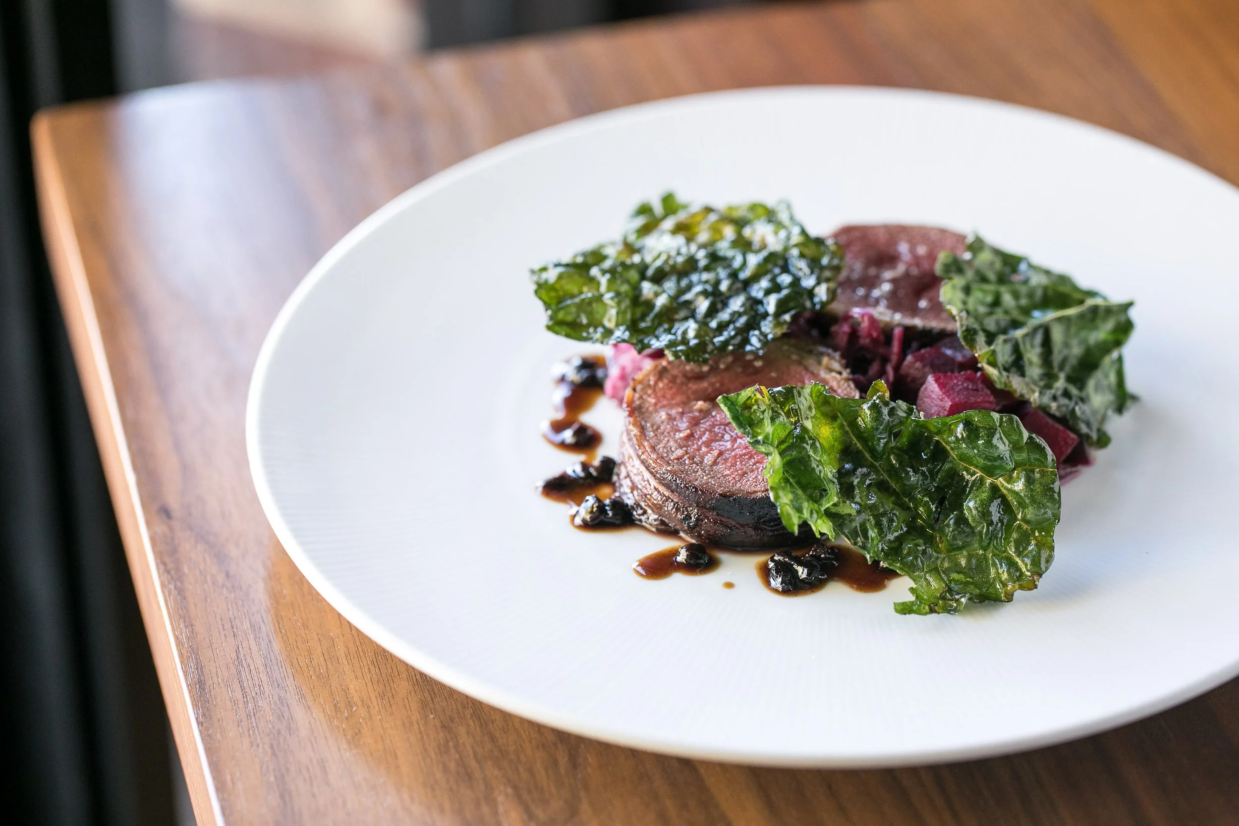Bacon-Wrapped Venison Loin, Braised Red Cabbage, Roasted Beets, Crispy Kale, and Blackcurrants