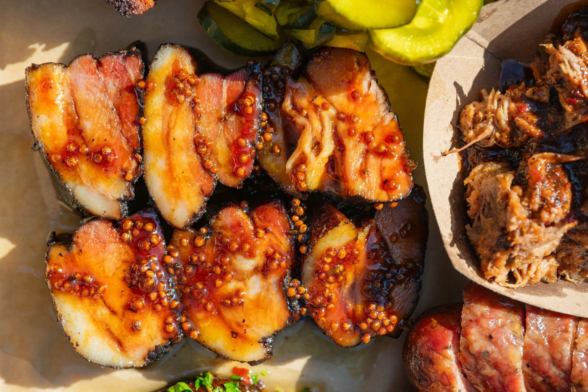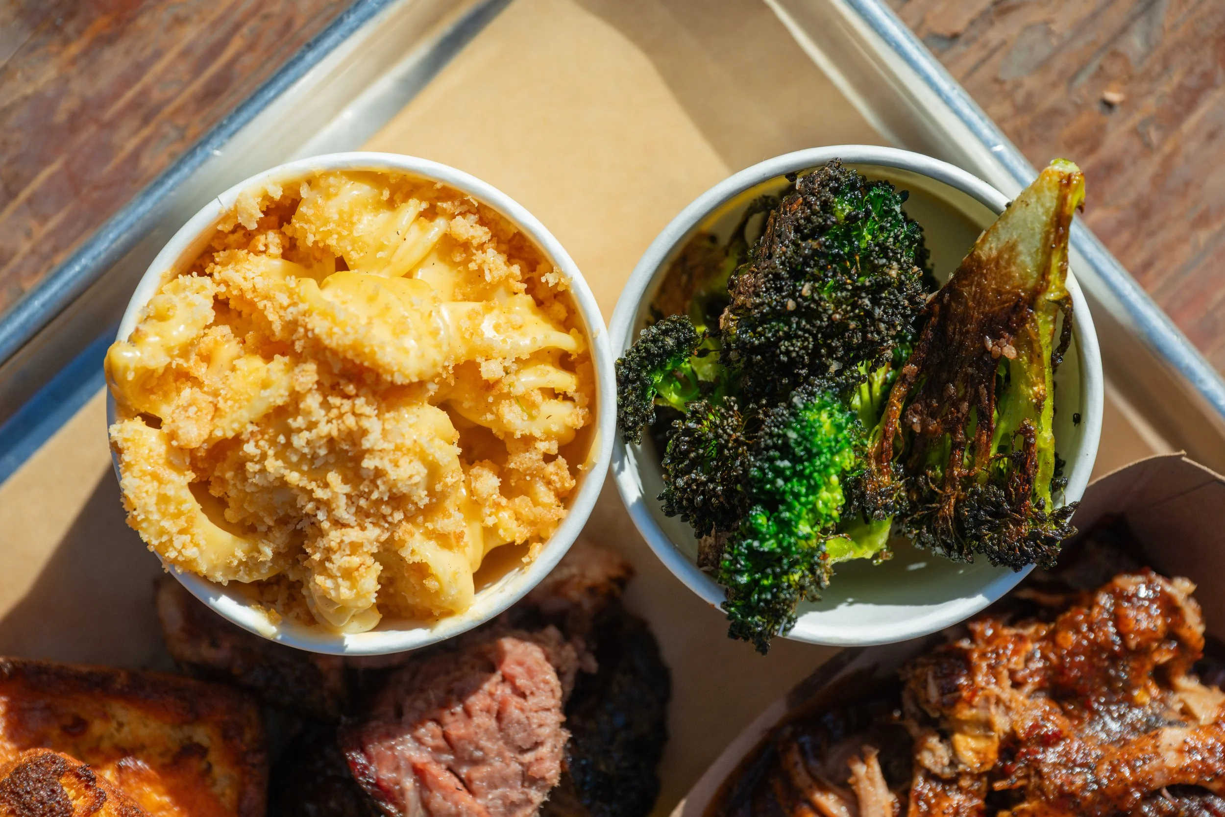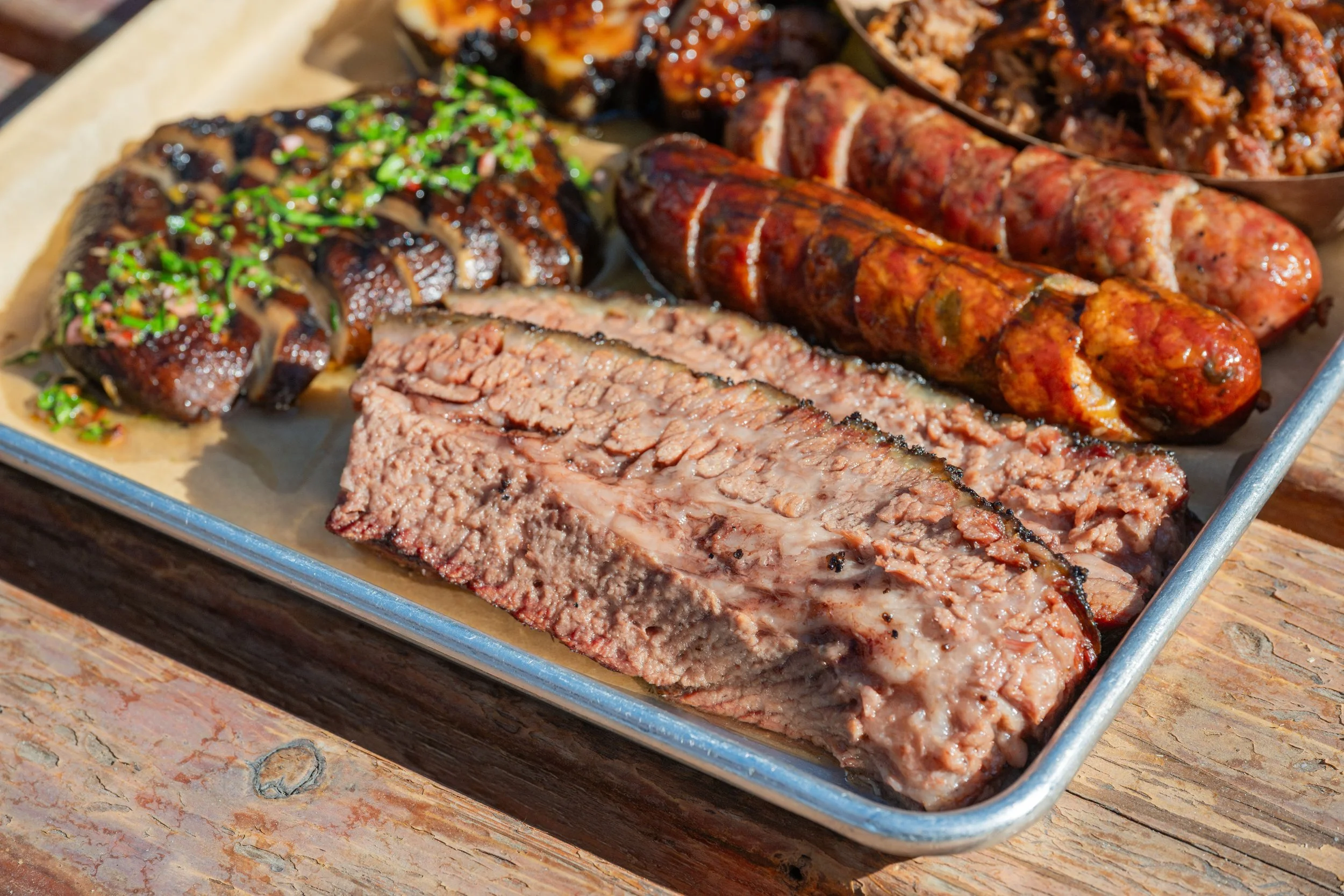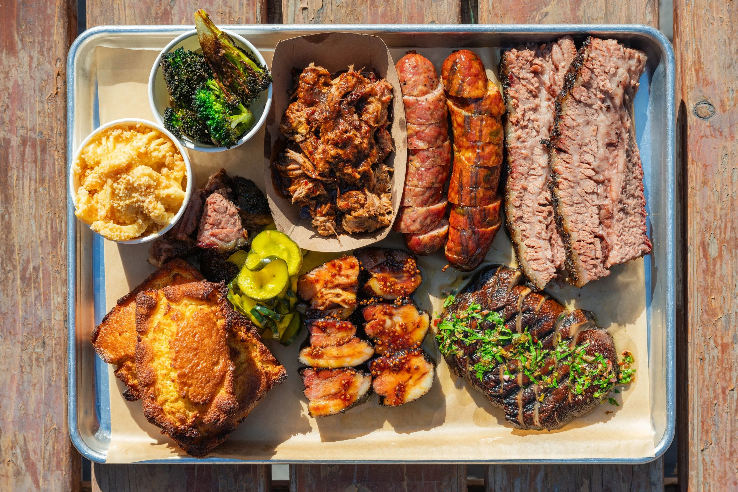 Brisket, Brisket Burnt Ends, Carolina Pulled Pork, Bourbon-Glazed Pork Belly, Smoked Bratwurst, Hatch Chile-Cheddar Hog Link, Parmesan‑Chicharrón Mac and Cheese, Roasted Broccoli, Corn Bread, Mint Chimichurri Portobello Mushrooms