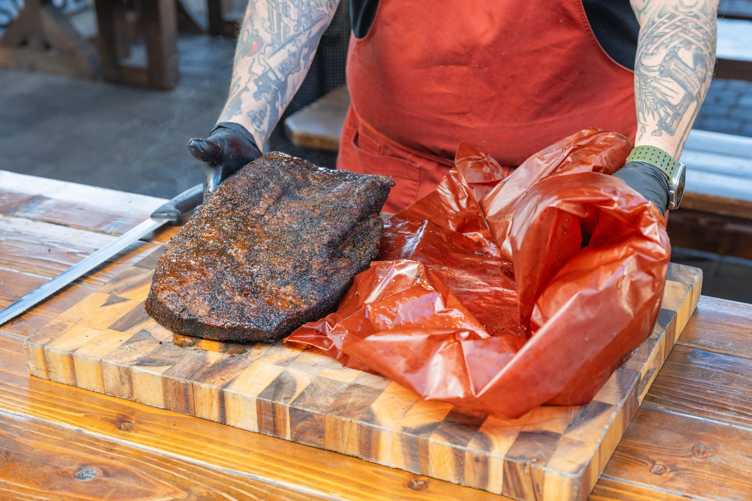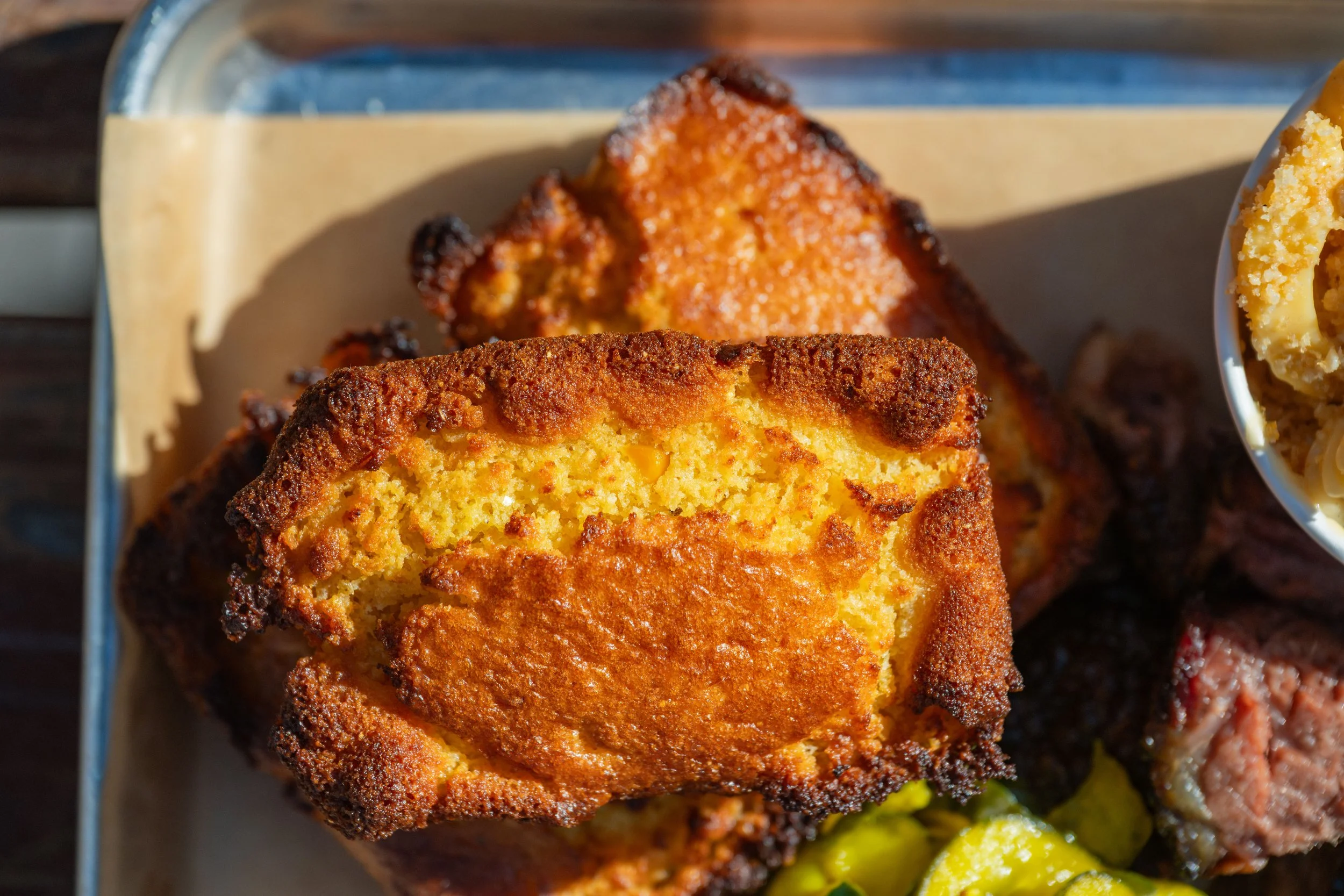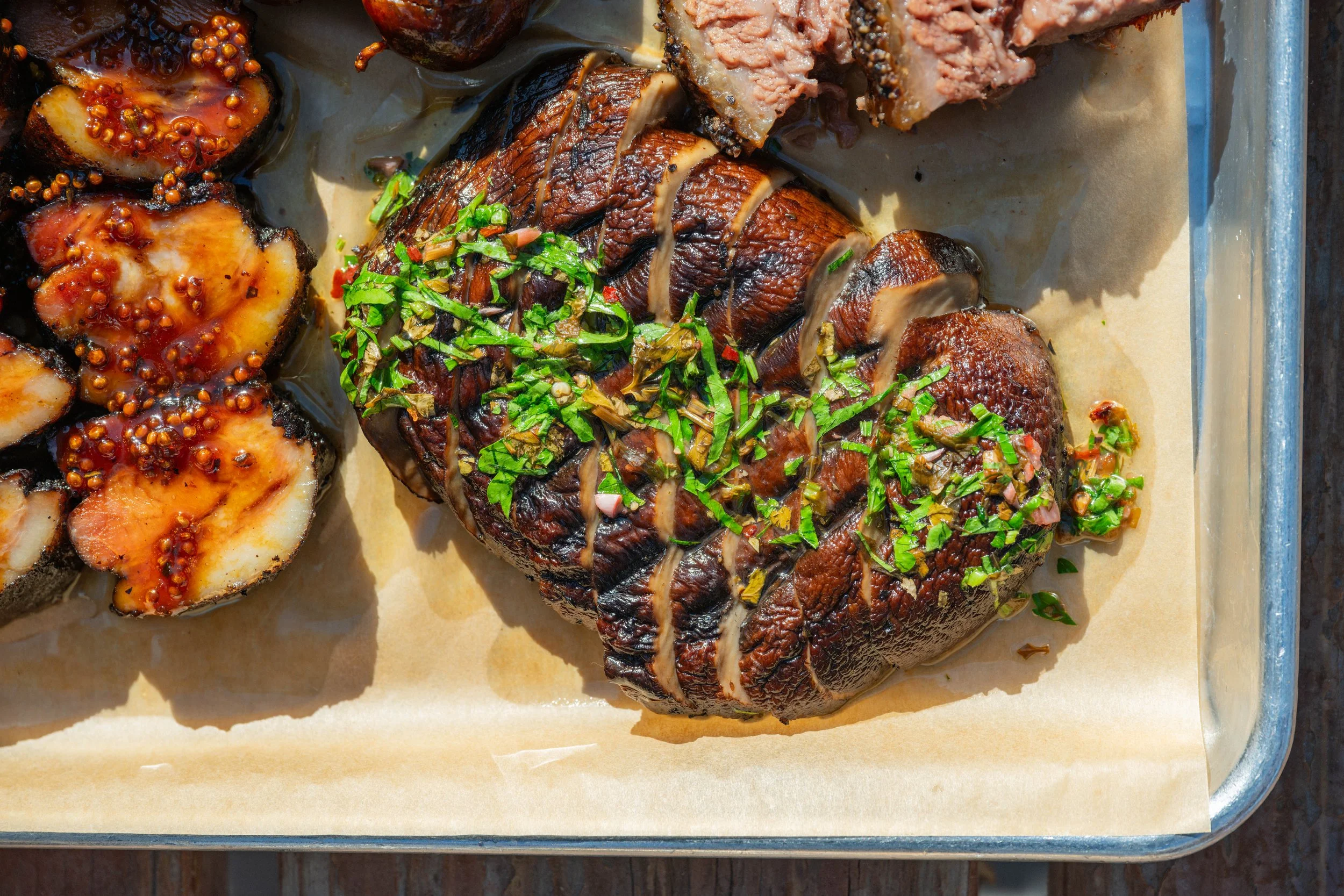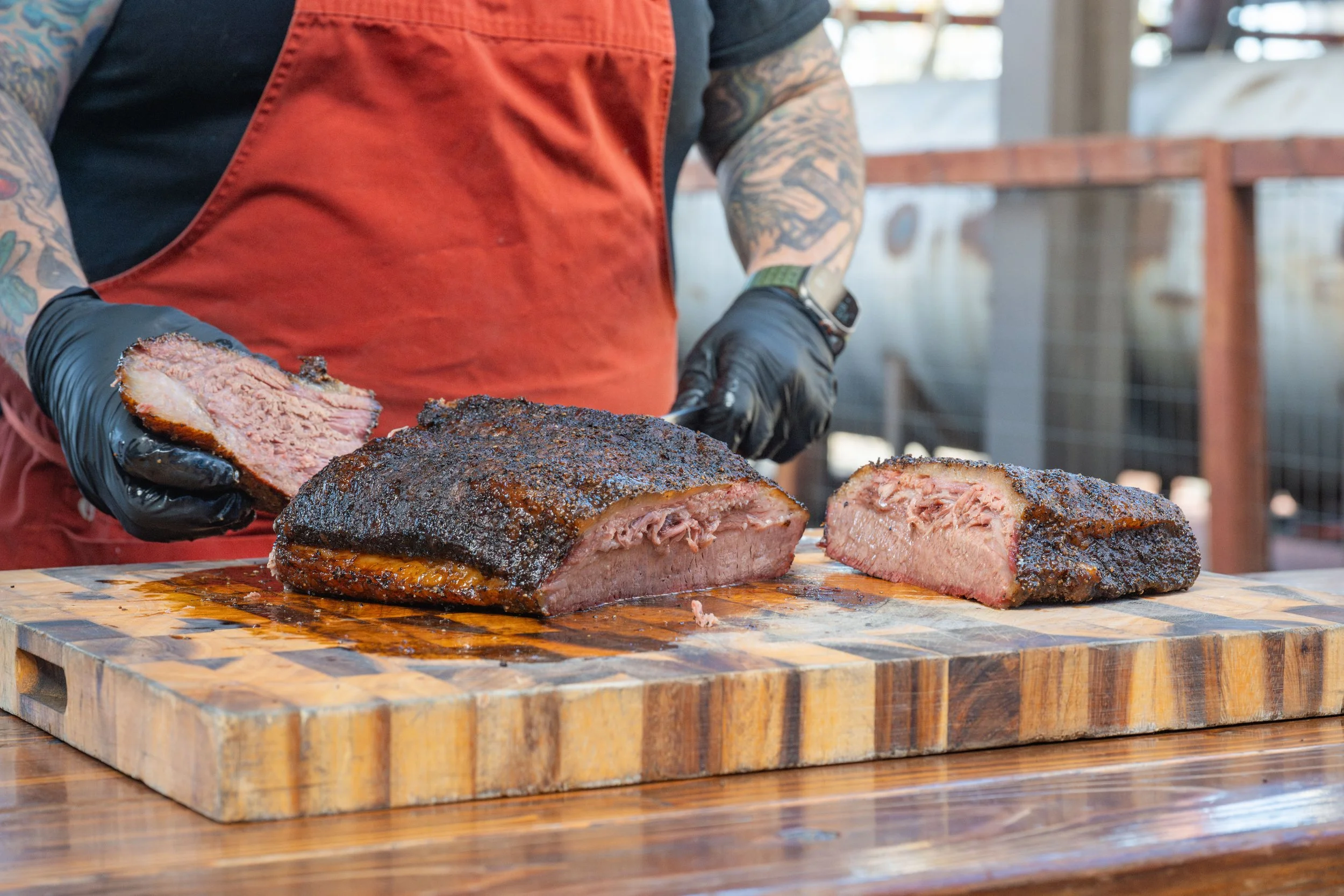 Brisket, Brisket Burnt Ends, Carolina Pulled Pork, Bourbon-Glazed Pork Belly, Smoked Bratwurst, Hatch Chile-Cheddar Hog Link, Parmesan‑Chicharrón Mac and Cheese, Roasted Broccoli, Corn Bread, Mint Chimichurri Portobello Mushrooms
