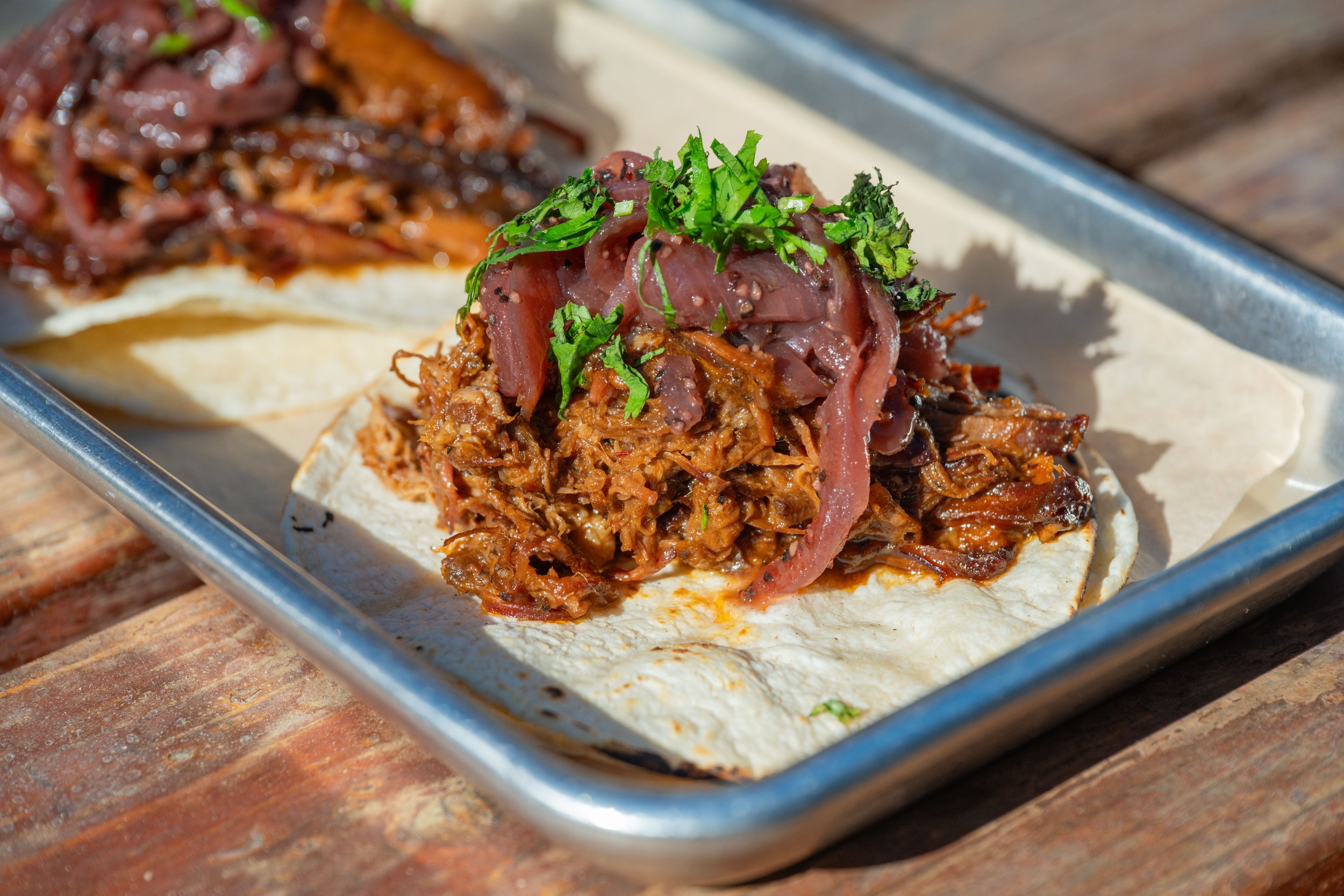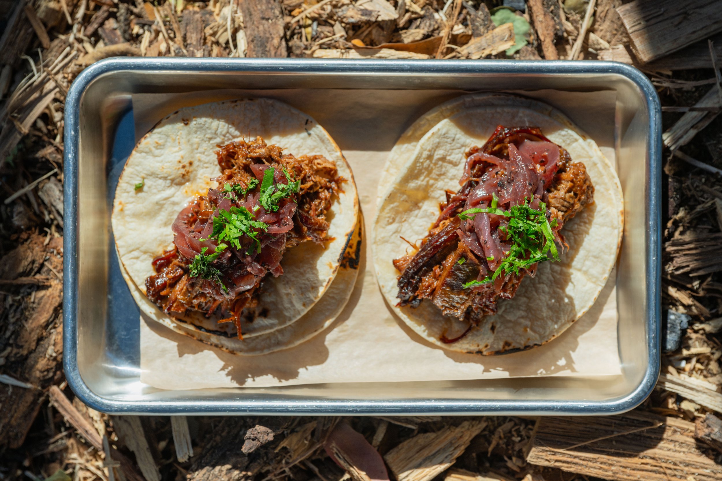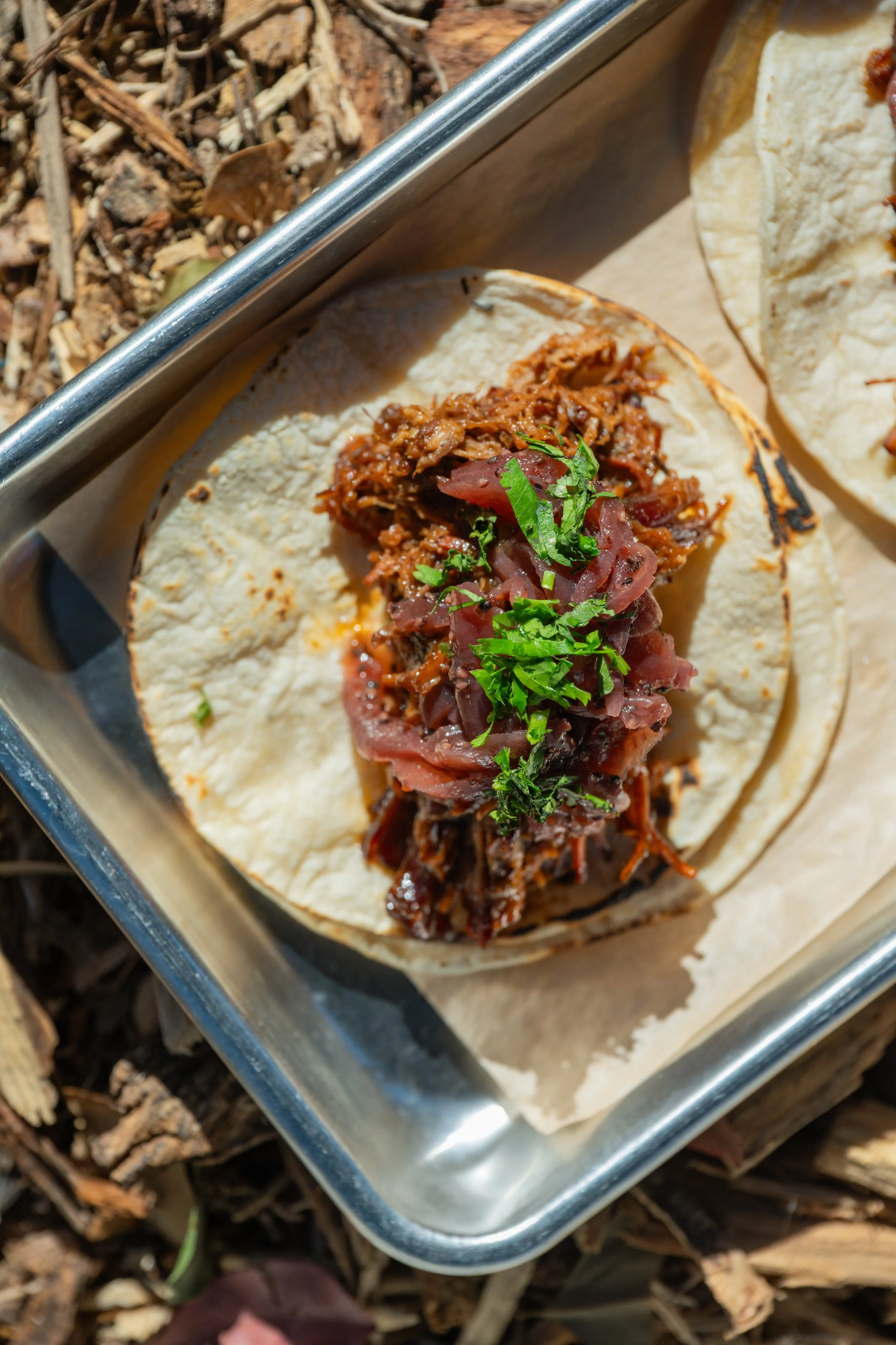 Brisket Barbacoa Tacos: Brisket, Pickled Onions, Corn Tortilla, Lime Juice