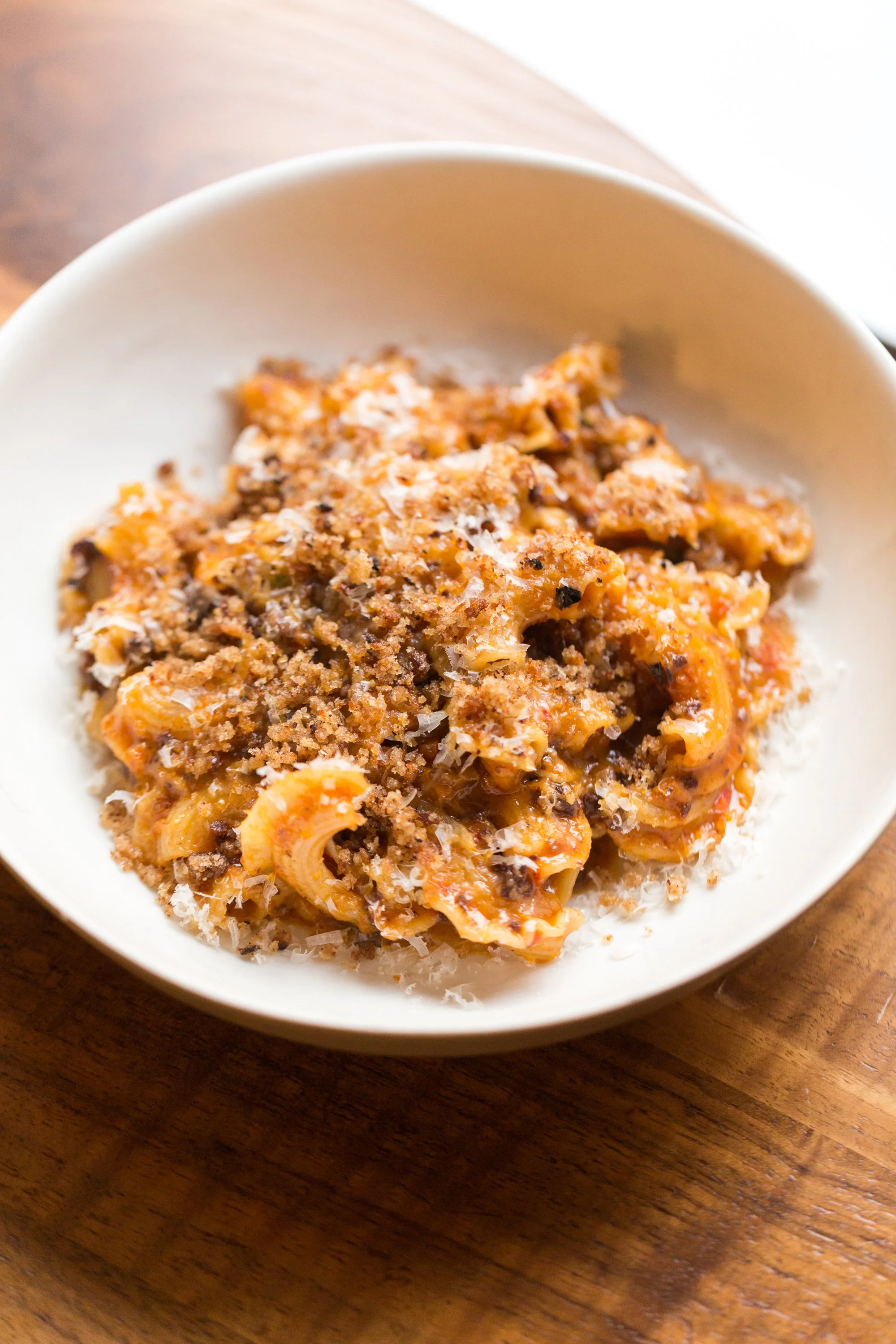 Creste de Gallo, Morcilla, Crumbled Pork Skin, and Parmesan