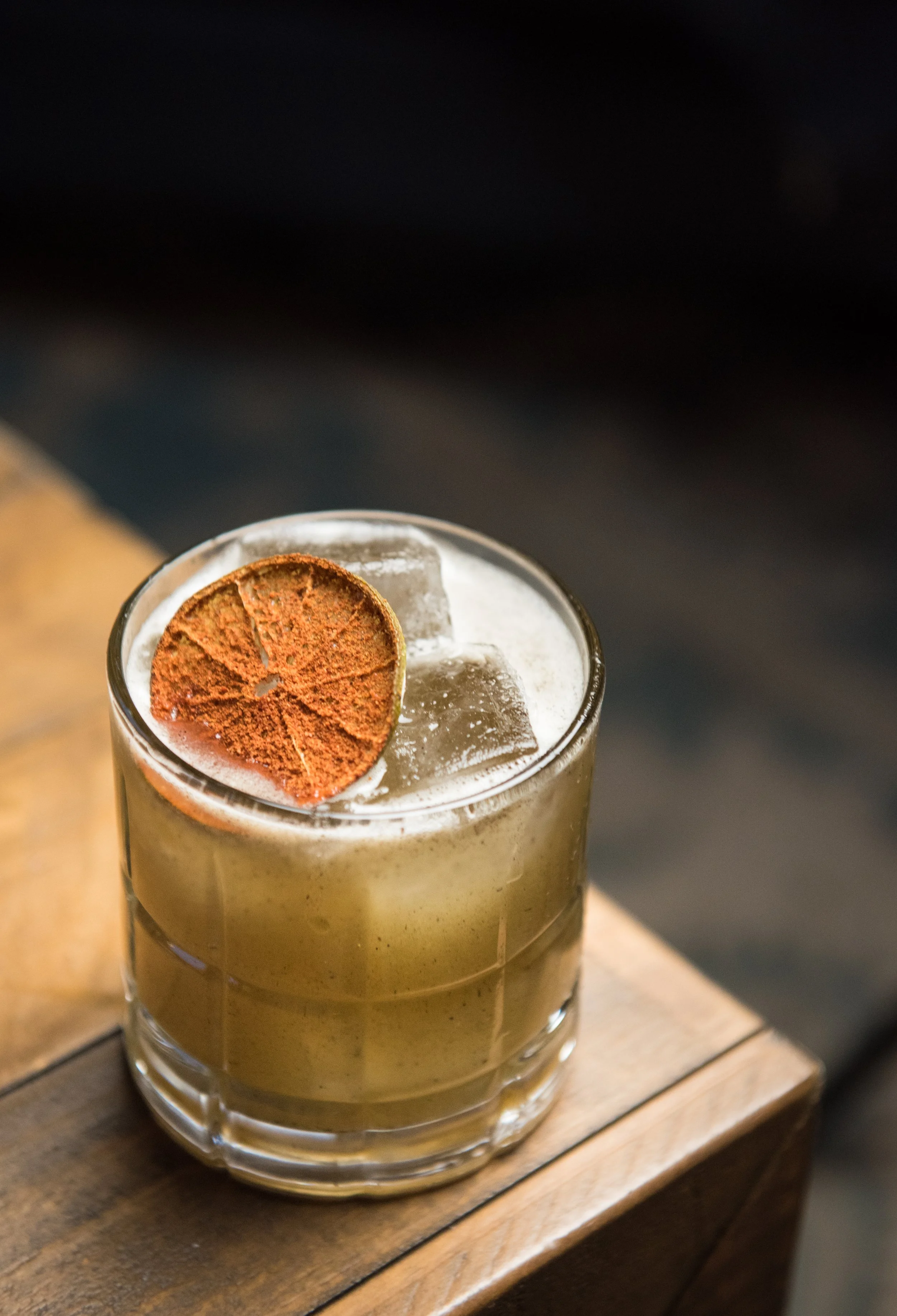 Revenge of the Line: El Silencio Mezcal, Grilled Pineapple Syrup, Yellow Chartreuse, Lemon, and Chile Lime Wheel