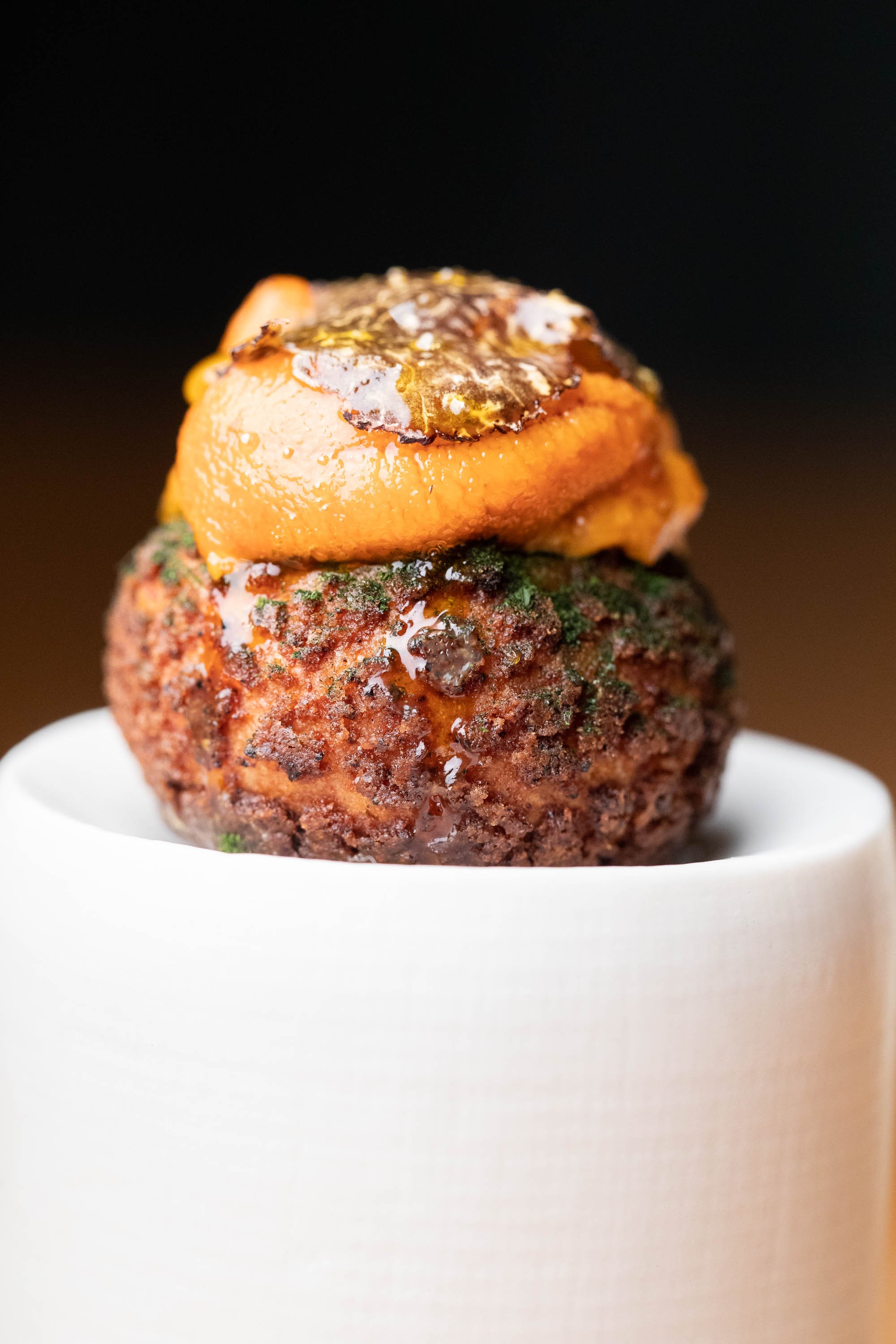 Sea Urchin Cream Puff, Caramelized Miso, Fermented Shiitake, and Sonoma Black Truffle