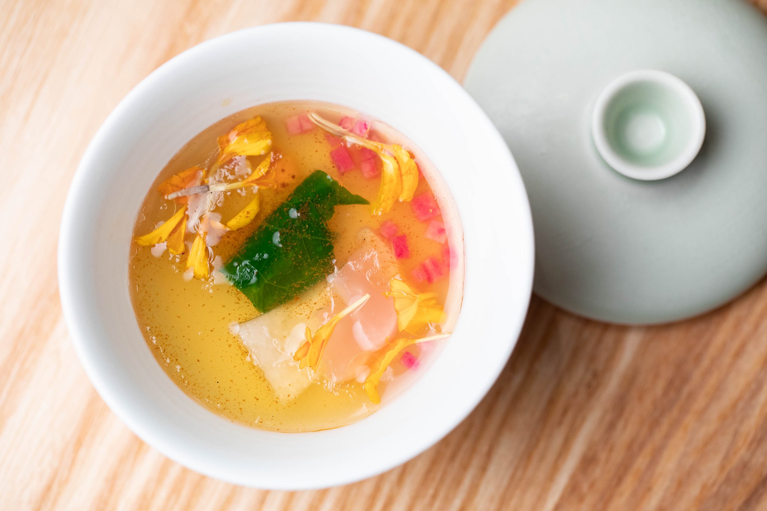 Creek-raised Trout Trio: Cured and Cedar-smoked; Skin, Roe, Spine Meat, and Horseradish Mayonnaise Sandwich; Dried Bones Custard and Aged Radish