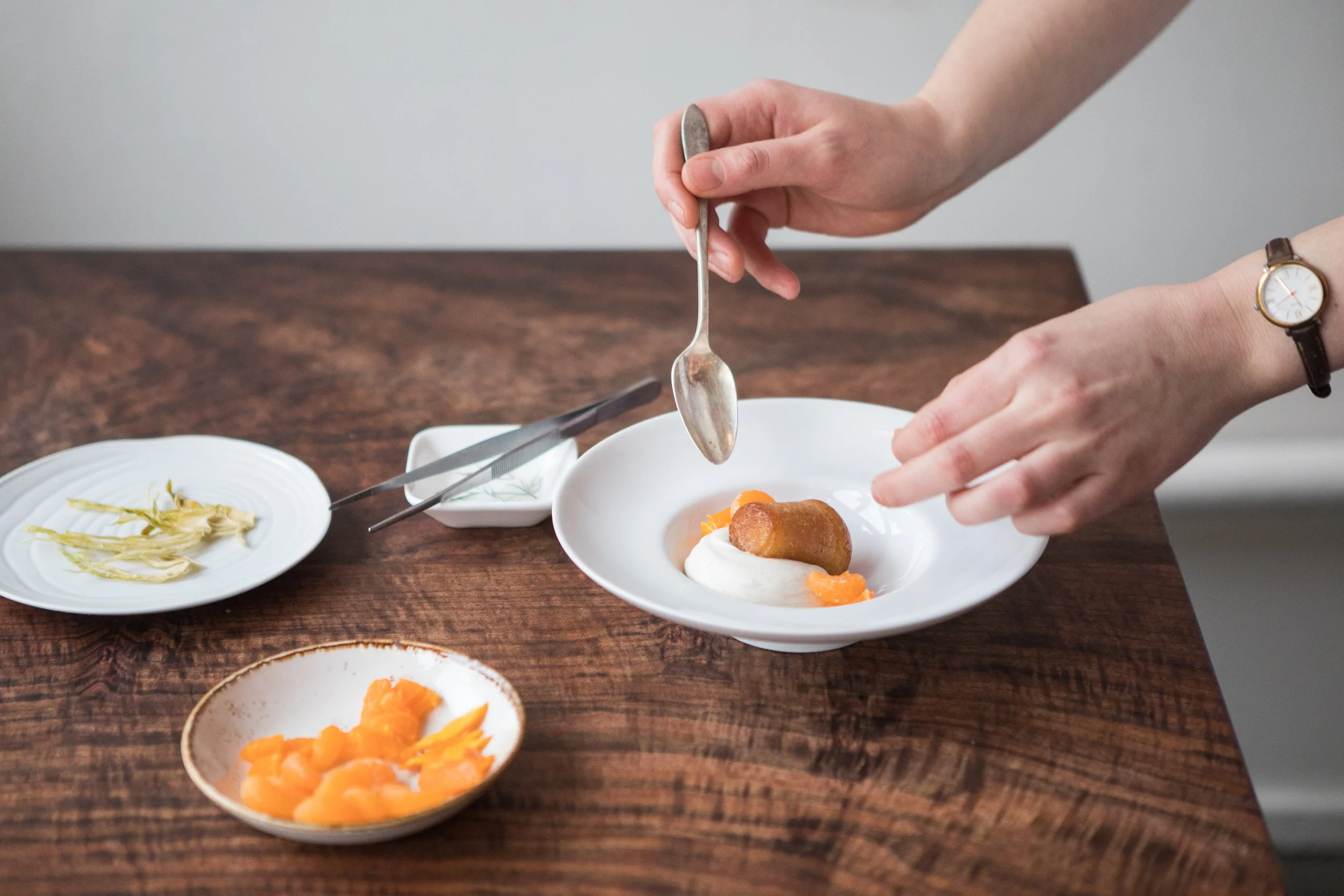 Baba au Rhum: Blood Orange-Mandarinquats-Lemon-Fennel Marmalade, Fennel Seed- Vanilla Cream, and Fennel Chip