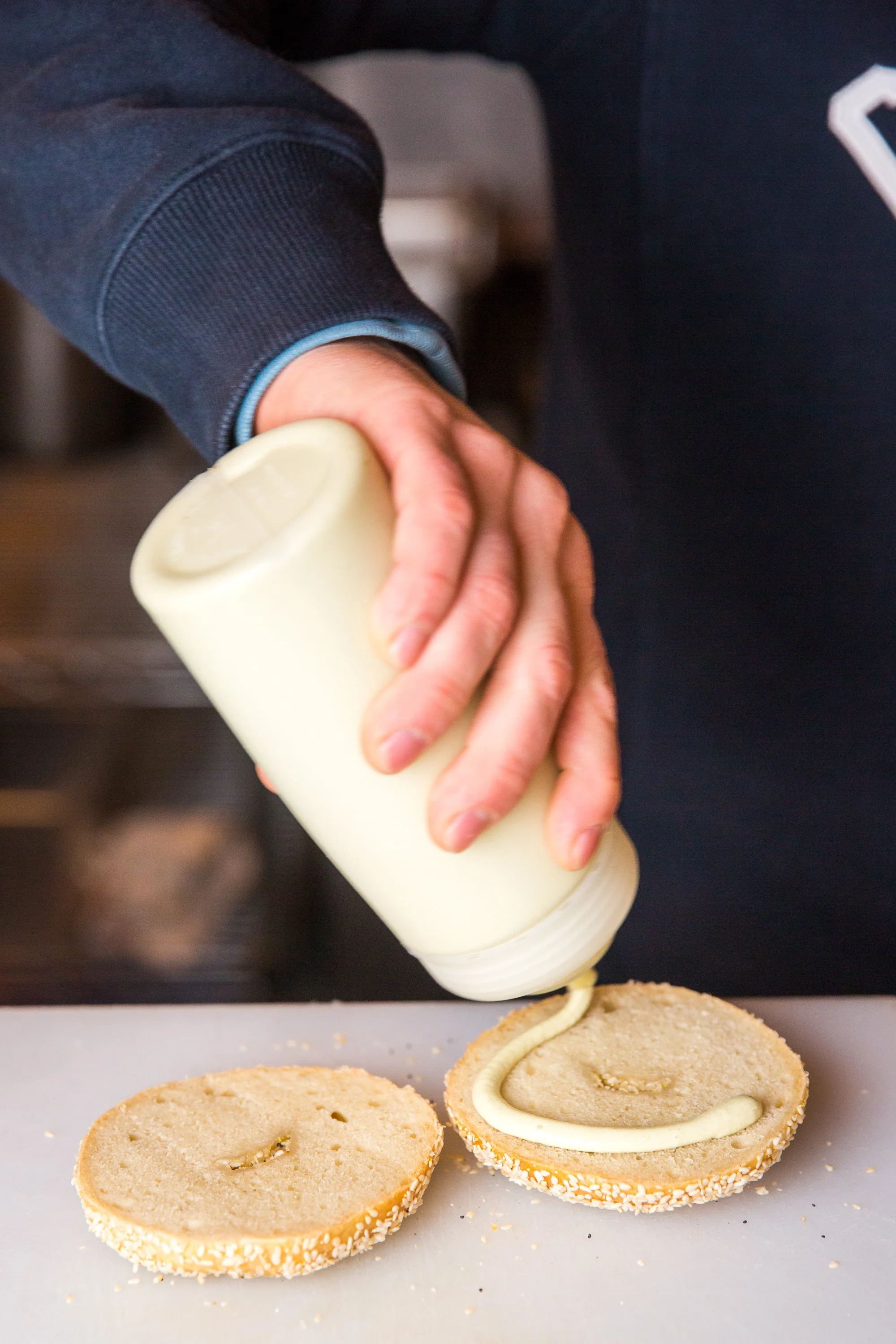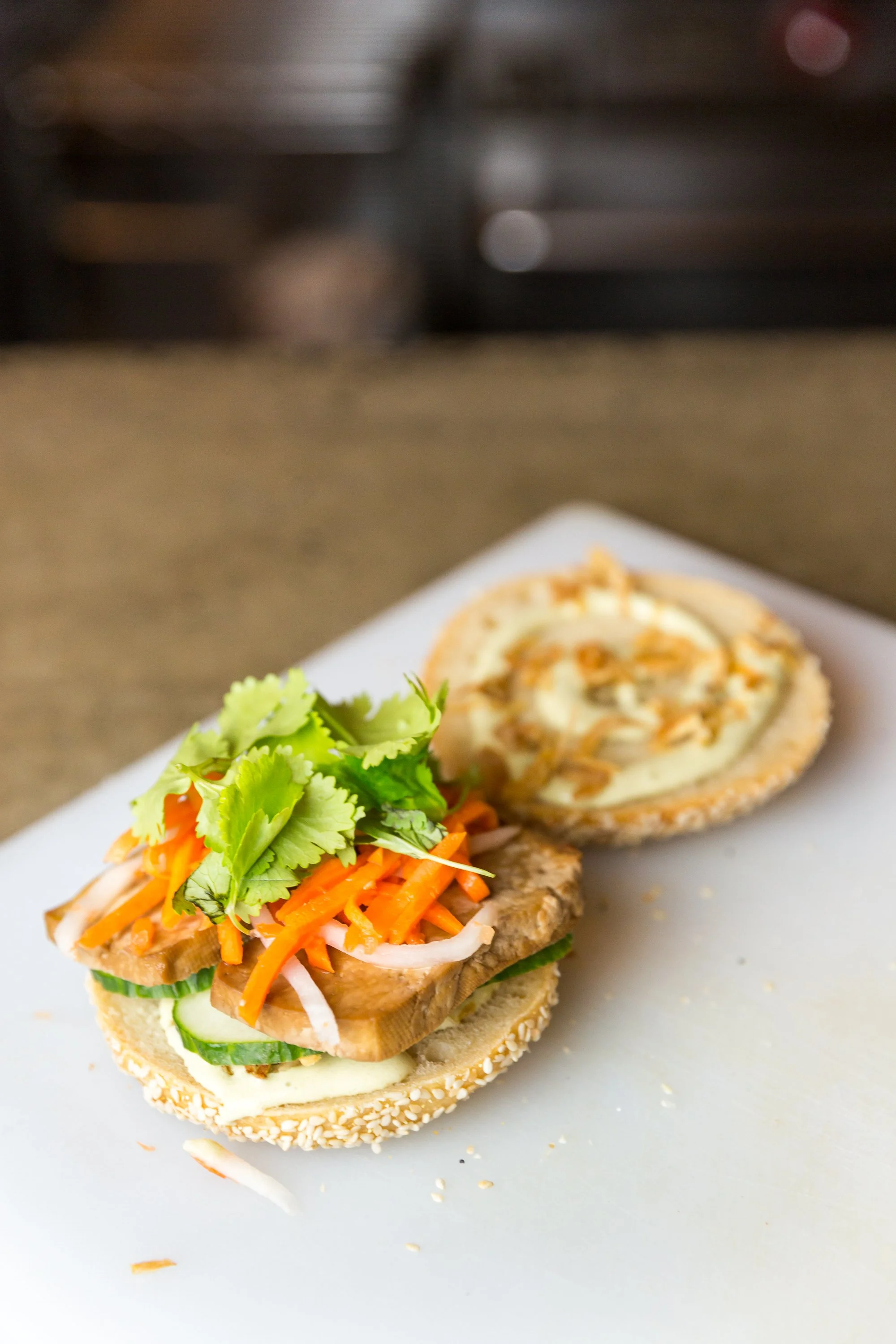 Tofu Banh Mi: Tofu, Cucumber, Pickled Carrot, Radish, Jalapeño-Lime “Mayo,” and Fried Shallots on a Bagel