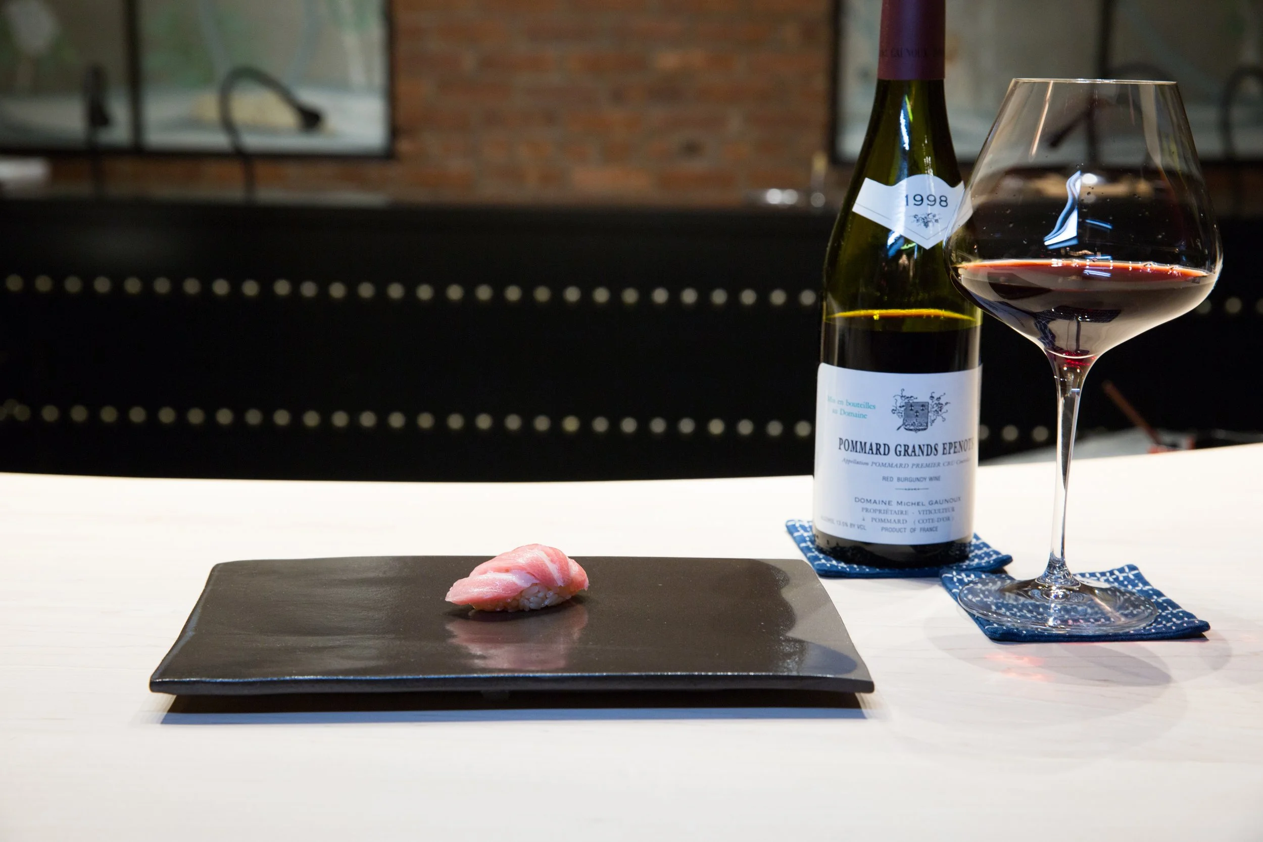 Tuna Nigiri paired with Pinot Noir, Domaine Michel Gaunoux, Pommard 1er Cru, Les Grands Épenots, Côte de Beaune, Burgundy, France, 1998