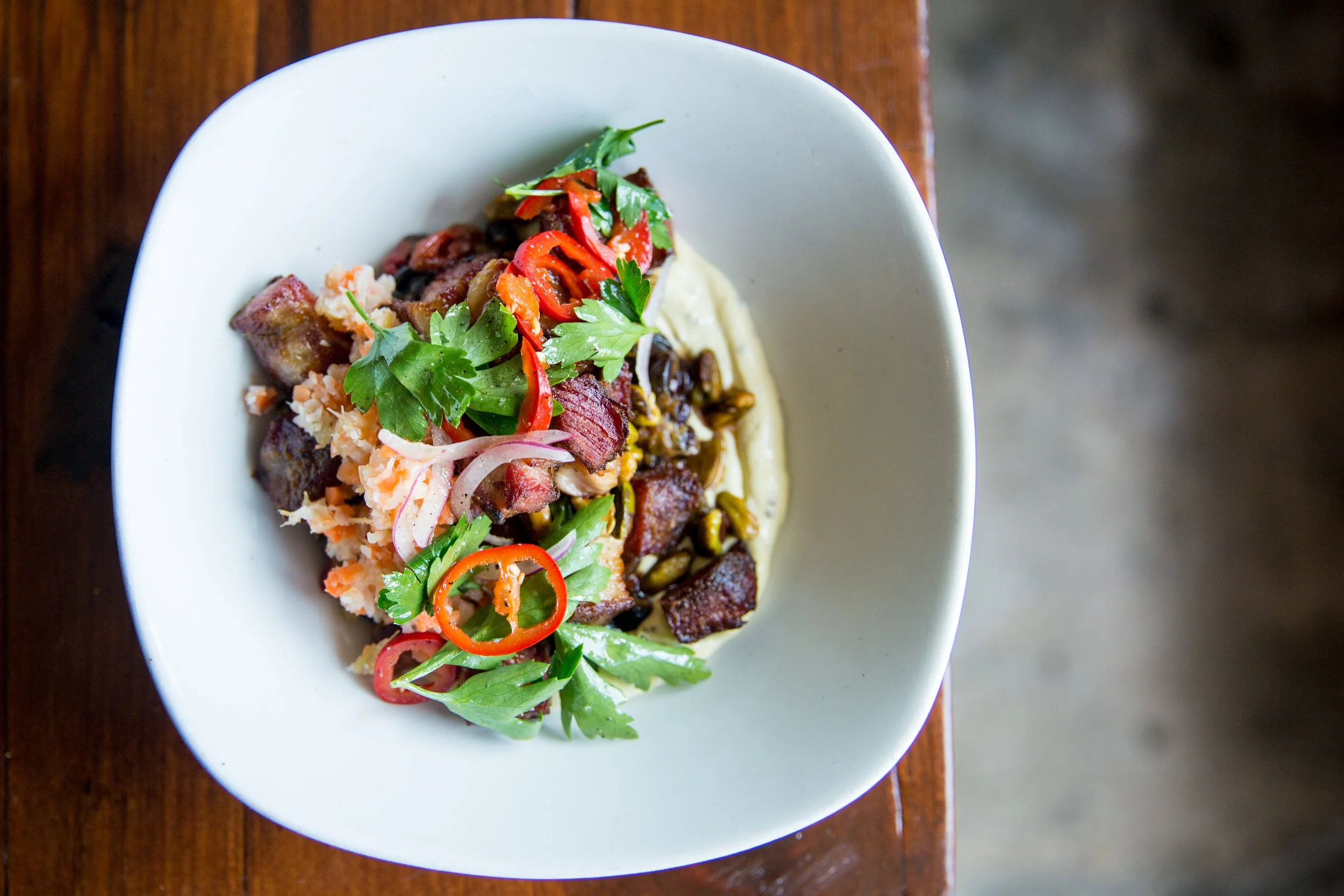 Crisp Lamb Belly, Caponata, Pistachio, Herbs, and Giardiniera