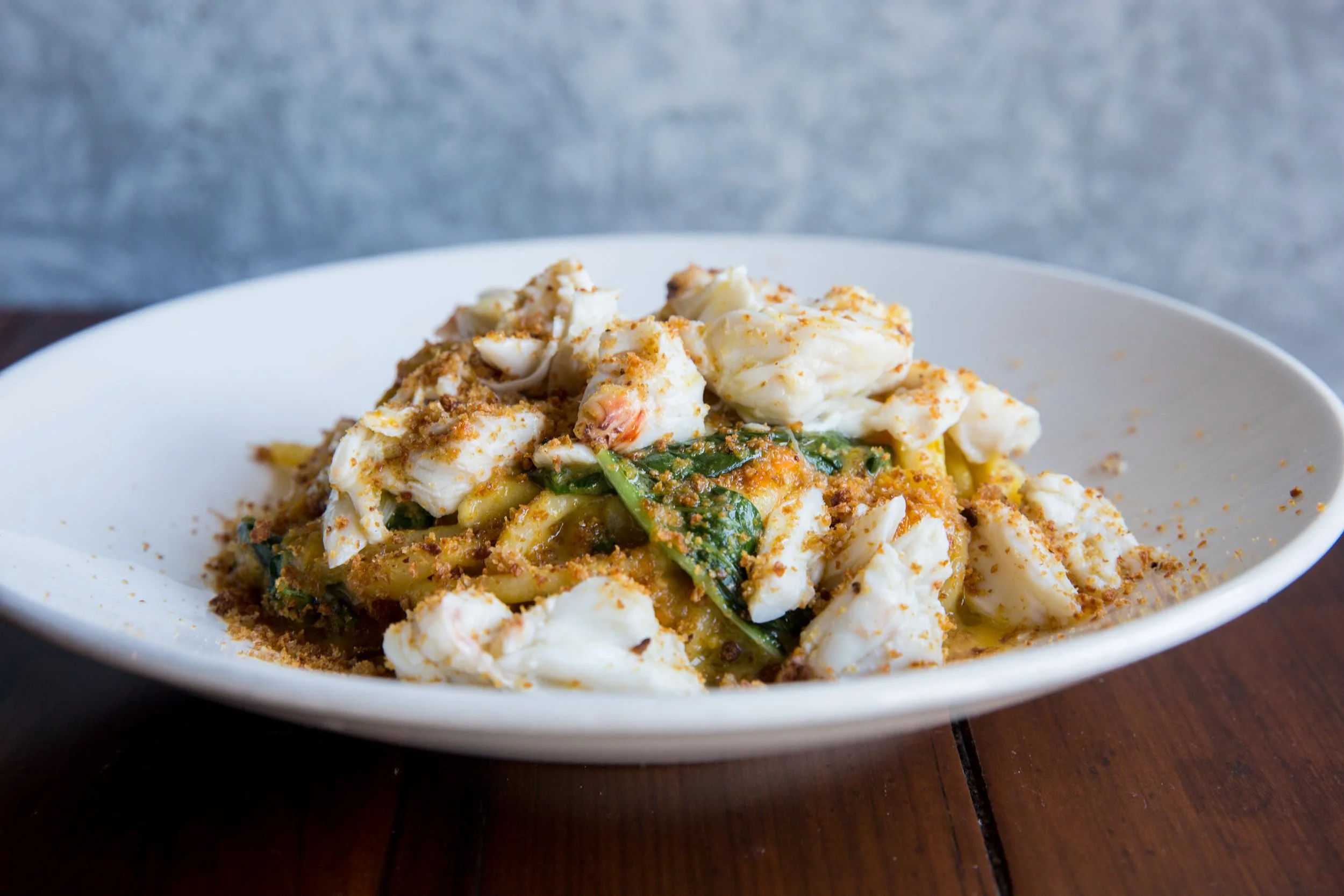 Spaghetti, Squash Blossoms, Garlic Conserva, Sun Gold Tomatoes, Baja Blue Crab, and Sicilian Oregano