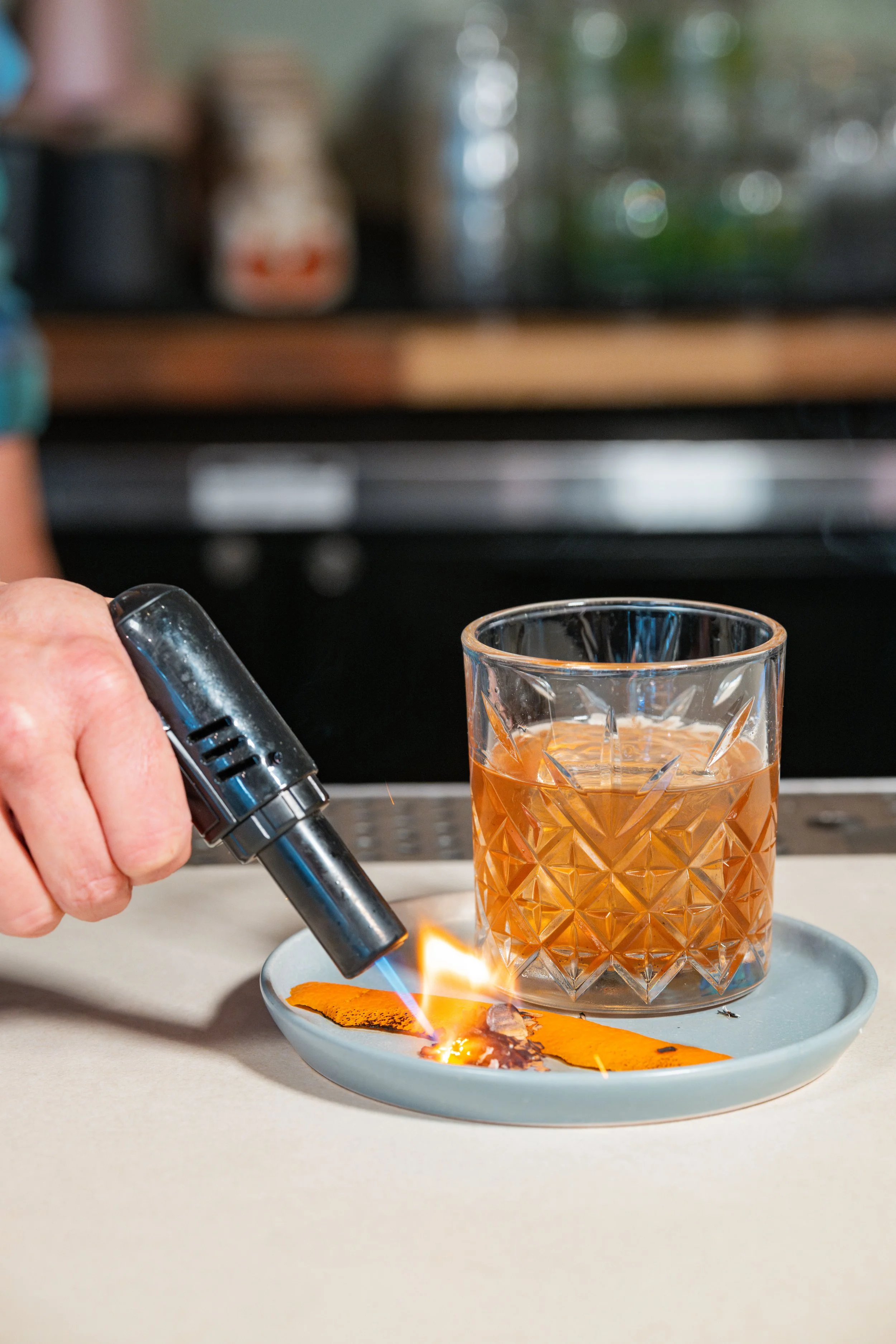 Paper and Ash: Mezcal, Amargo Vallet Amaro, Vanilla-Applewood Syrup, Orange Peel, Applewood Chips
