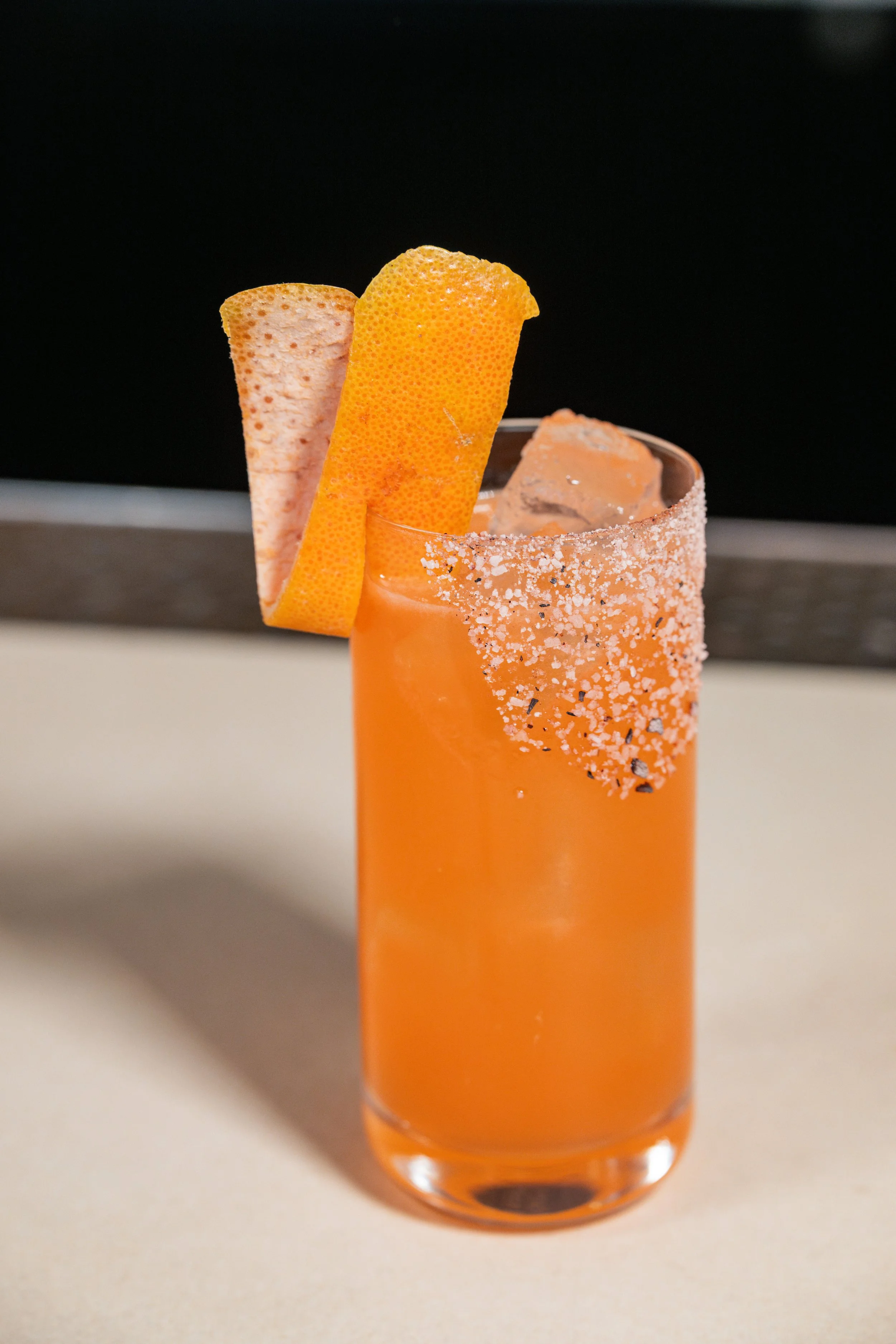 Paloma: Blanco Tequila, Aperol, Grapefruit Shrub, Agave Syrup, Grapefruit Juice, Lime Juice, Grapefruit Soda, Hibiscus Salt, Grapefruit Peel