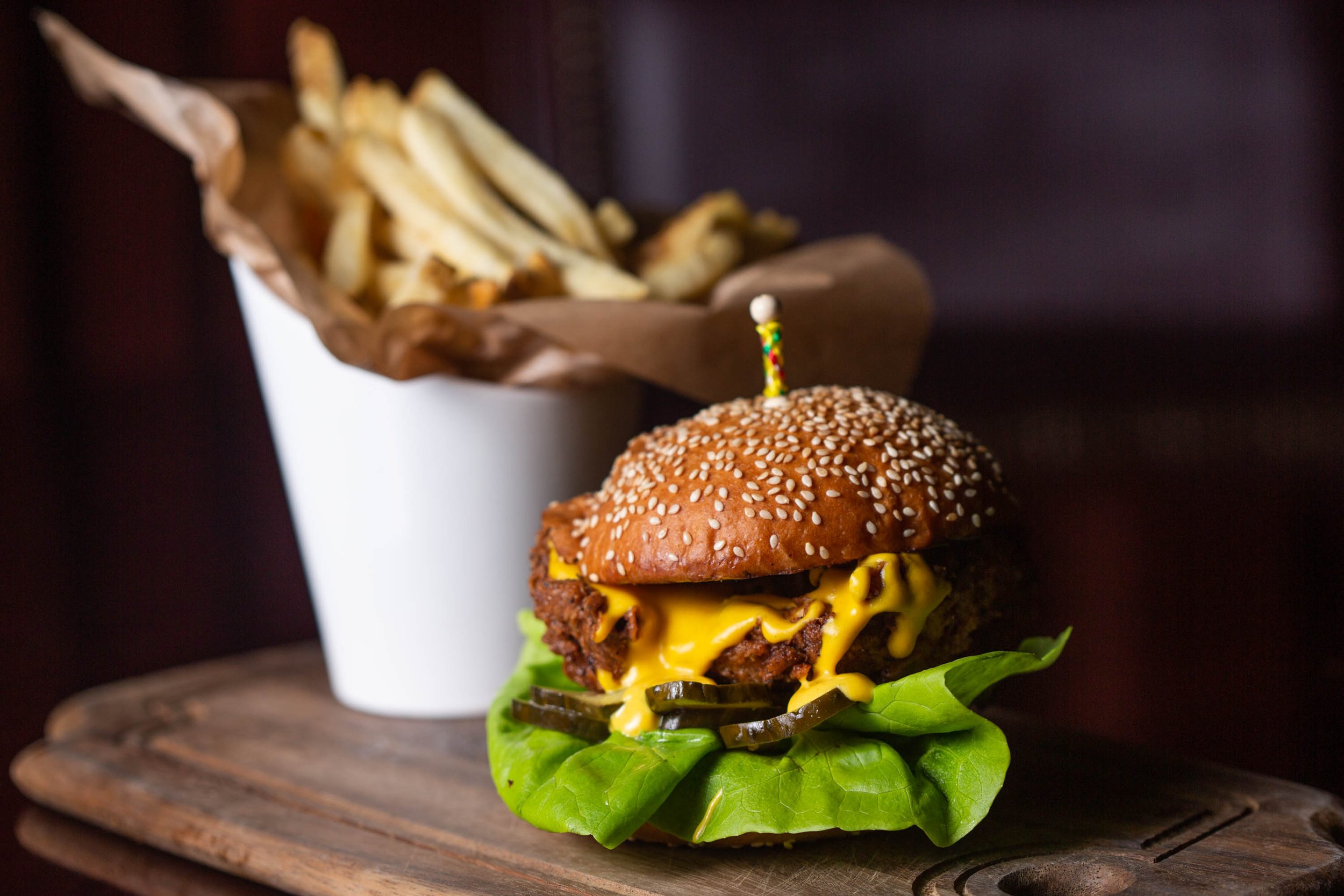 Fried Chicken Sandwich: Fried Chicken Thigh, Butter Lettuce, Pickles, Huancaina Sauce, and Brioche Bun
