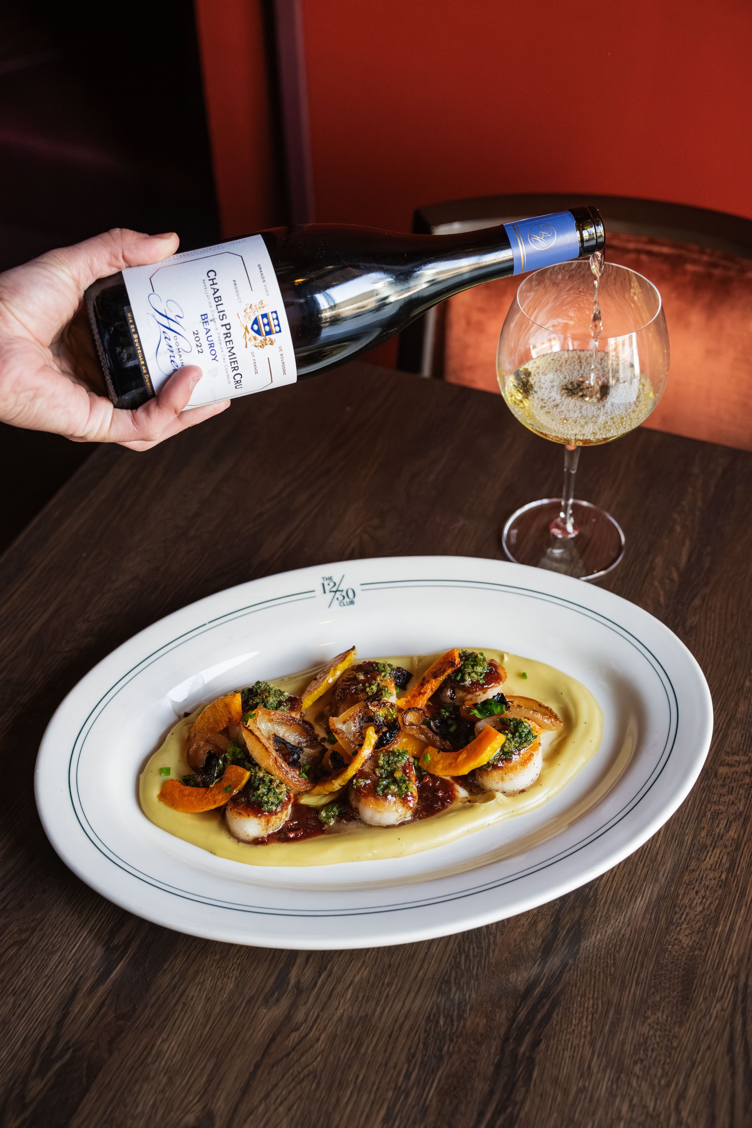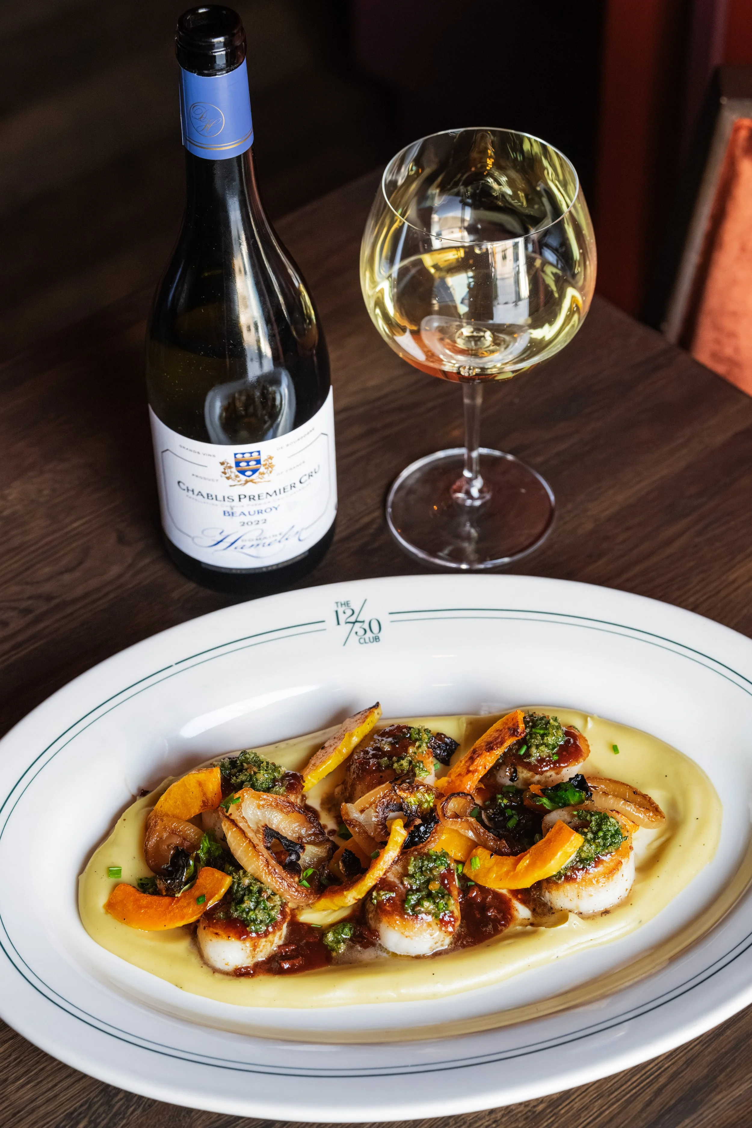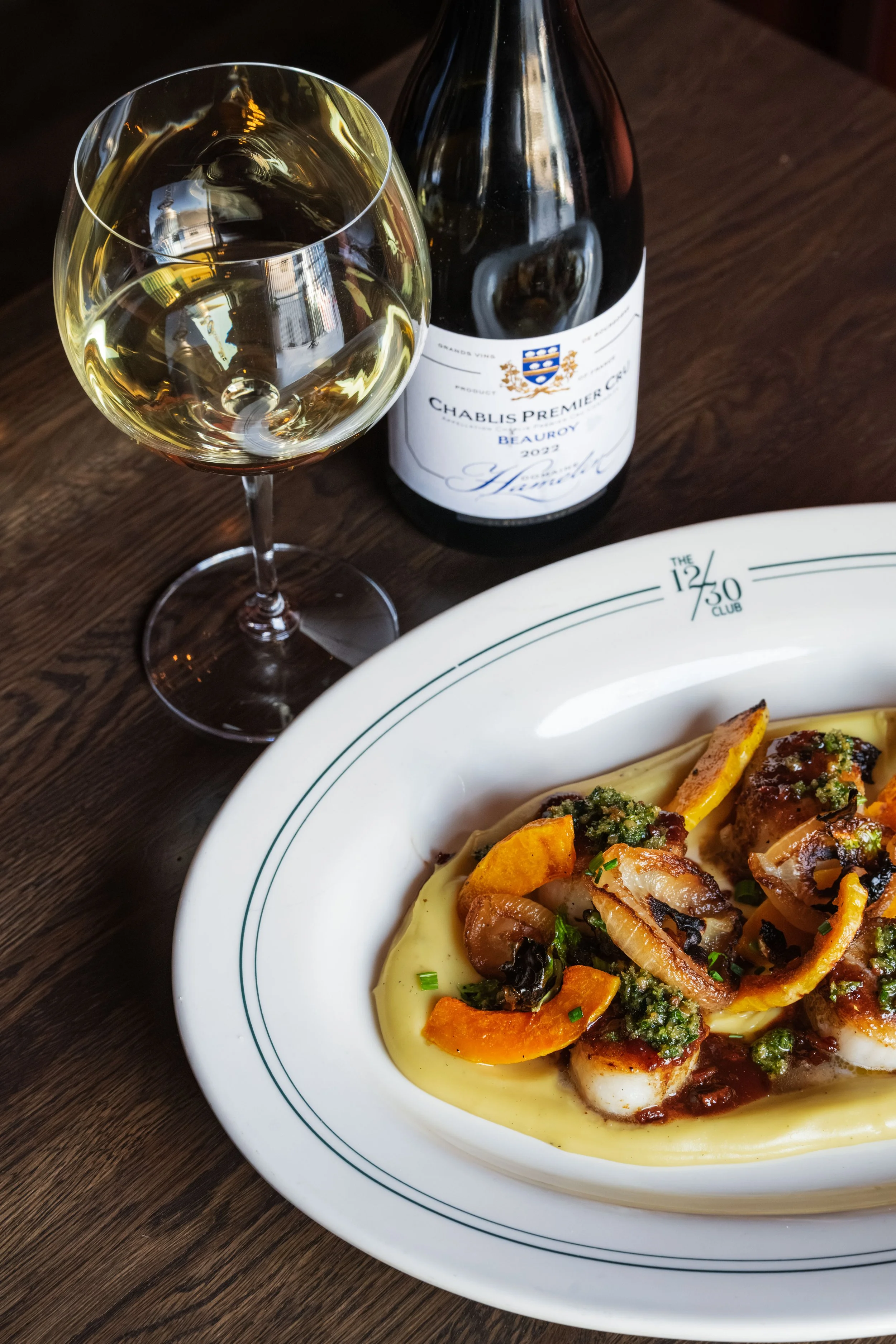 Scallops, Whipped Japanese Sweet Potatoes, Butternut Squash, Sautéed Onions, Bacon Jus, Pine Nut Gremolata paired with Chardonnay, Domaine Hamelin, Chablis Premier Cru Beauroy, Burgundy, France, 2022