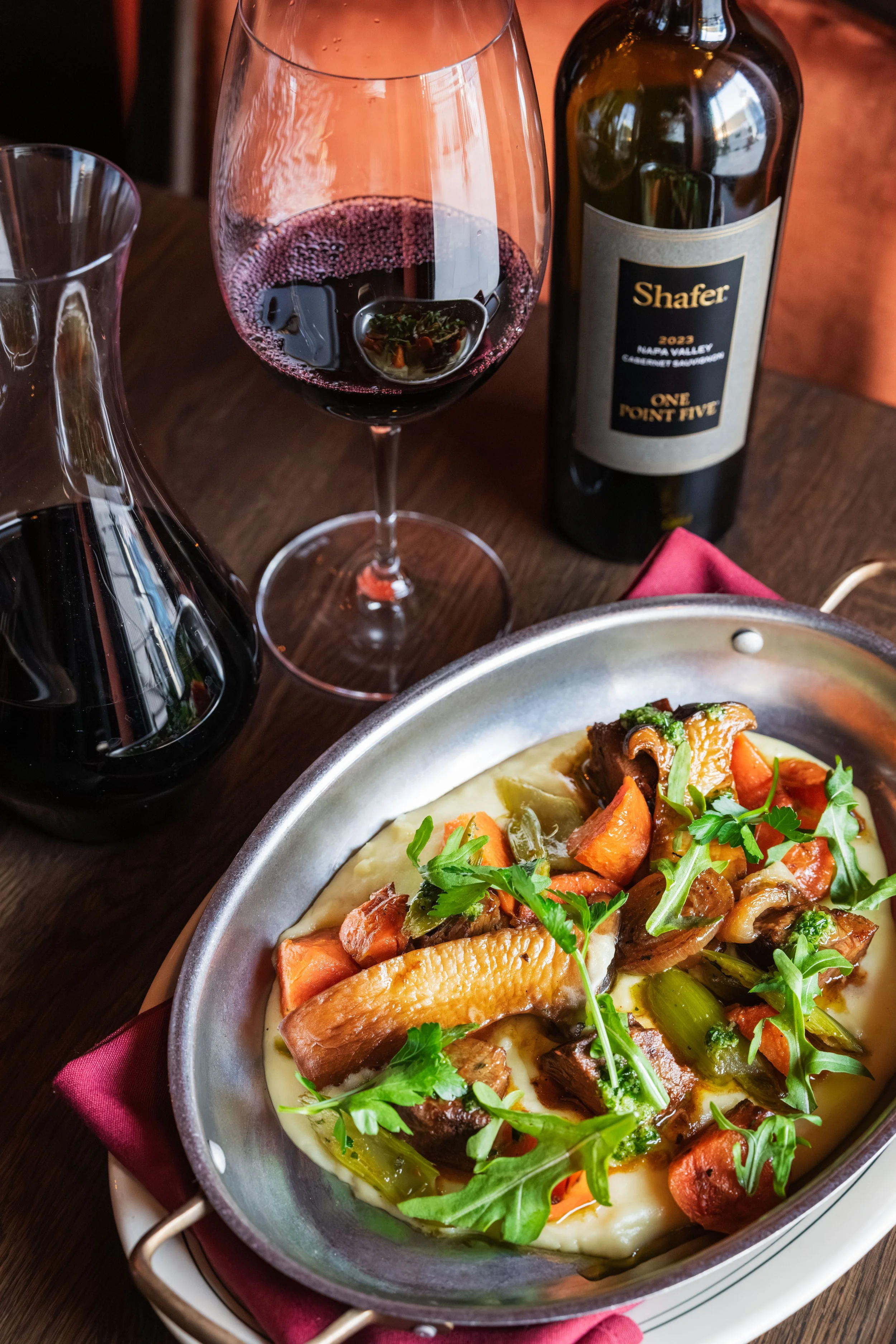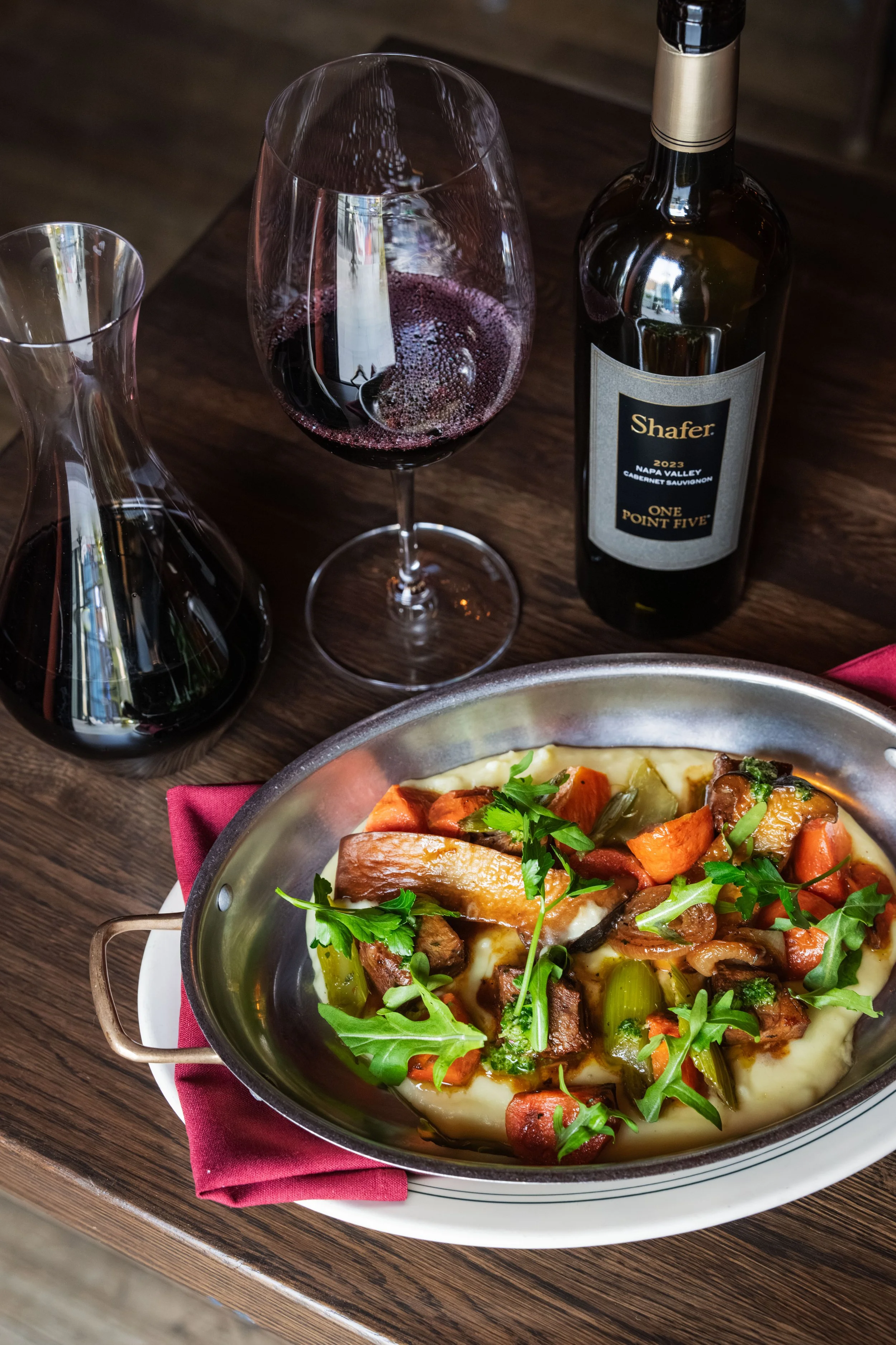 Beef Short Ribs, Whipped Potatoes, Roasted Mirepoix, Red Wine Barbecue Sauce, Herbs paired with Cabernet Sauvignon, Shafer, One Point Five, Napa Valley, California, 2023