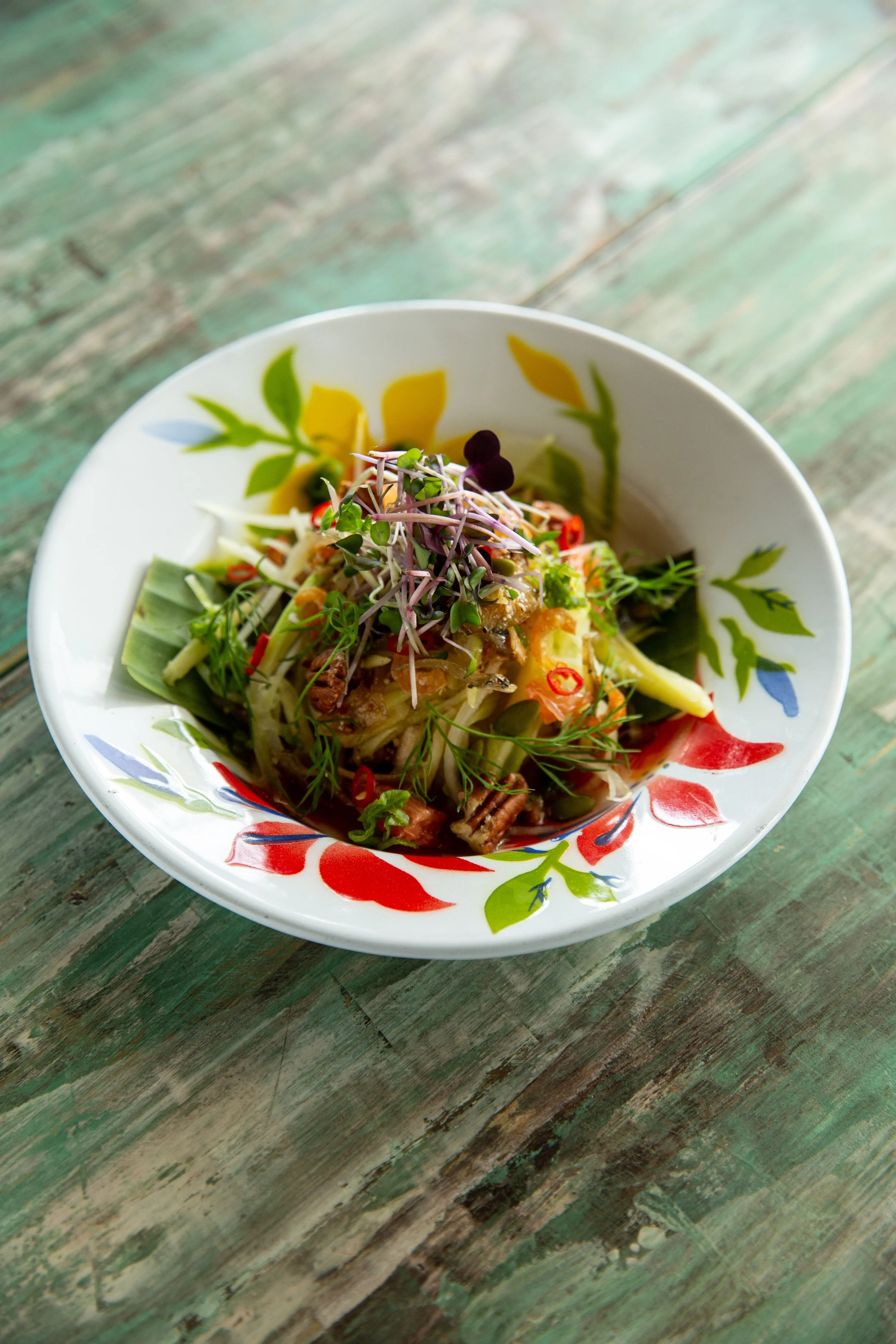 Mango Salad: Unripe Mango and Papaya, Caramelized Fish Sauce, Dried Shrimp, Fried Anchovies, Pecans, Grapefruit, Dill