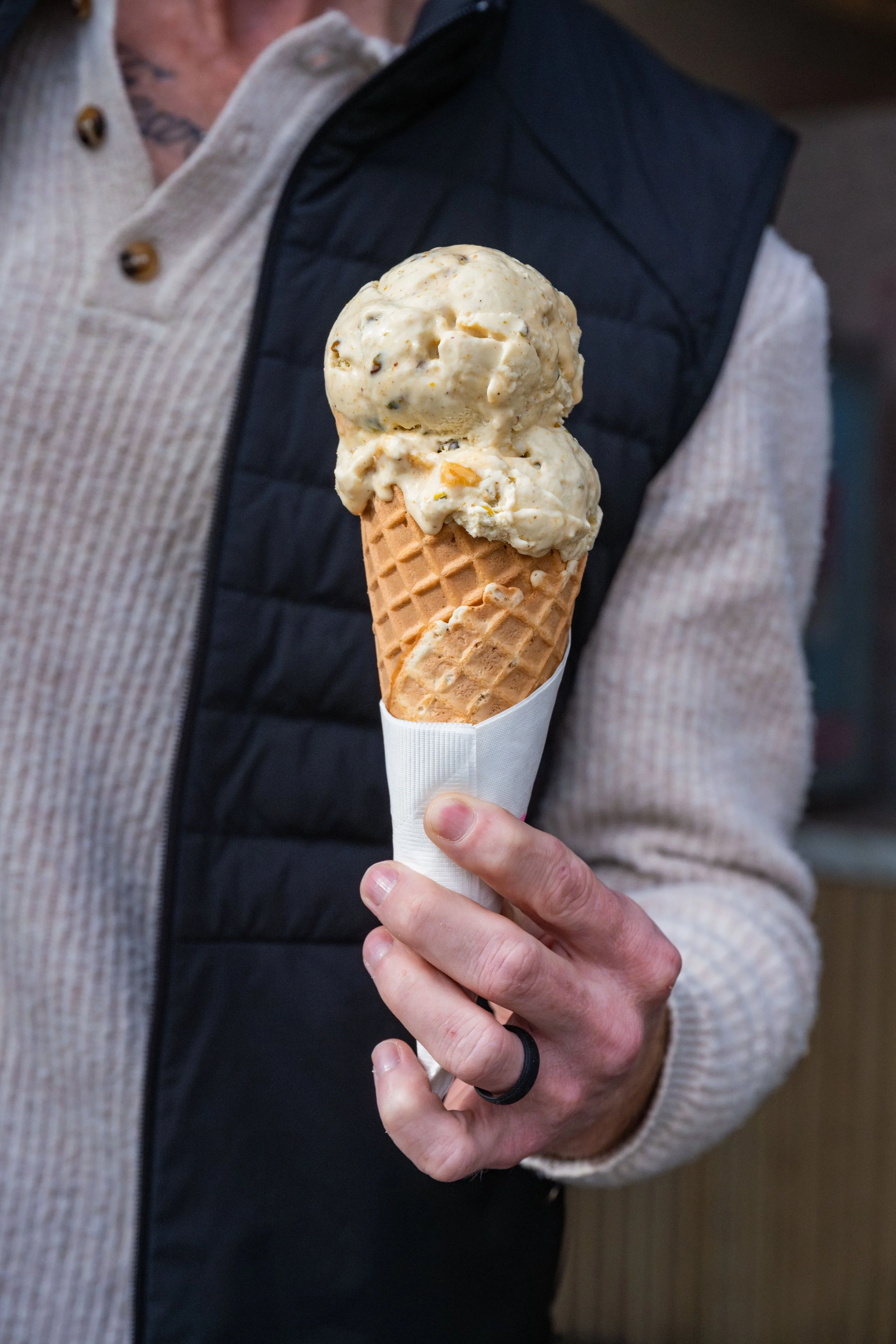 Ice Cream Flight: (1) Campfire S’mores: Torched Marshmallow Ice Cream, House Graham Cracker Crumble, Hershey’s Chocolate, Mini Marshmallows; (2) Triple Chocolate Chunk Brownie: Dark Chocolate Ice Cream, Brownies, Brownie Brittle, Chocolate Fudge Swirl; (3) Ube Honeycomb: Ube Ice Cream, Honeycomb Candy; (4) Coffee and Donuts: Coffee Ice Cream, Butter Cake Donuts, Sweet Cream Swirl, Coffee Paste; (5) Waffle Cone Chips