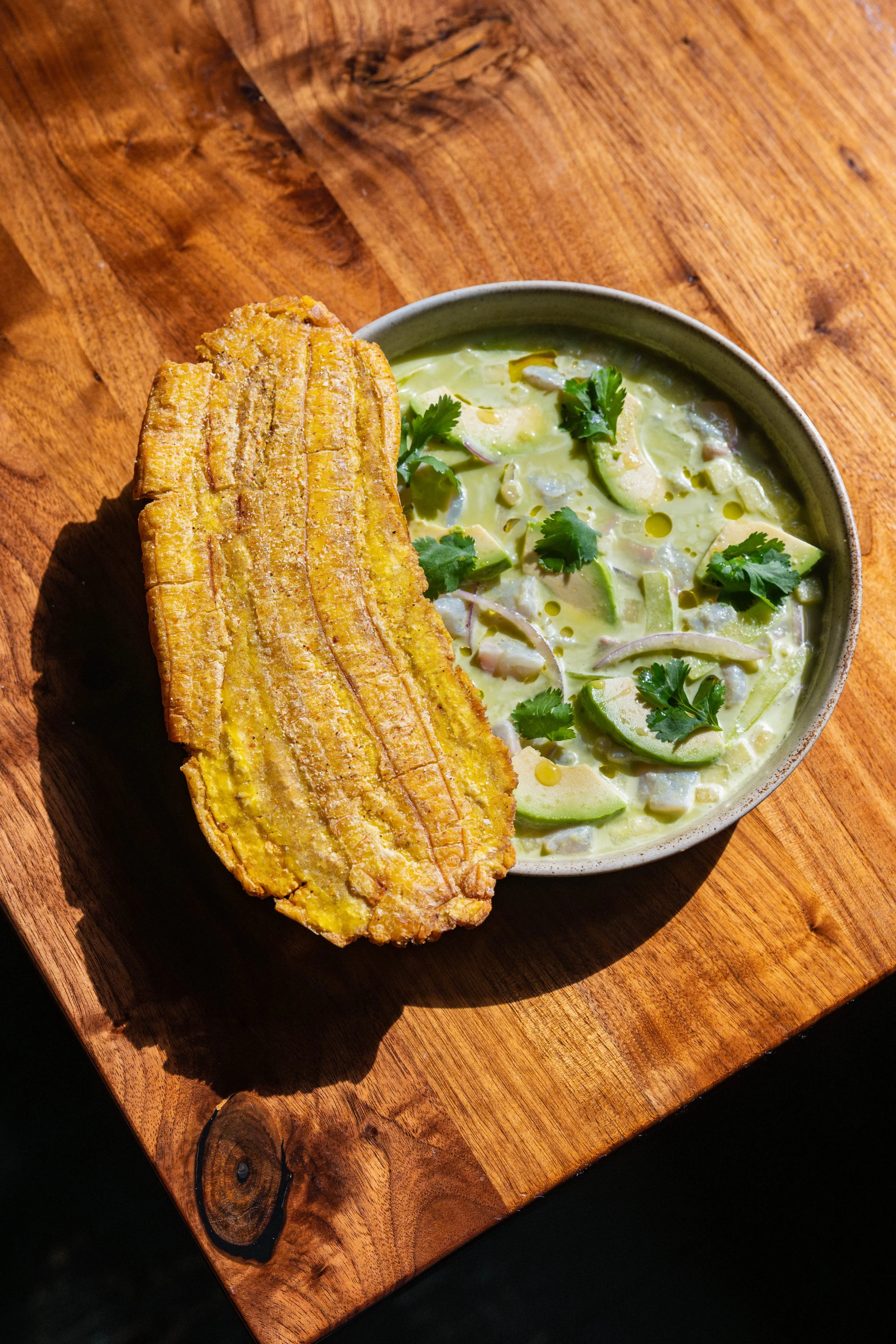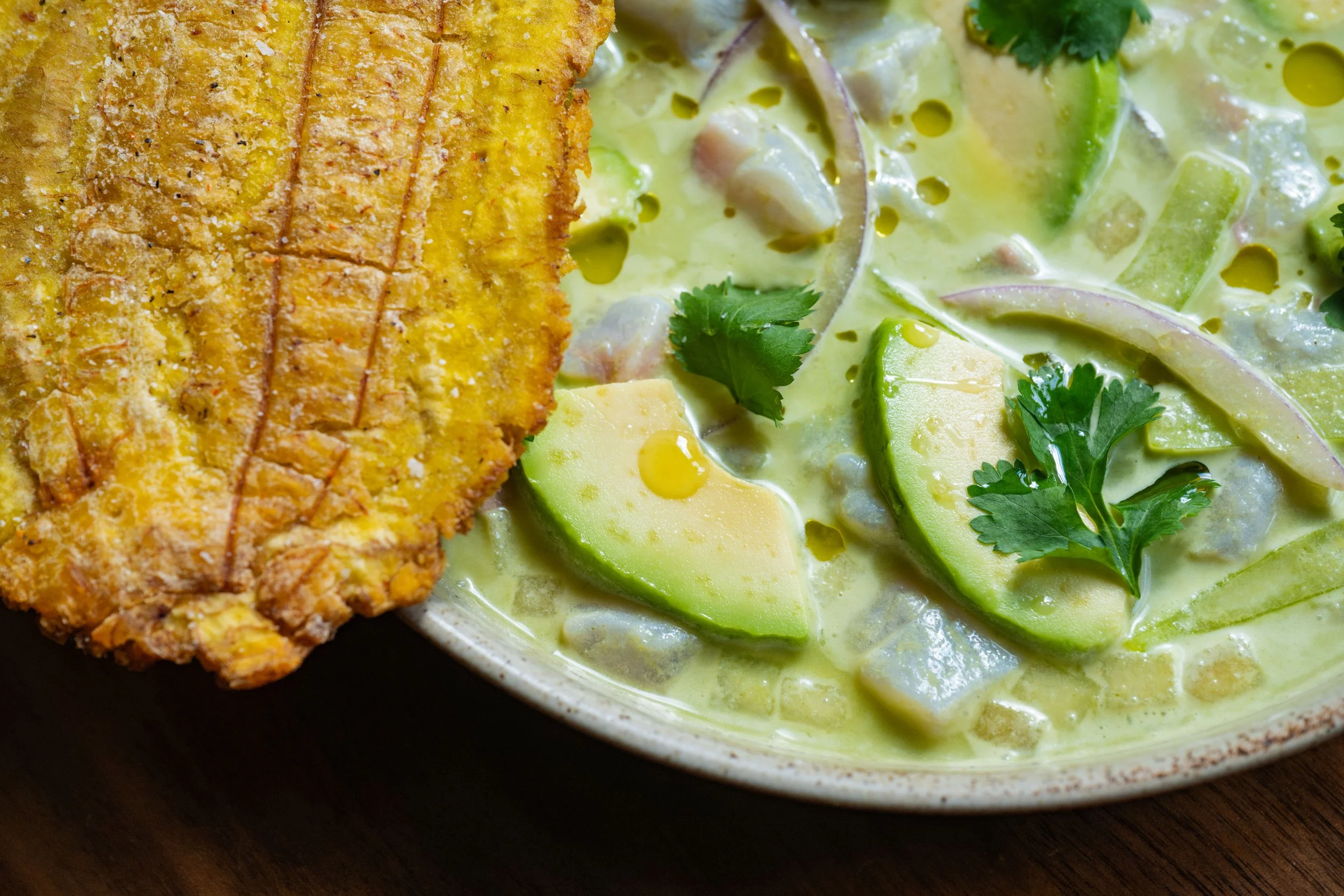Striped Bass Ceviche, Aji Verde, Green Apple, Avocado, Red Onion, Ichimi, Cilantro, Tostone
