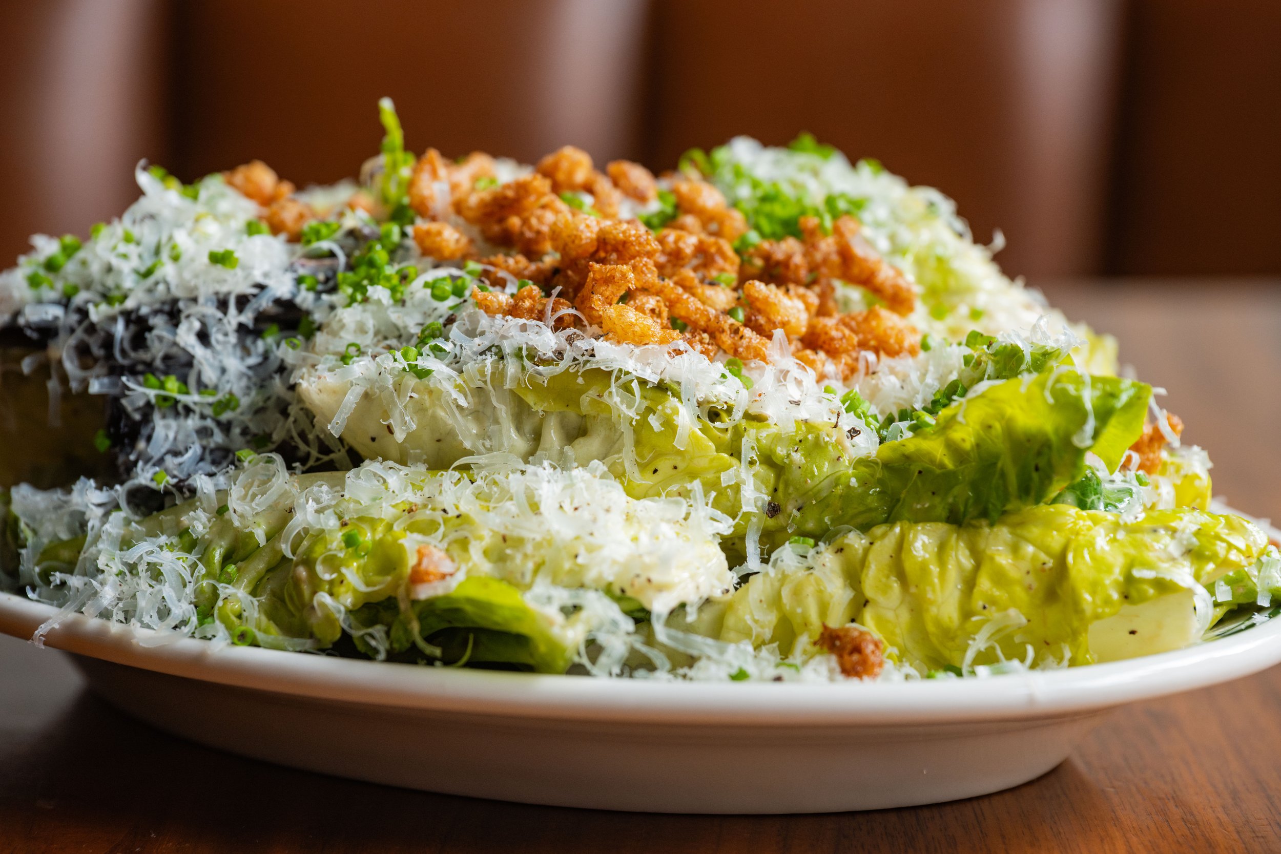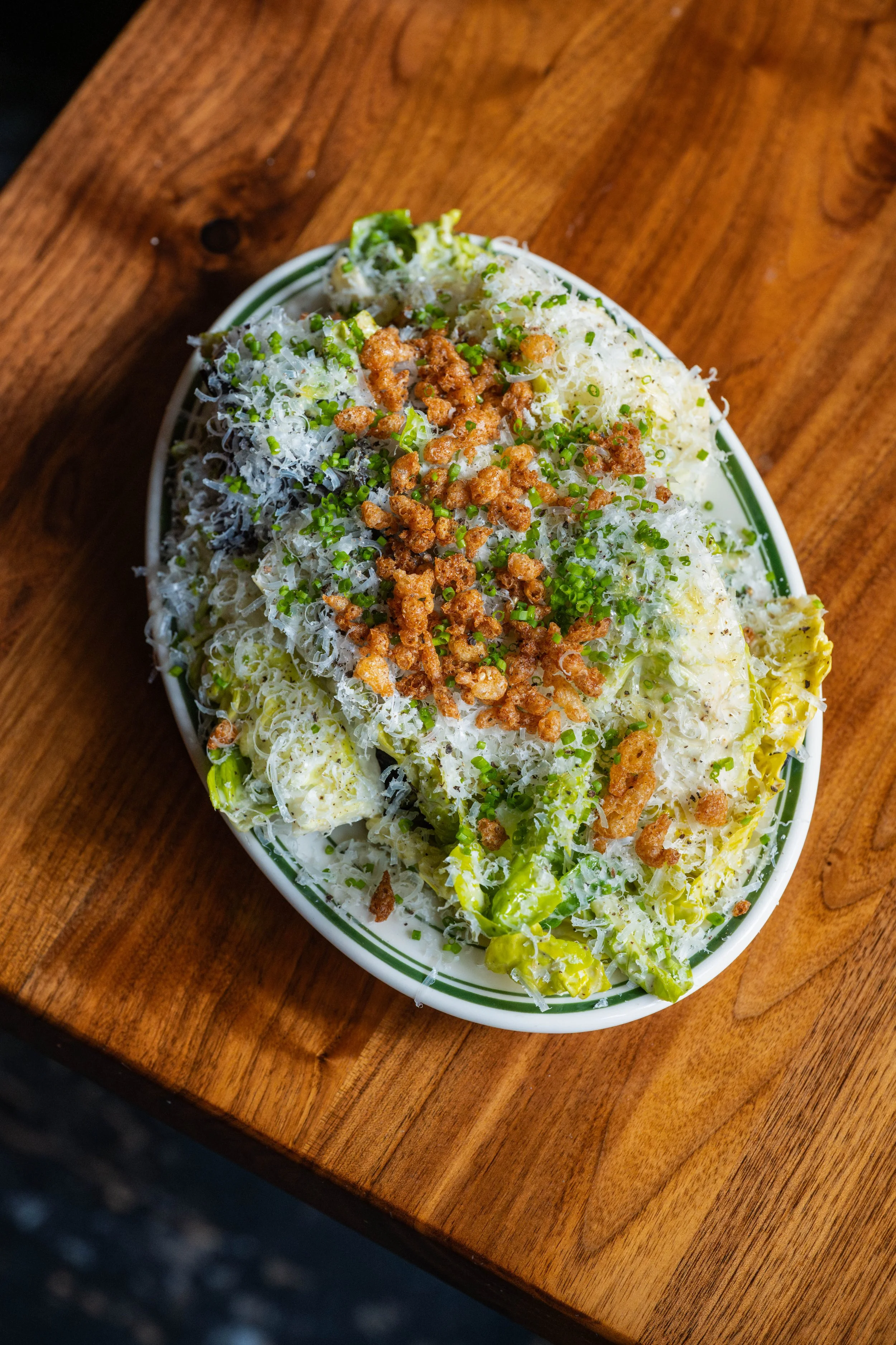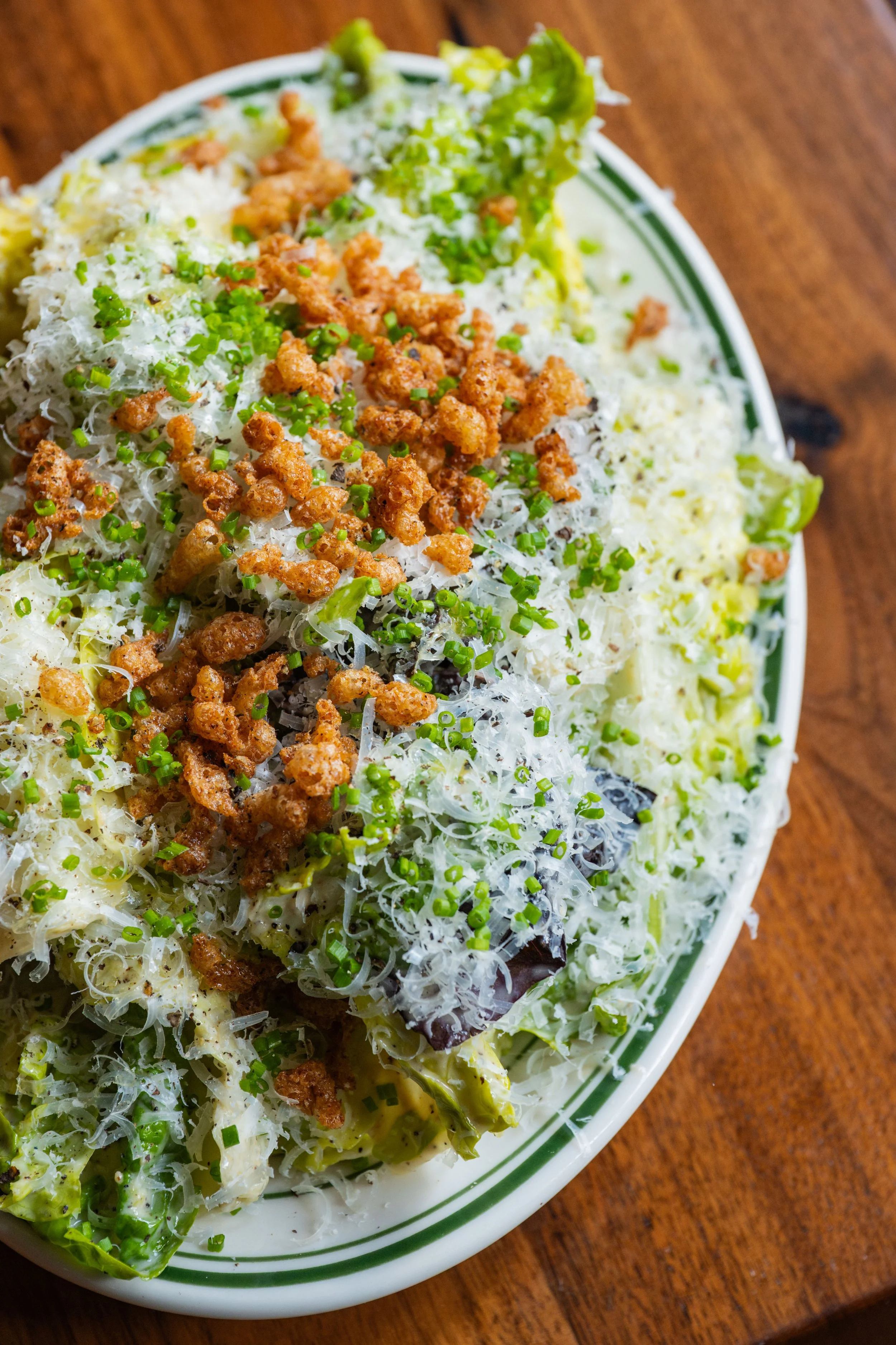 Bacalao Caesar Salad: Little Gem Lettuce, Bacalao Caesar Dressing, Pecorino, Bacalao Crispies, Chives
