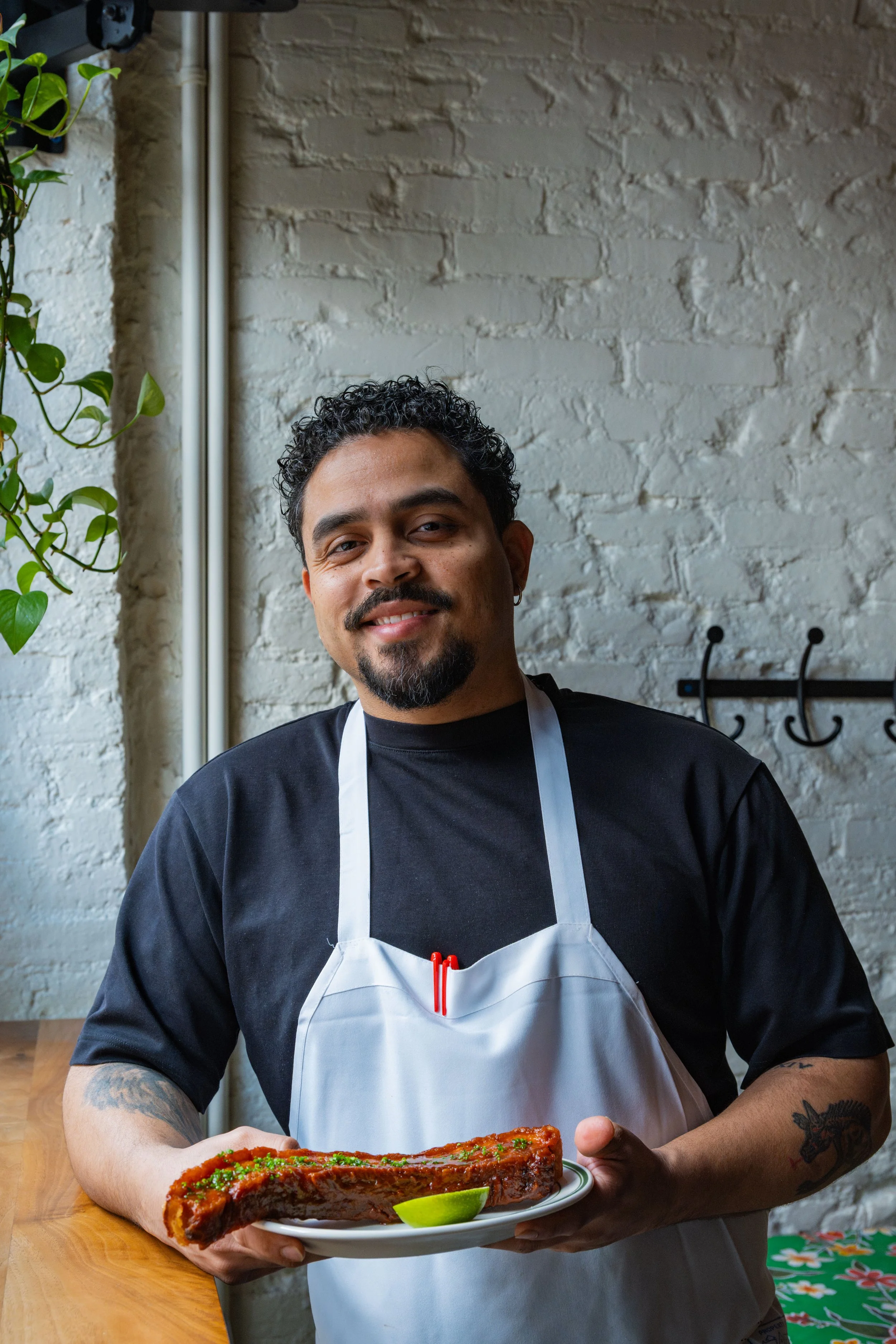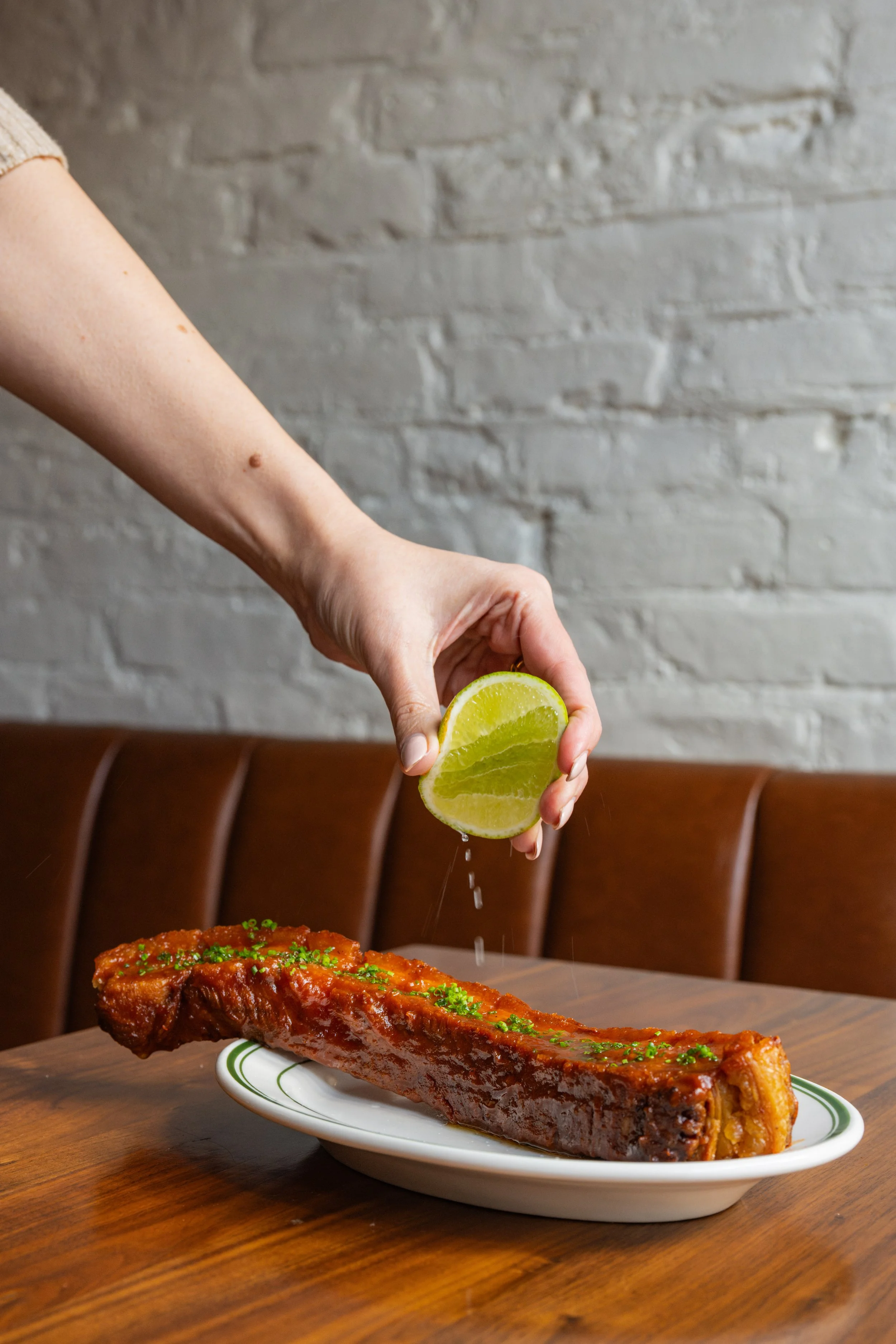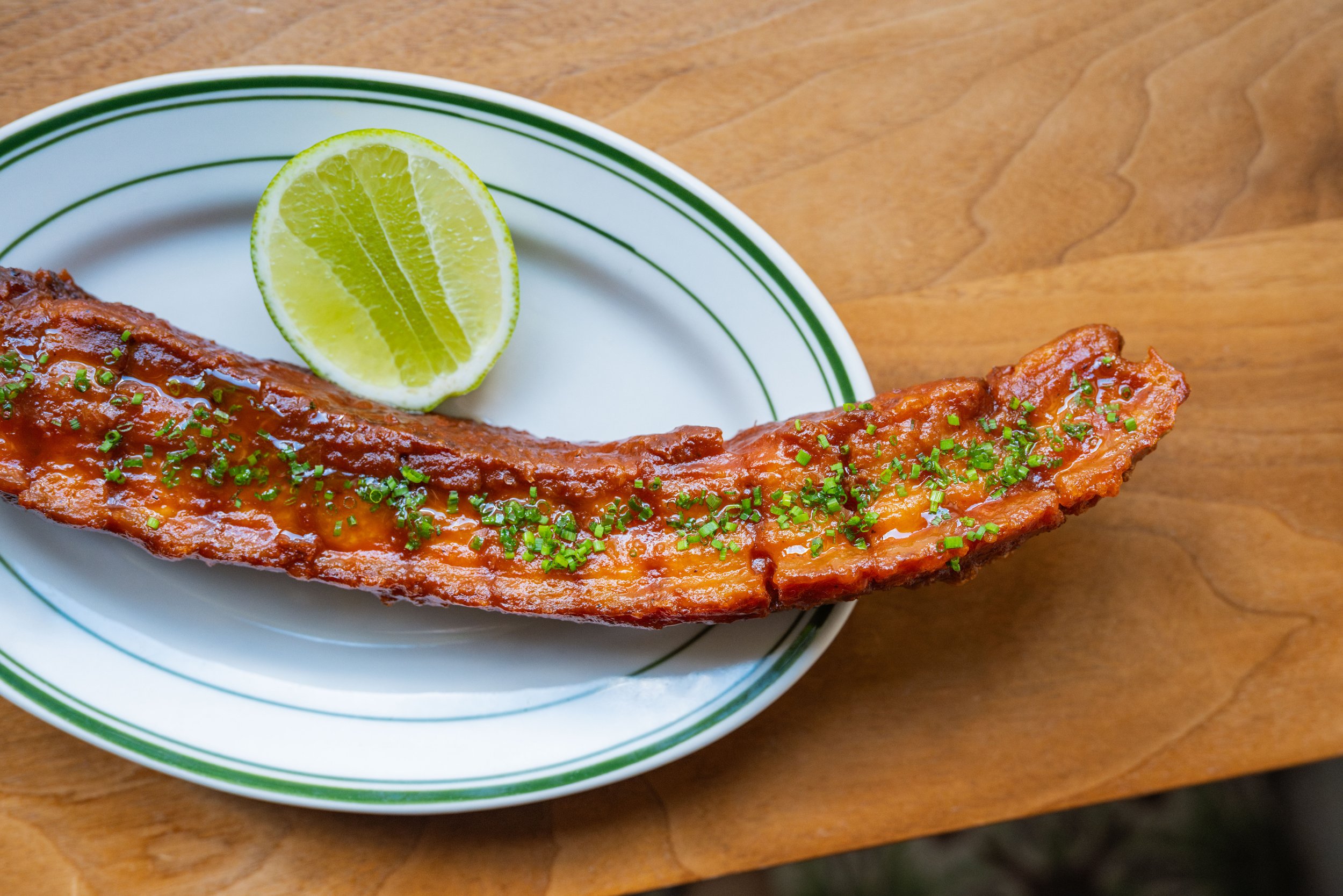 Thrice-Cooked Chicharrón, Guava Barbecue Sauce, Chives