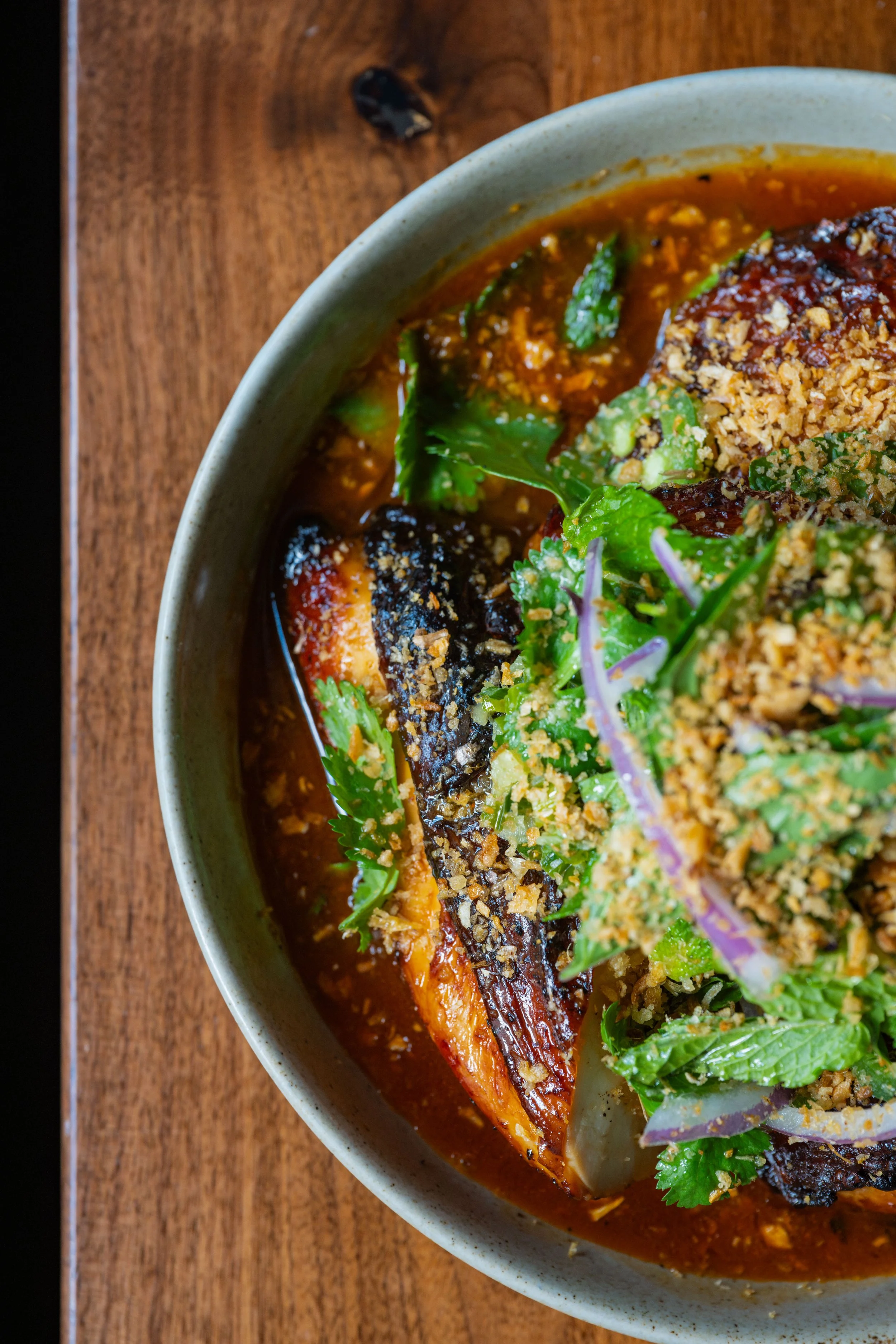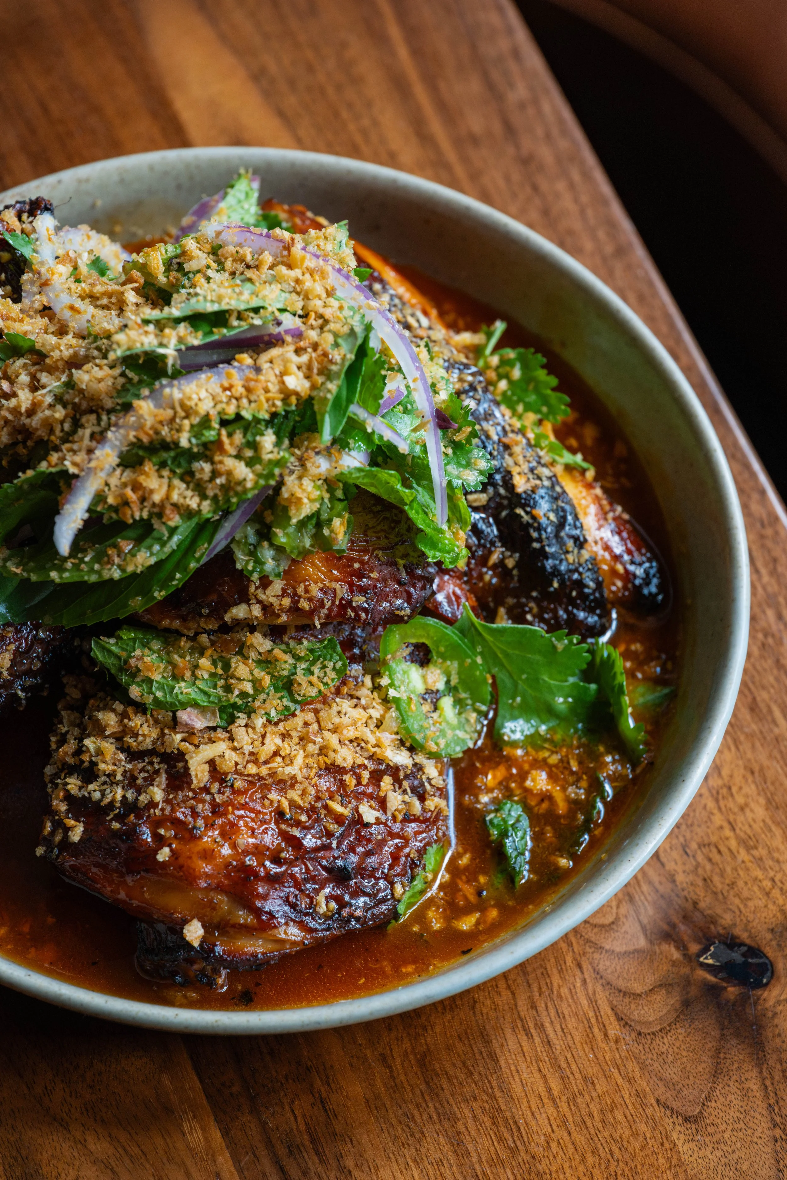 Roasted Drunken Chicken, Ginger-Chive Salsa, Chicken Jus, Fried Shallots, Fried Garlic, Herb Salad