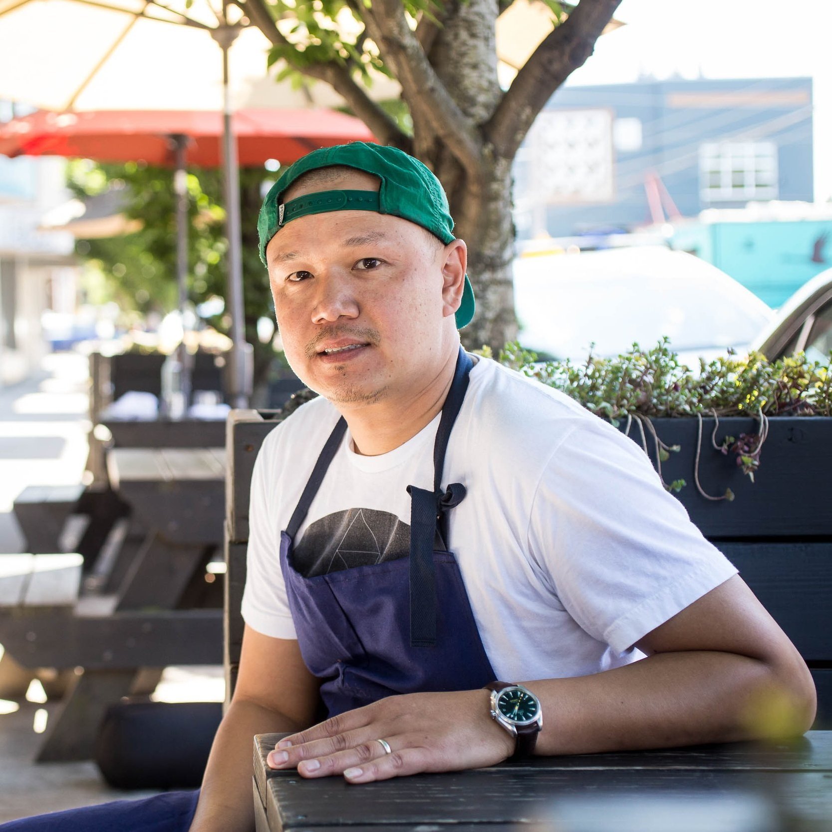 Coconut Water-Compressed Watermelon, Rind Pickled With Cucumber And Chile, Incense-Smoked Shrimp Powder, Fried Shallot, Makrut Lime Leaf, And Cilantro