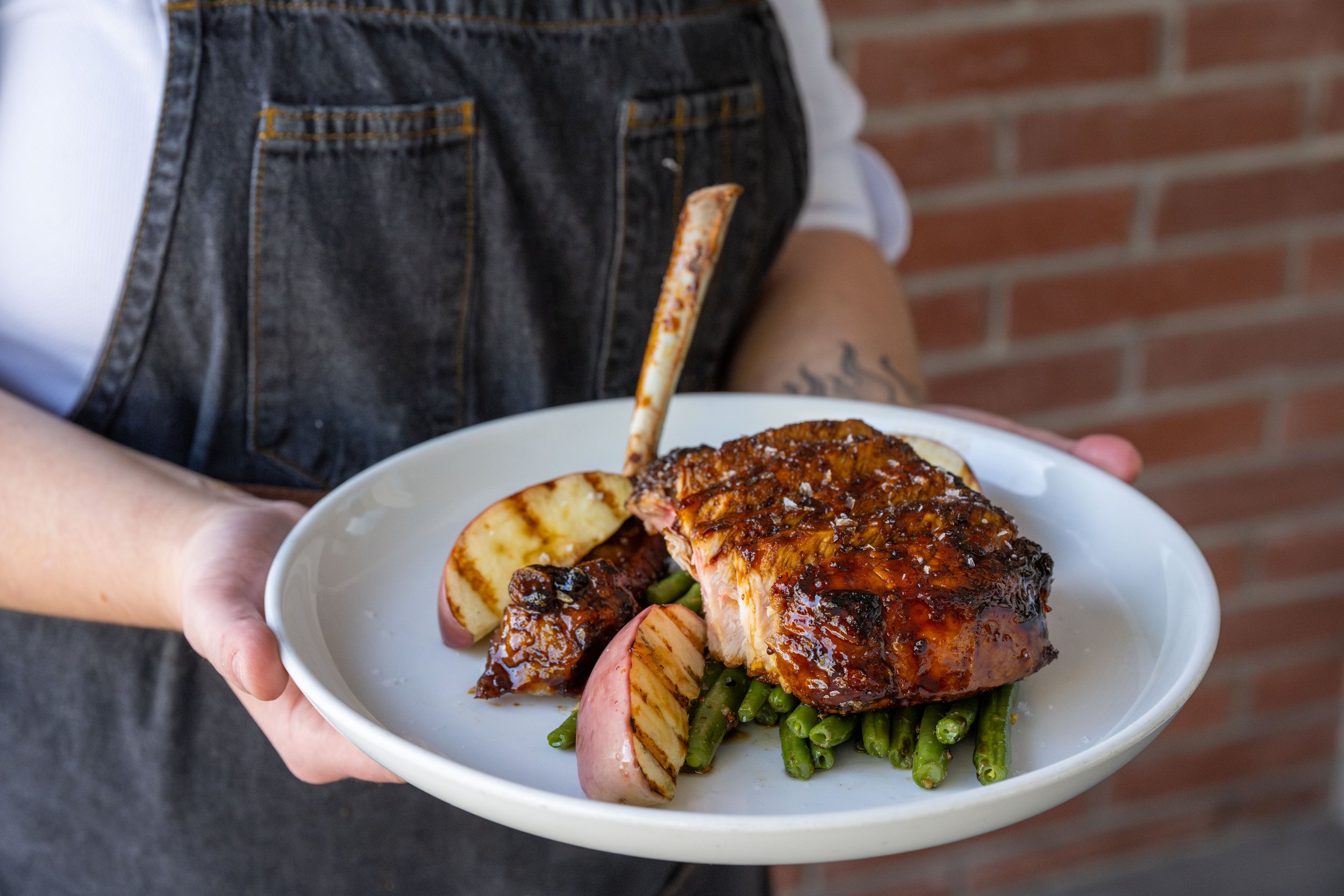 Rum-Molasses Glazed Pork Chop, Sautéed Green Beans, Grilled Apples