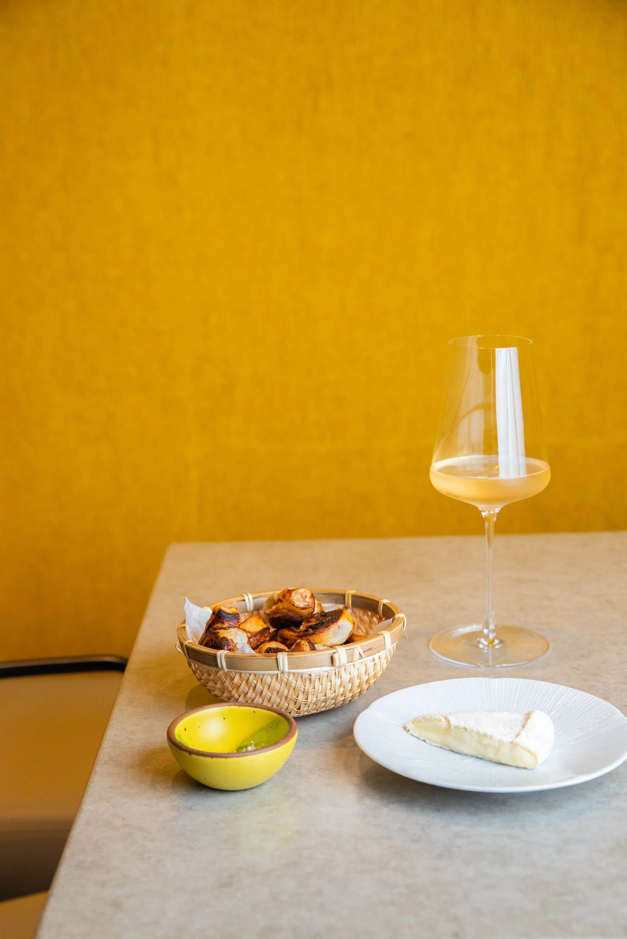 Scallion Puffs, Zhajiang, Scallion Butter, Jasper Hill Farm Moses Sleeper paired with Chardonnay-Pinot Noir, “Brut Cuvee,” Caraccioli Cellars, Santa Lucia Highlands, Monterey County, California, 2013