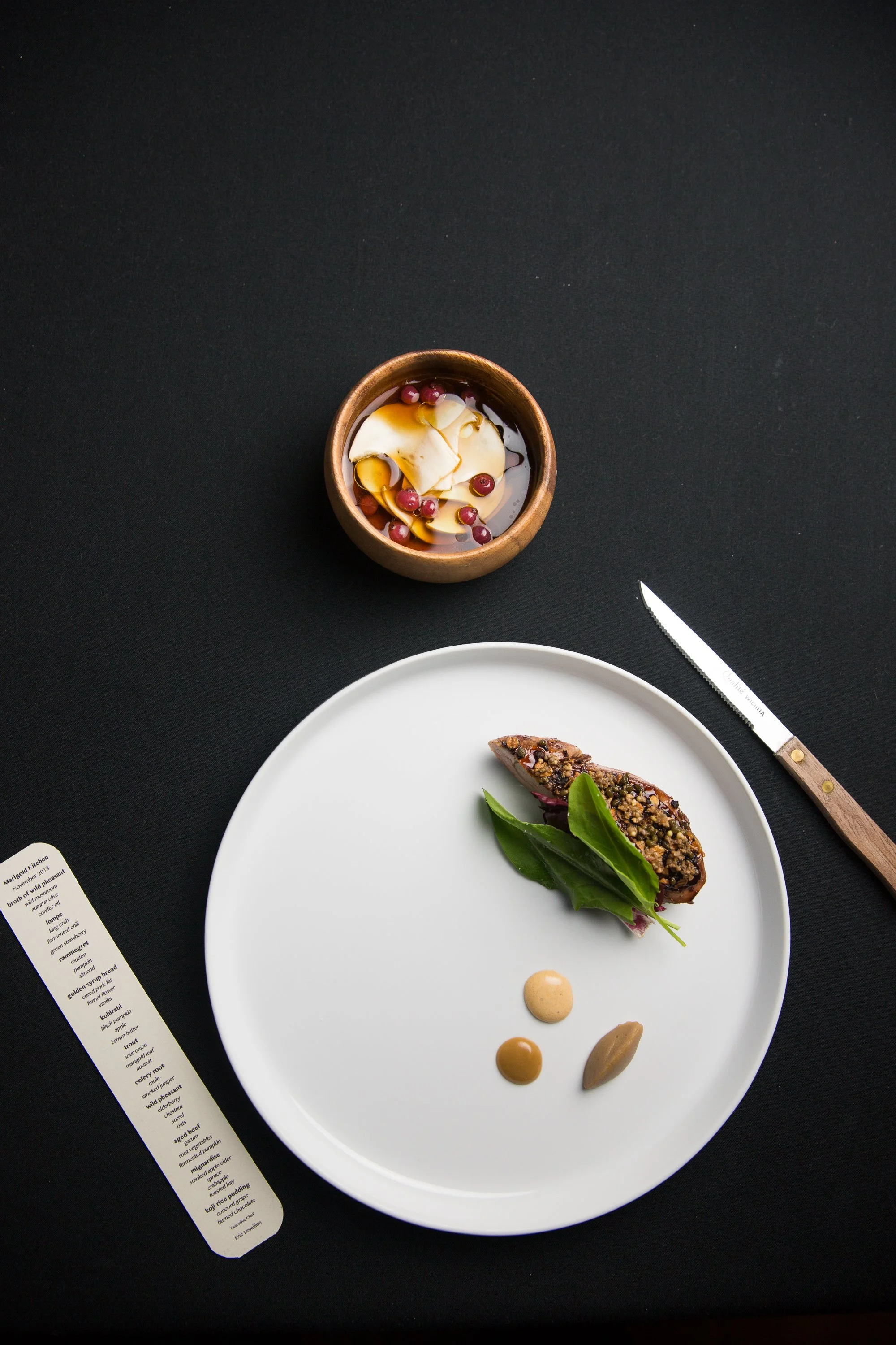Wild Pheasant, Elderberry, Chestnut, Sorrel, and Oats with Pheasant Broth, Fermented Currant, and Pine Mushrooms
