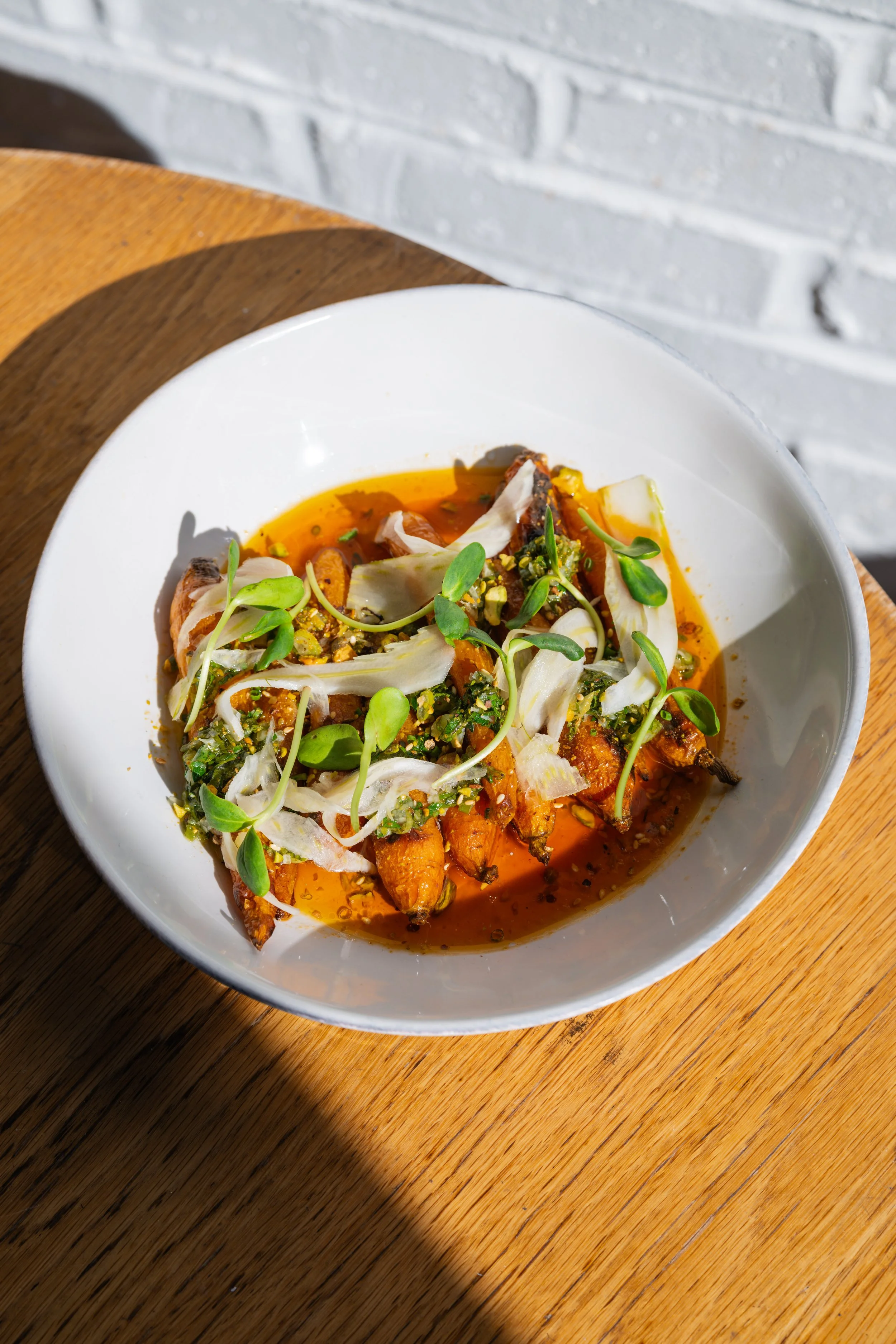Roasted Carrot, Salsa Roja, Pickled Fennel, Herb Gremolata, Pistachio Dukkah, Sunflower Sprouts
