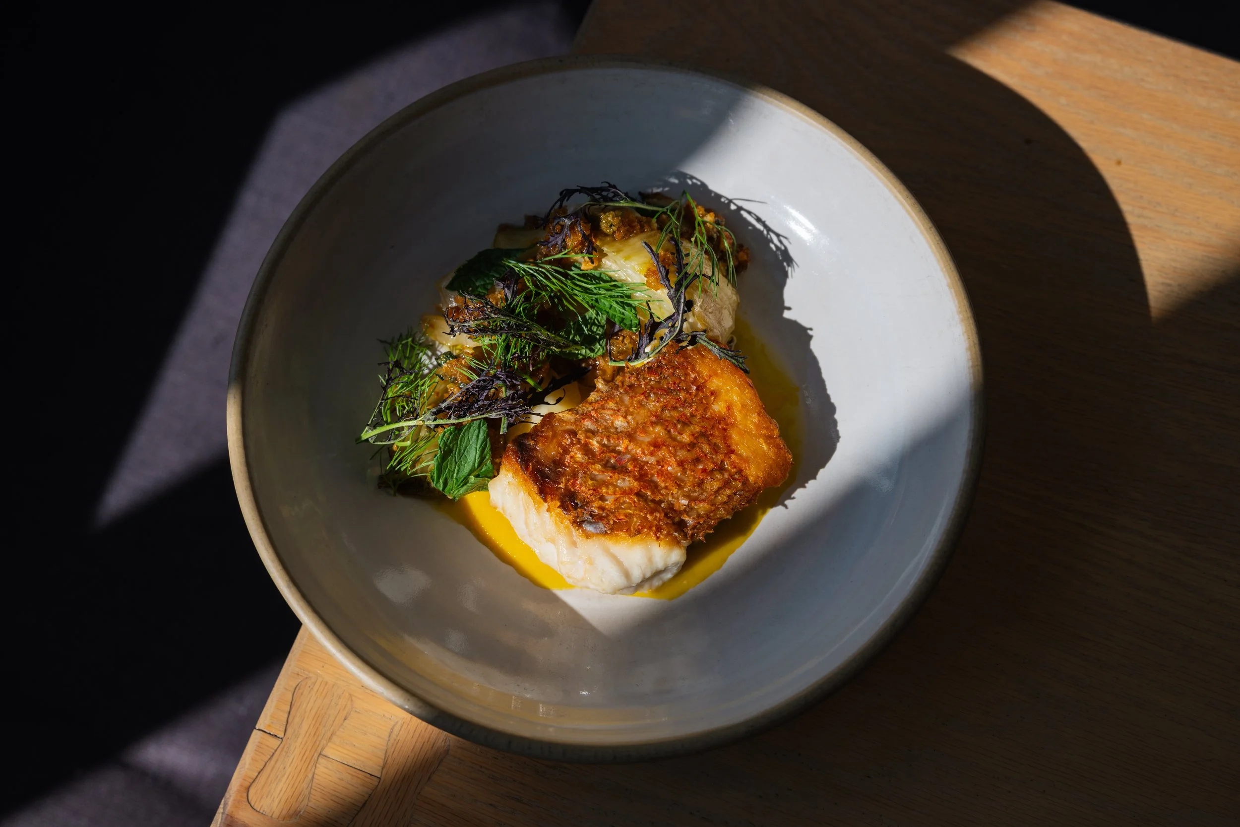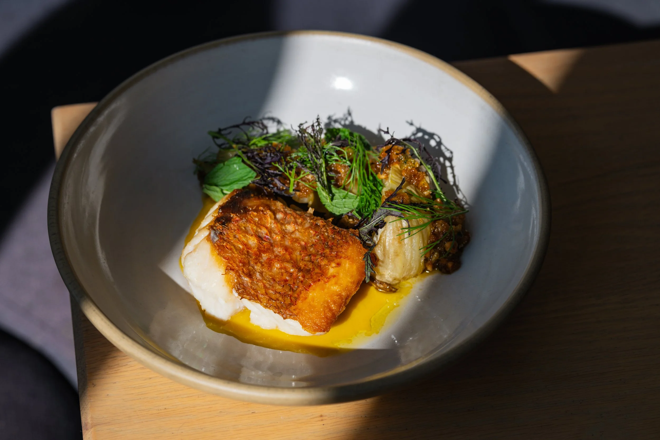 Snapper, Braised Fennel, Fennel Barigoule Sauce, Hazelnut Piccata, Fennel Fronds, Mint, Ruby Streaks