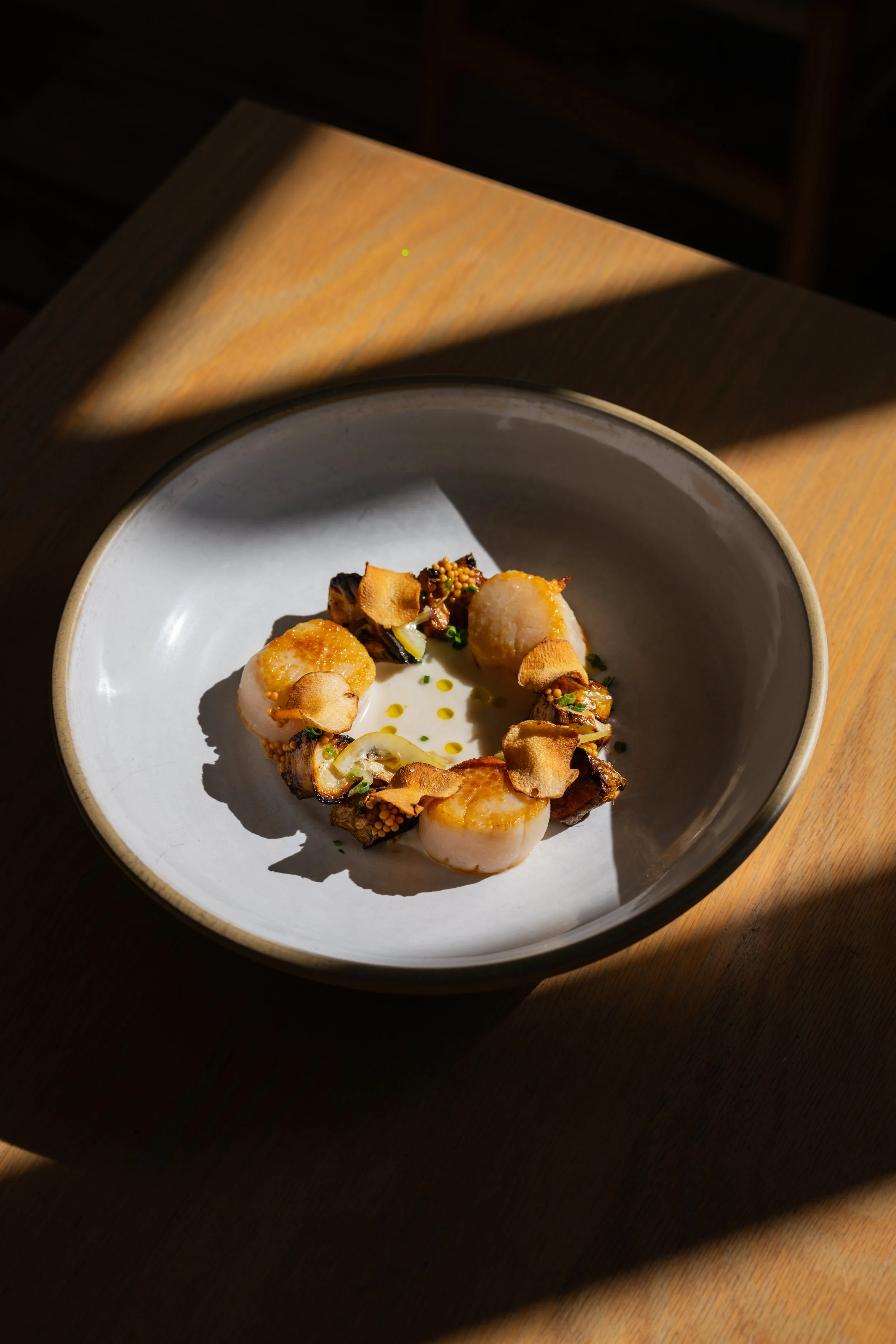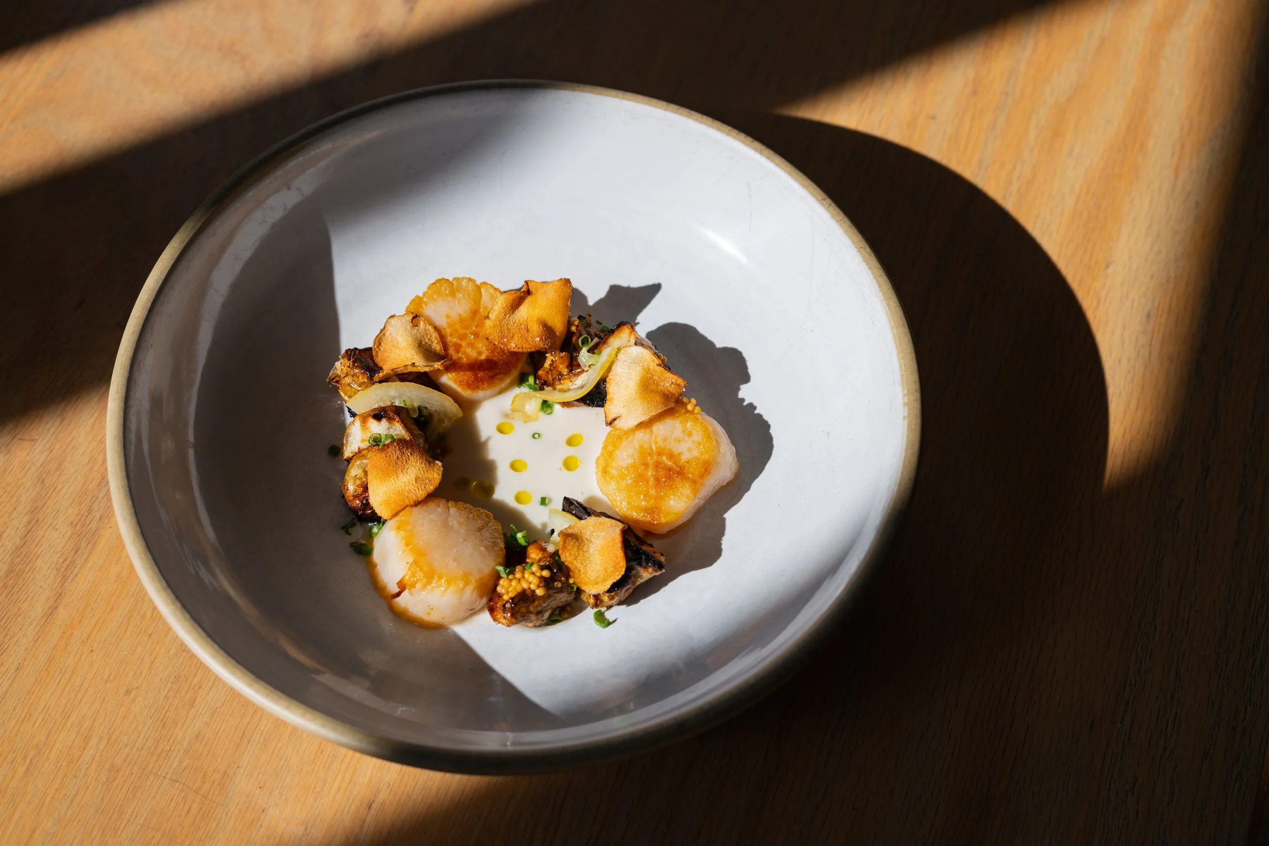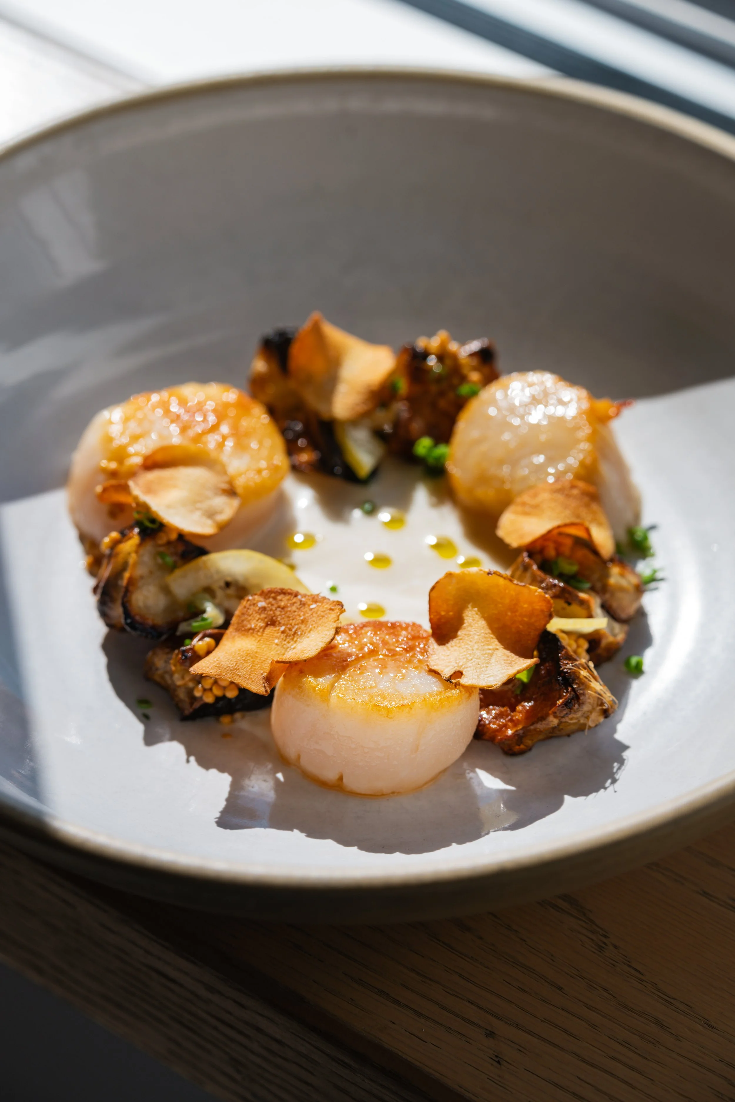 Seared Scallops, Sunchoke-Masa Harina Velouté, Roasted Sunchokes, Preserved Lemon, Pickled Mustard Seeds, Sunchoke Chips, Chives