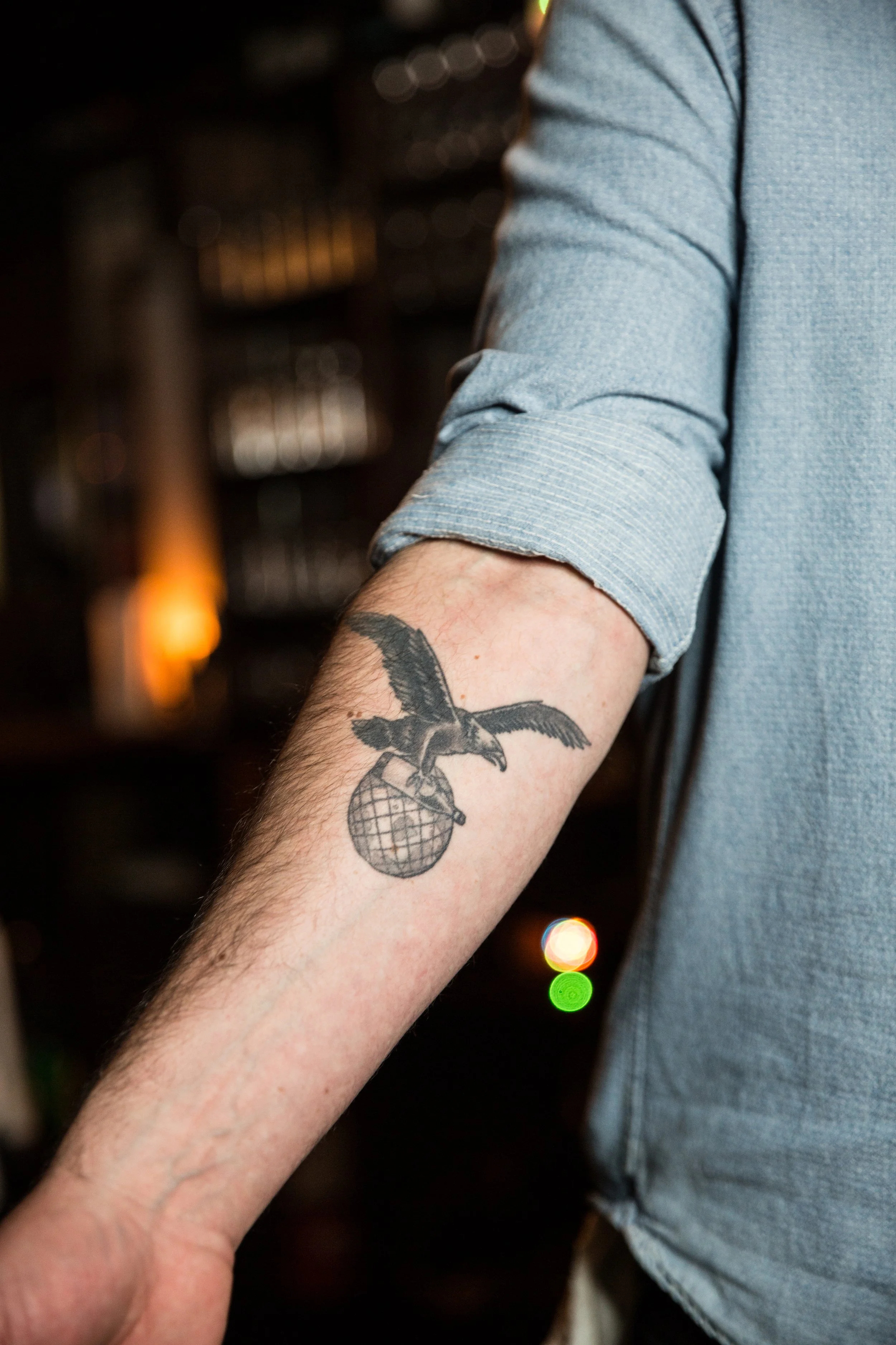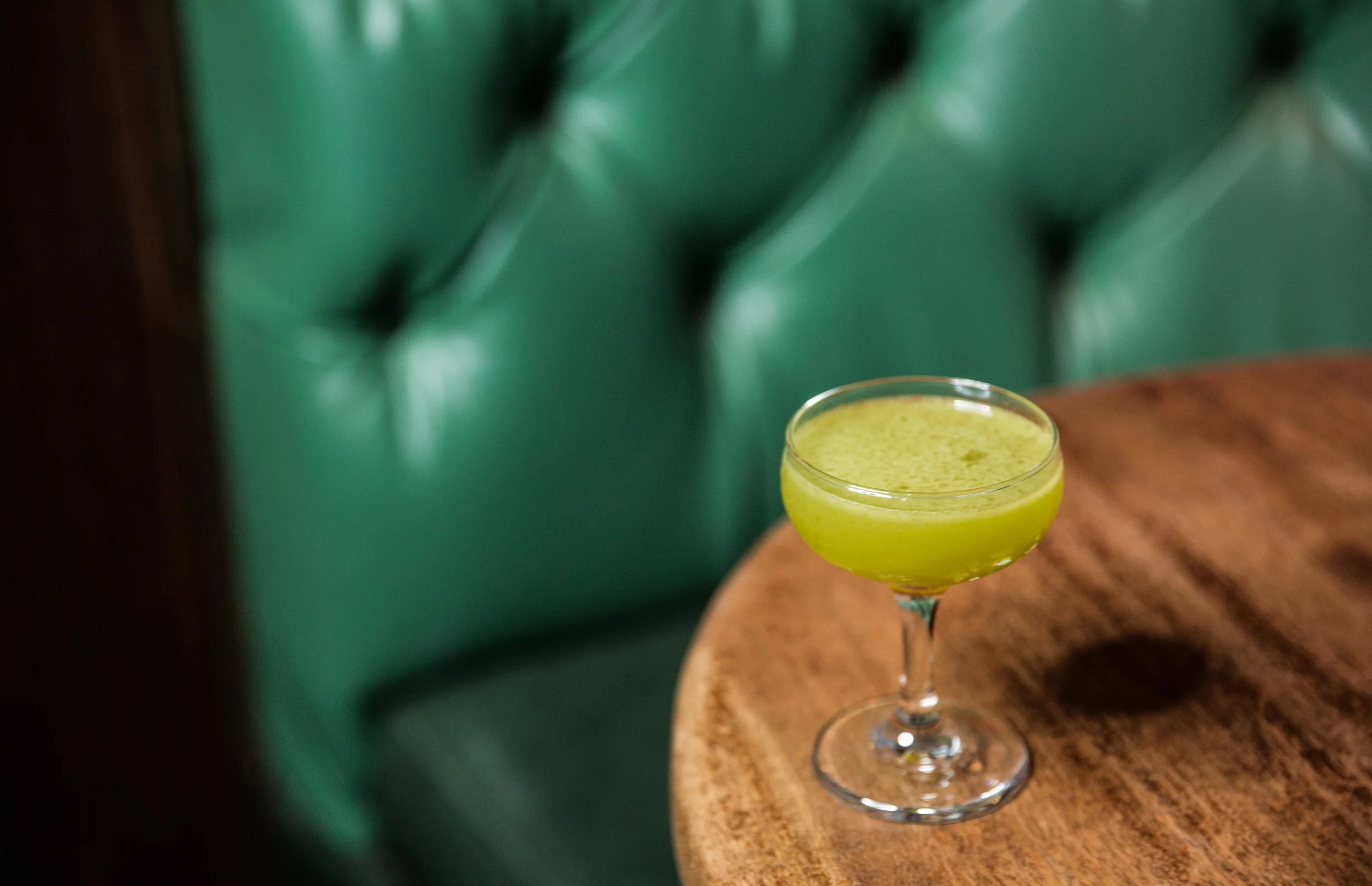 Greentini: Green Tea-infused Ketel One, Dolin Dry Vermouth, Giffard Apricot Eau de Vie, and Orange Bitters