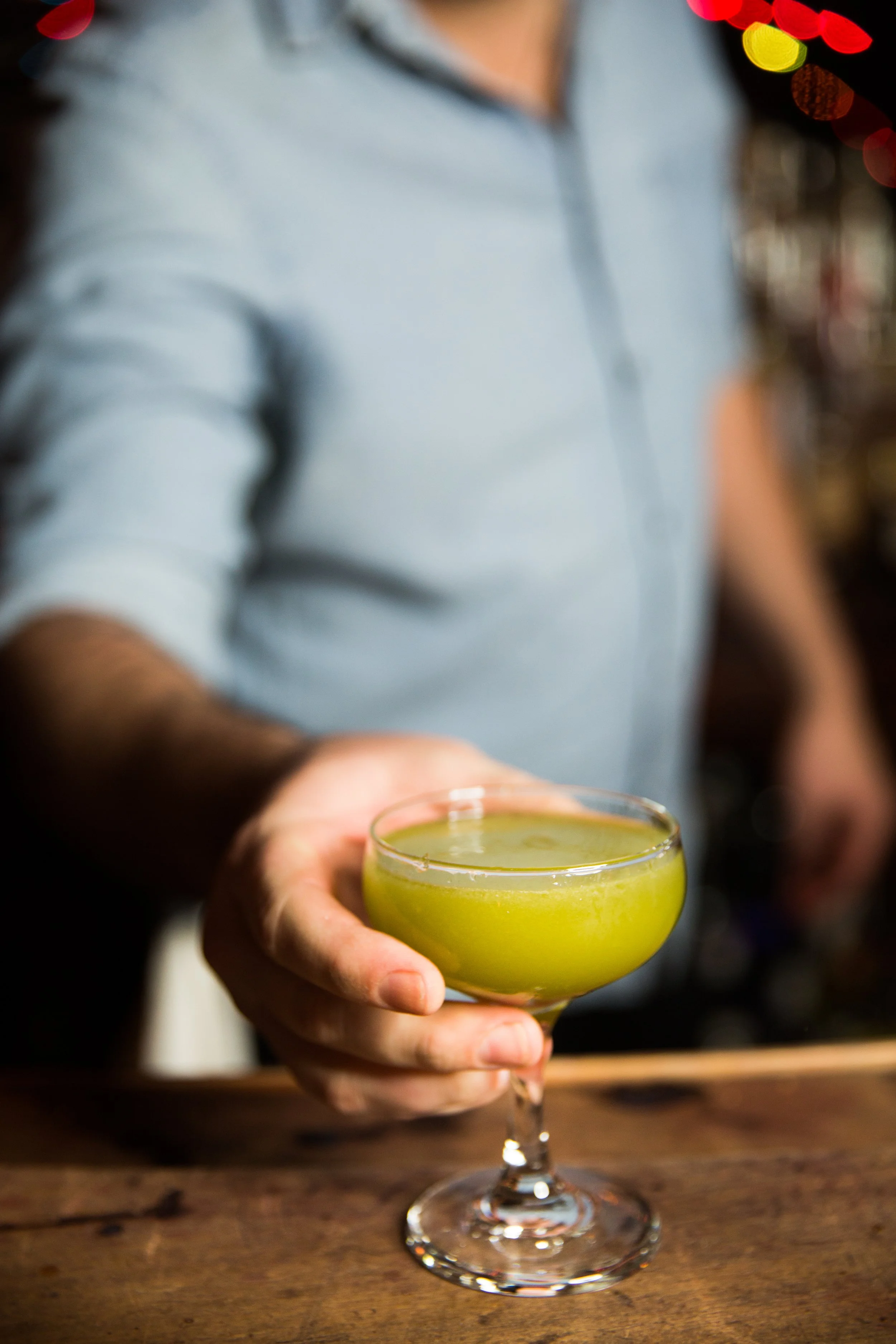 Numbing to America: Novo Togo Cachaca, Basil Syrup, Passion Fruit, Lime, and Pomegranate