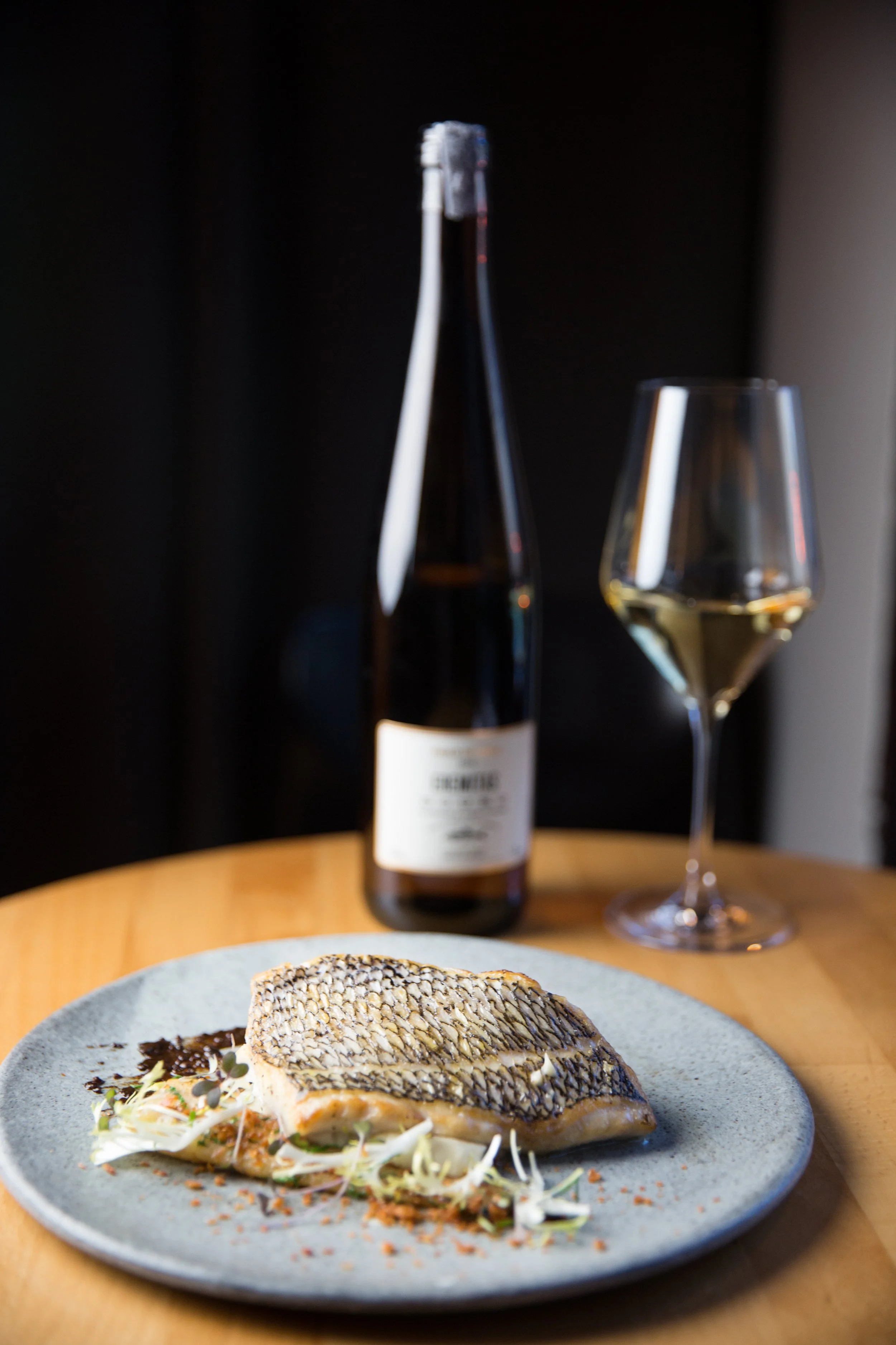 Black Sea Bass, Black Garlic Purée, Braised Kale, Parsnip Purée, Parsnip Confit, and Parsnip Crumbs paired with Rabigato, Eremita, Paulo de Tebas, Douro, Portugal, 2016