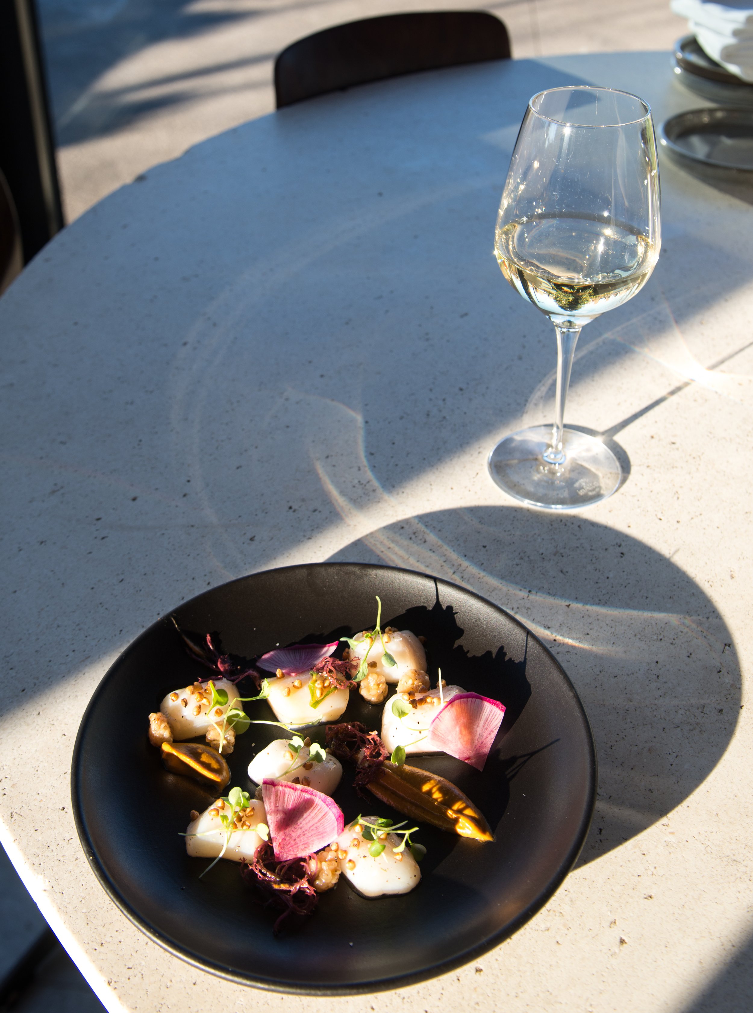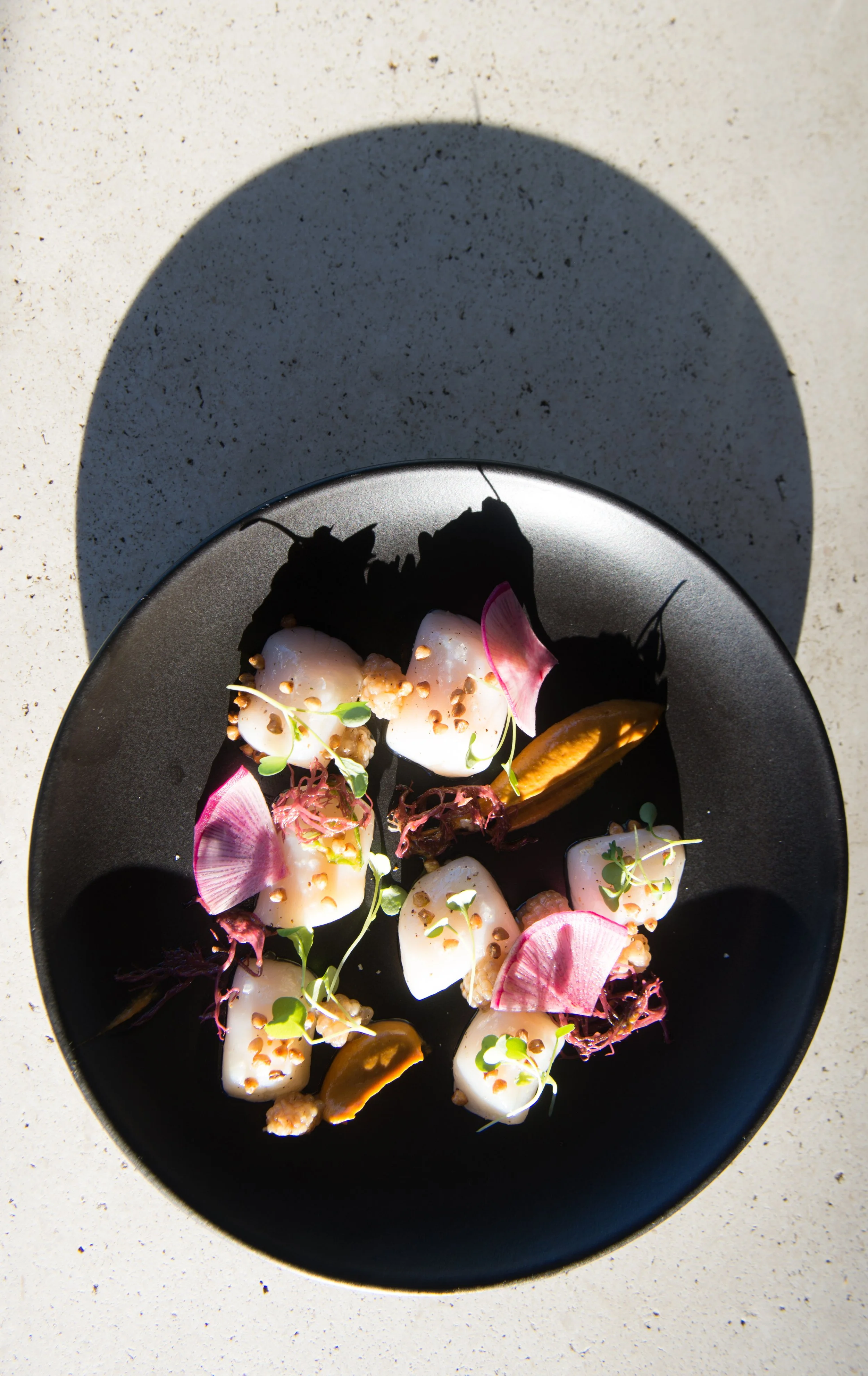 Crudo: Nantucket Bay Scallops, Amba Purée, Ogo Salad, Sesame Oil, Soy, Pickled White Mulberries, Micro Arugula, Radish, and Toasted Buckwheat
