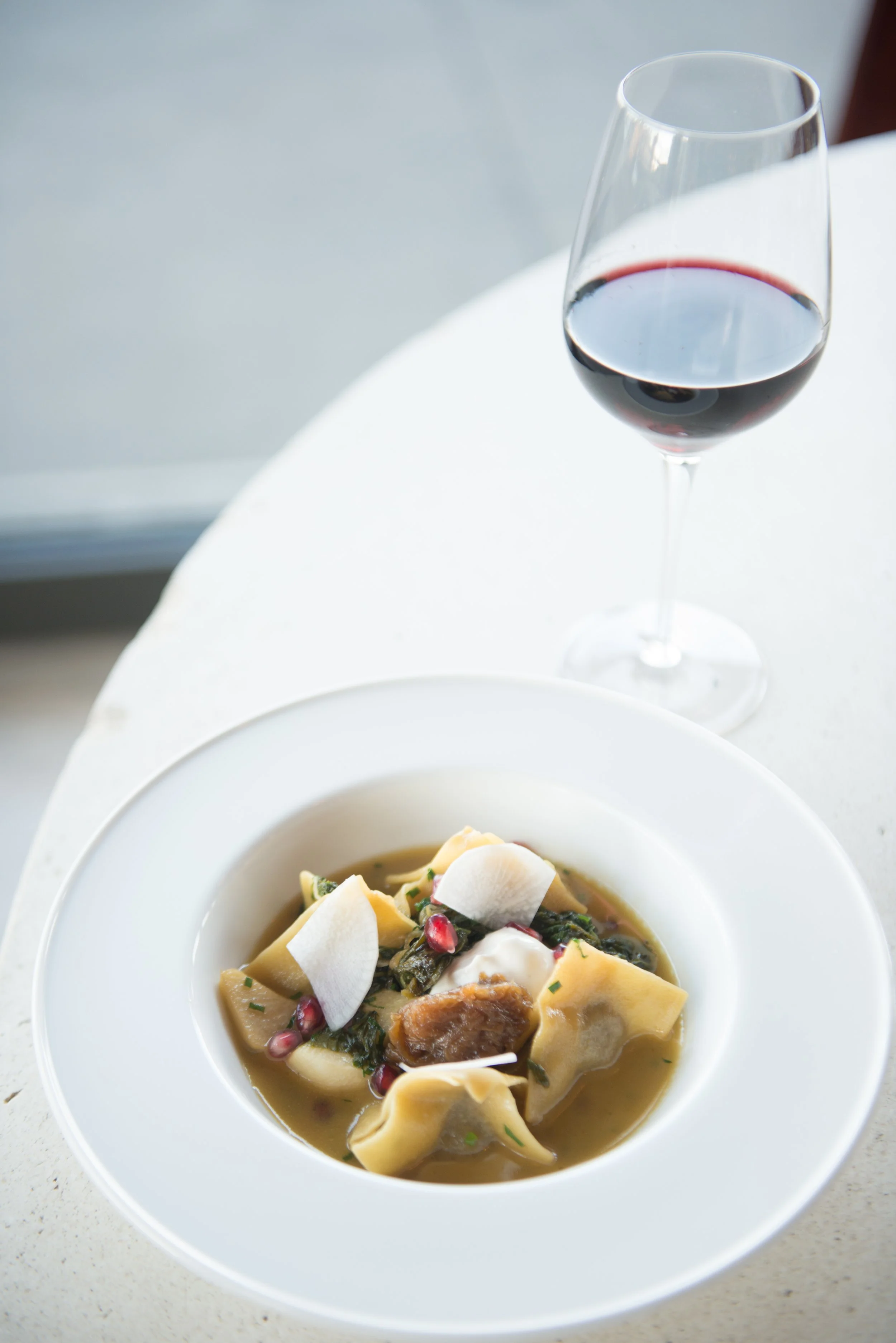 Short Rib Monte, Turnips, Fenugreek, Garlic Yogurt, Pomegranate Seeds, and Mustard Greens