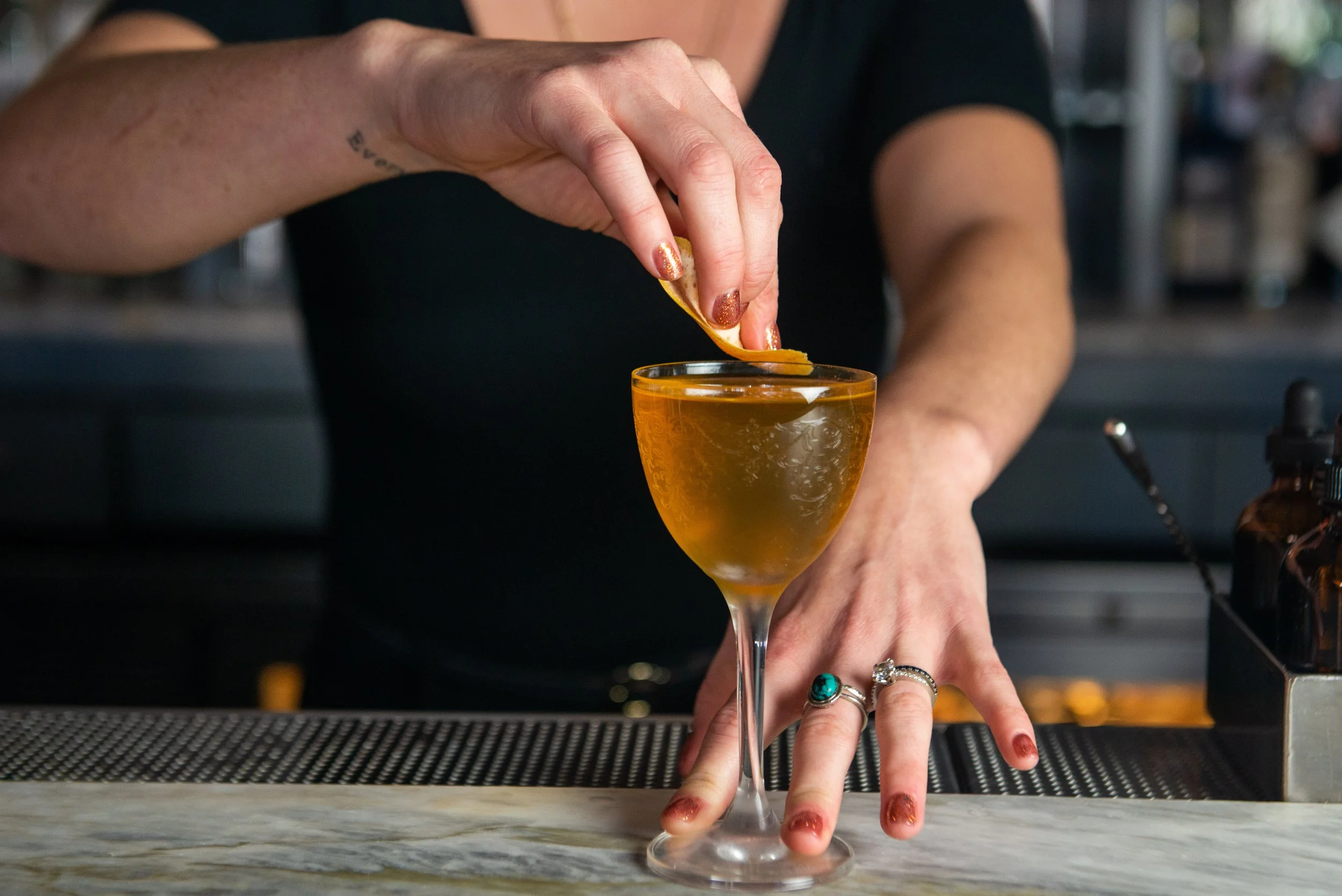 Marigold: Dolin Dry Vermouth de Chambéry, Yellow Chartreuse, Fino Sherry, Housemade Amber Vermouth, Arette Blanco, Saline, Hopped Grapefruit Bitters
