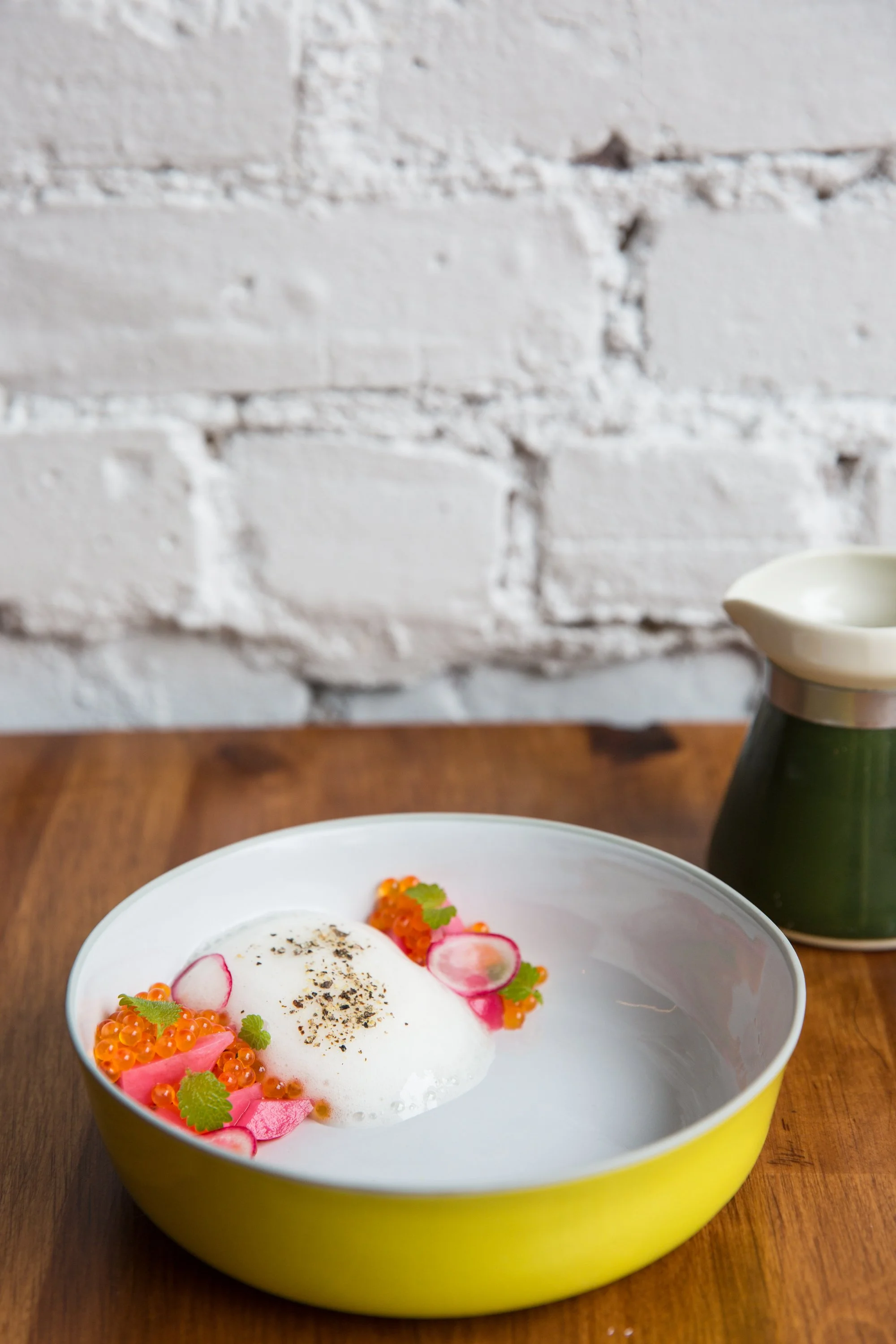 Garden Radish Top Gazpacho, Pickled Radishes, Smoked Trout Roe, and Lemon Balm