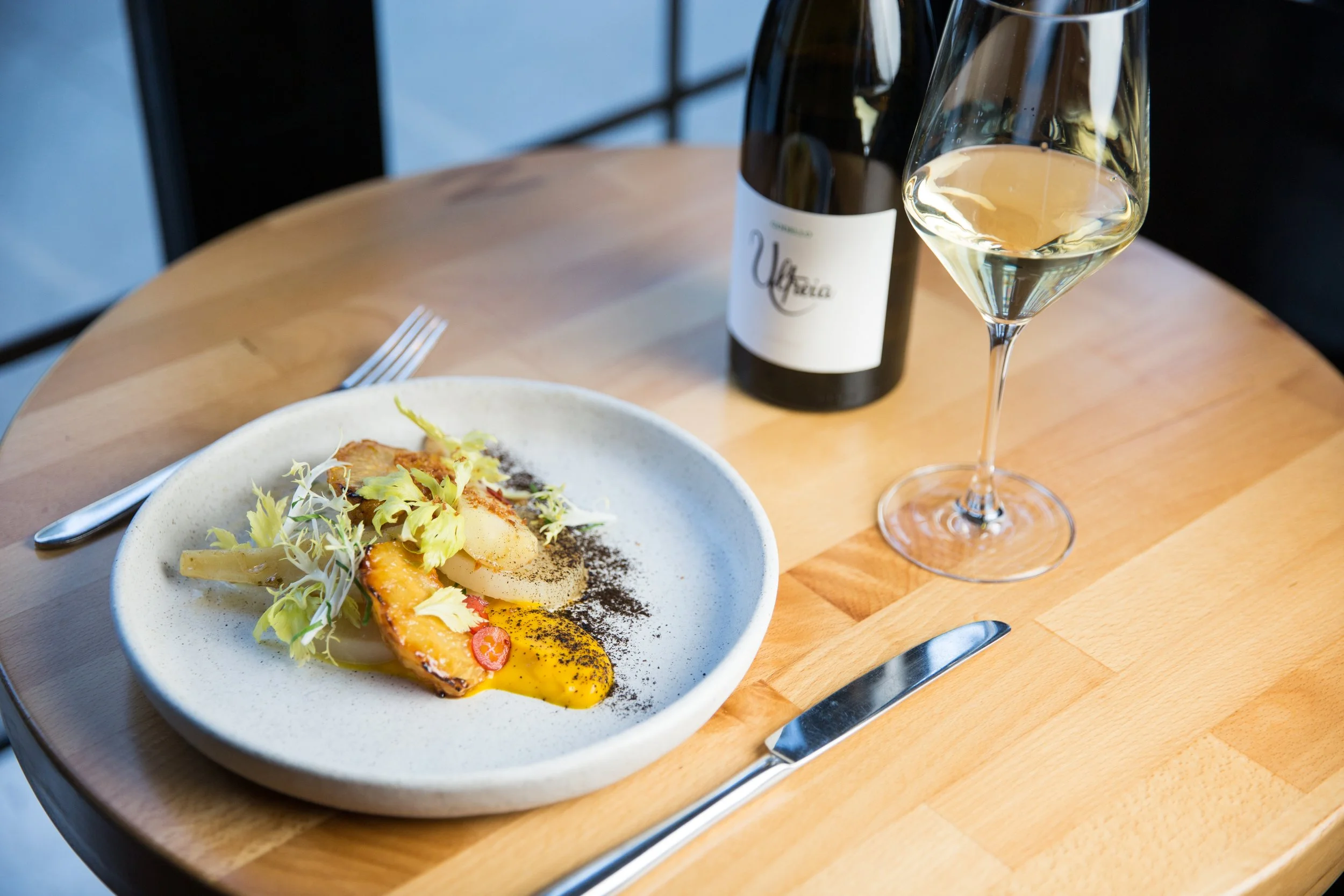 Confit Parsnips and Celery Root, Braised Daikon, Butternut Squash Purée, Cranberries, and Celery Leaves
