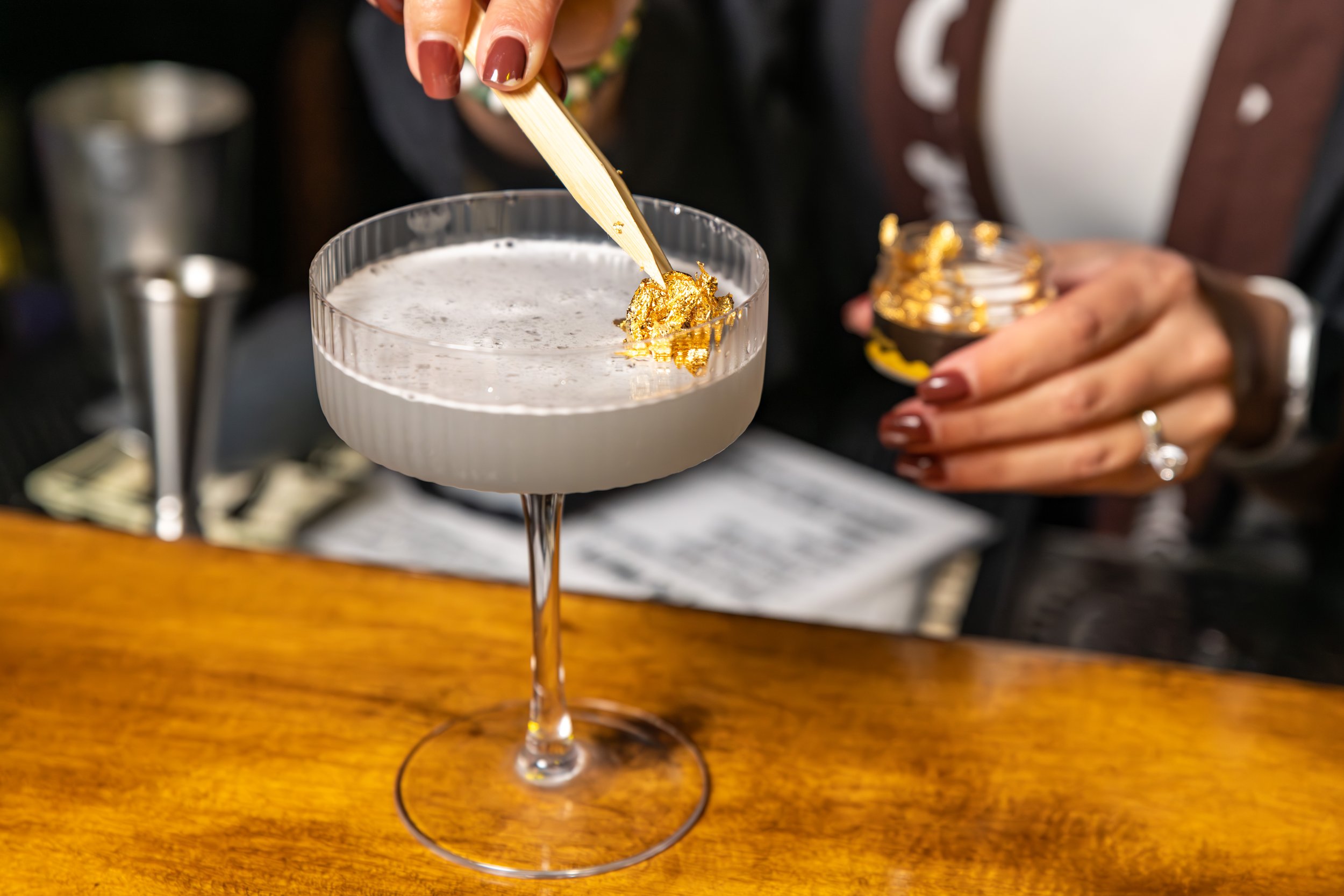 Agua de Violetas: Sake, Violet Liqueur, Lychee, Yuzu, Fee Foam, Edible Gold