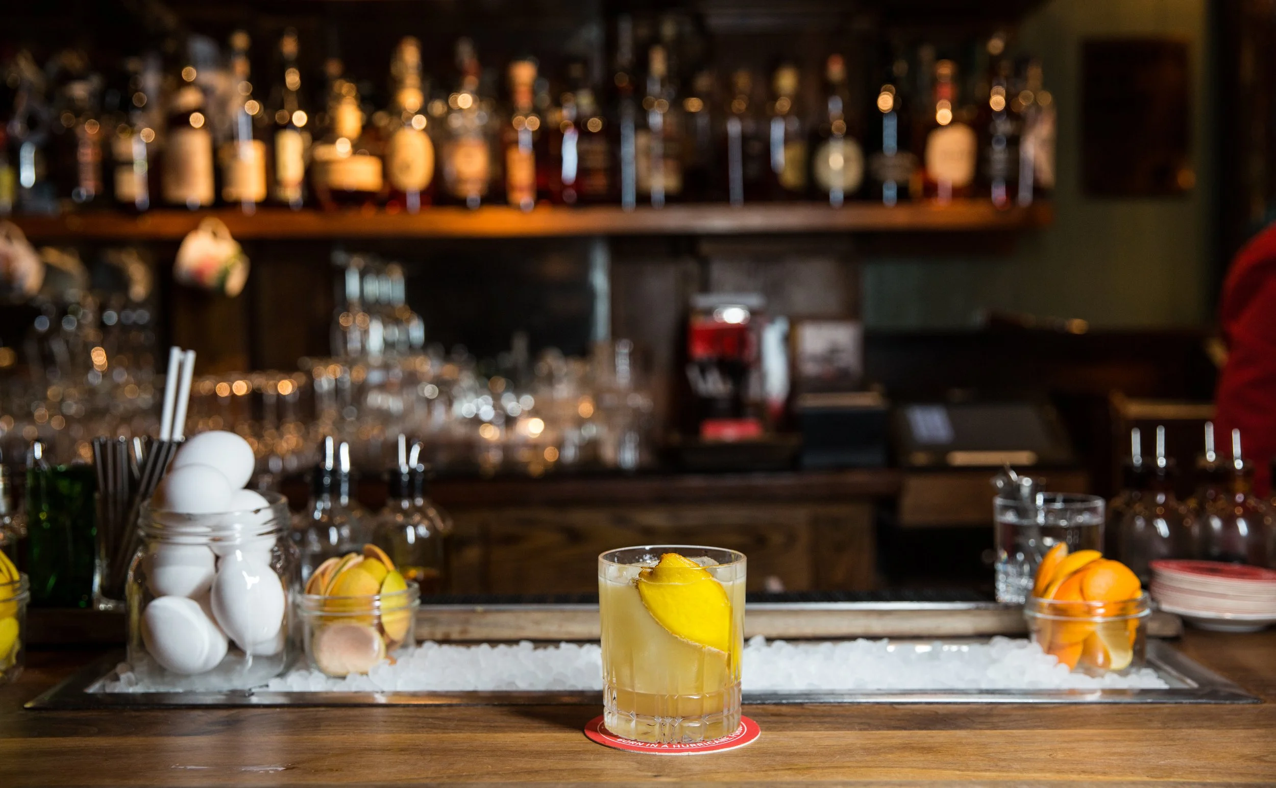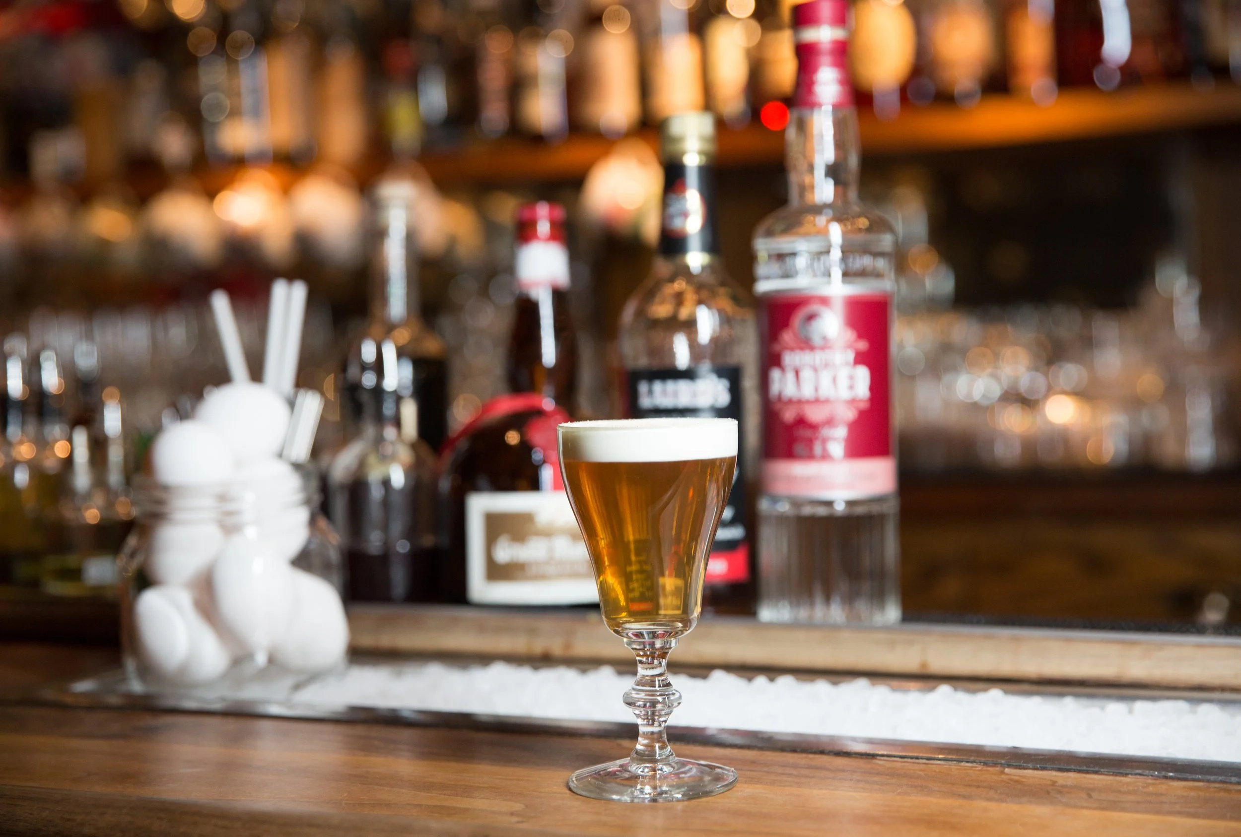 Cardinal Point: Old Forester Signature Bourbon, Pierre Ferrand Cognac, Apricot Eau de Vie, Cane Syrup, Lemon Juice, and Turmeric-Black Pepper Ginger