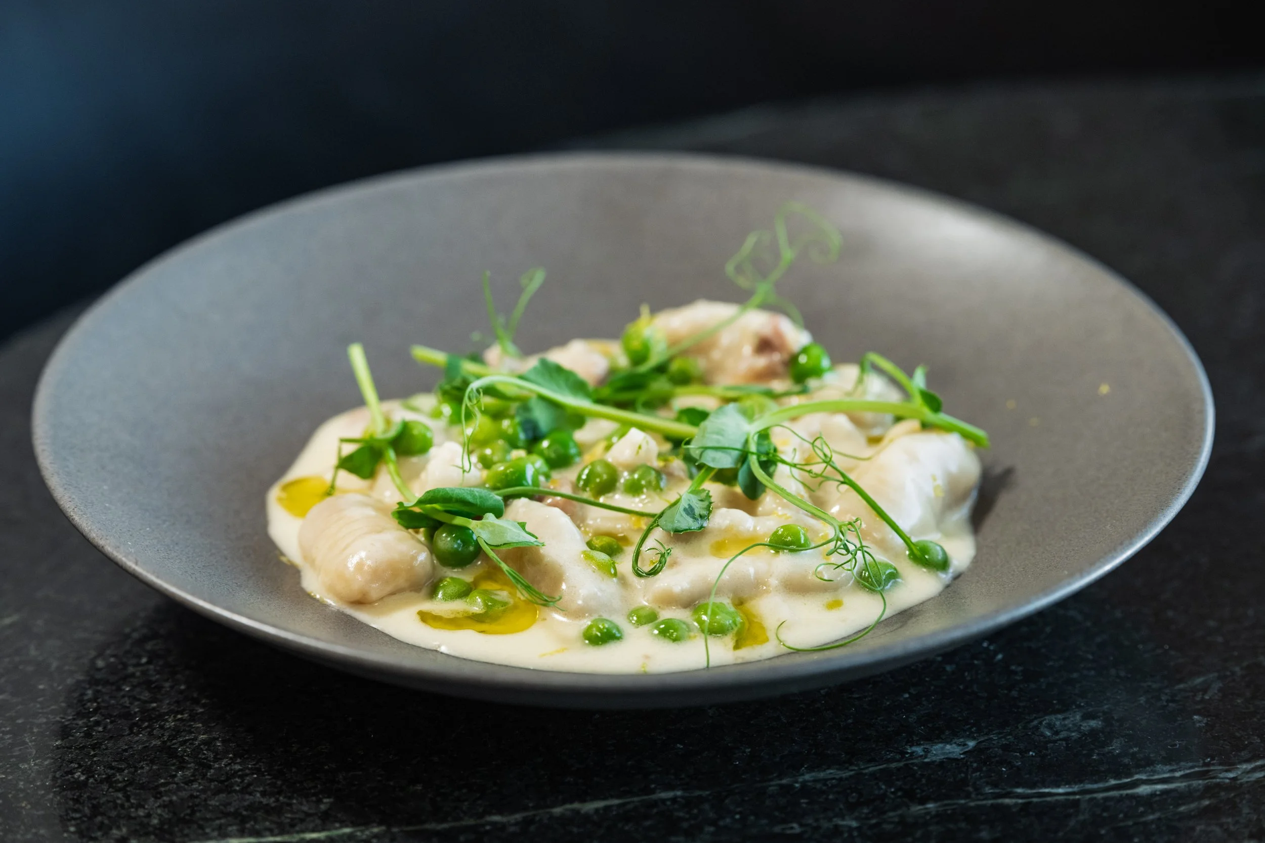 Ricotta Cavatelli, Smoked Ham Stock-Cream Sauce, English Peas, Lemon Juice, Pecorino Romano, Lemon Zest, Pea Tendrils