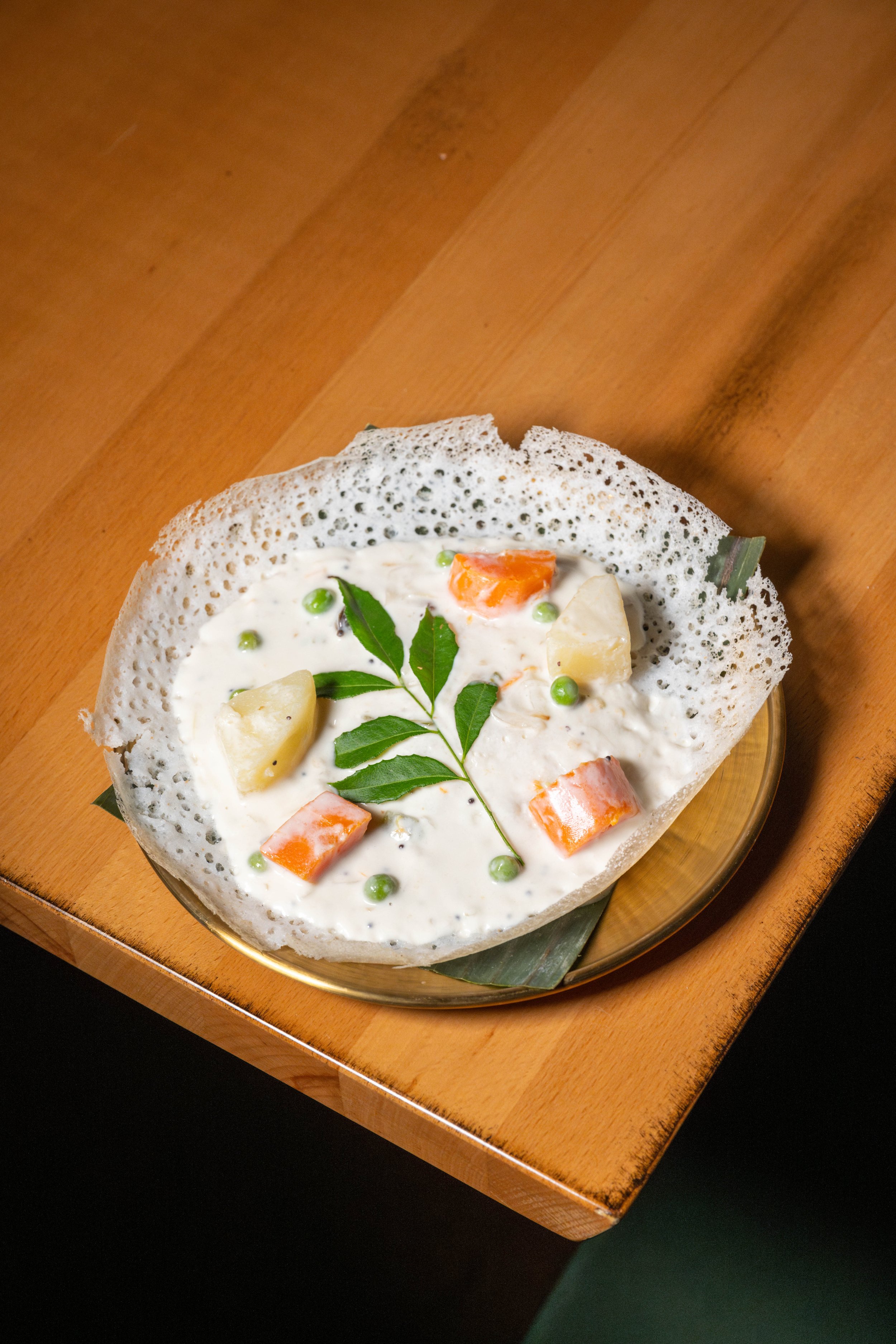 Appam and Ishtu: Fermented Rice-Coconut Crêpe with Spiced Potato-Carrot-Pea Stew
