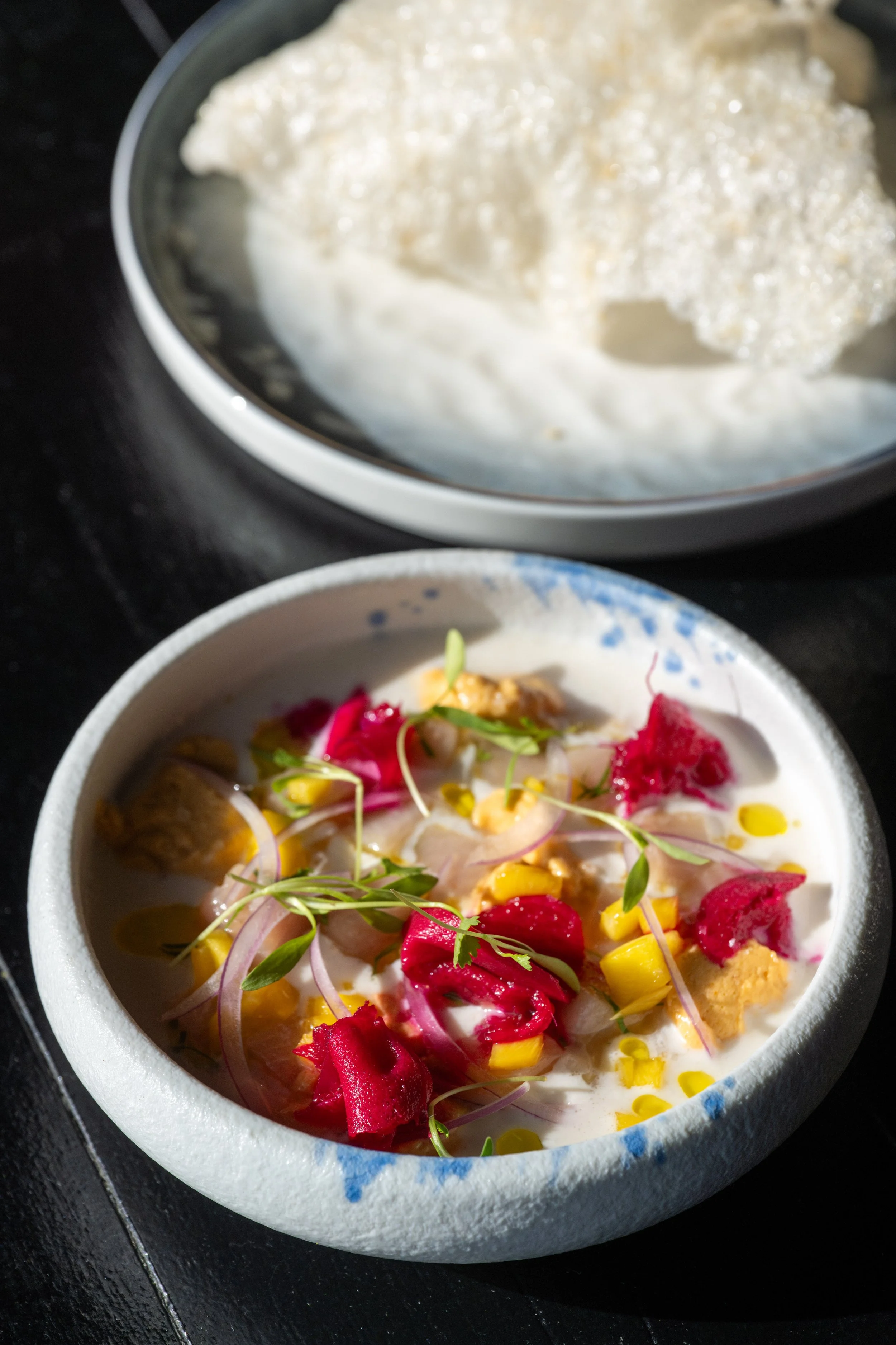 Cured Hamachi, Spiced Coconut Broth, Tom Yum Gelée, Mango, Pickled Ginger, Micro Cilantro, Coconut Cracker