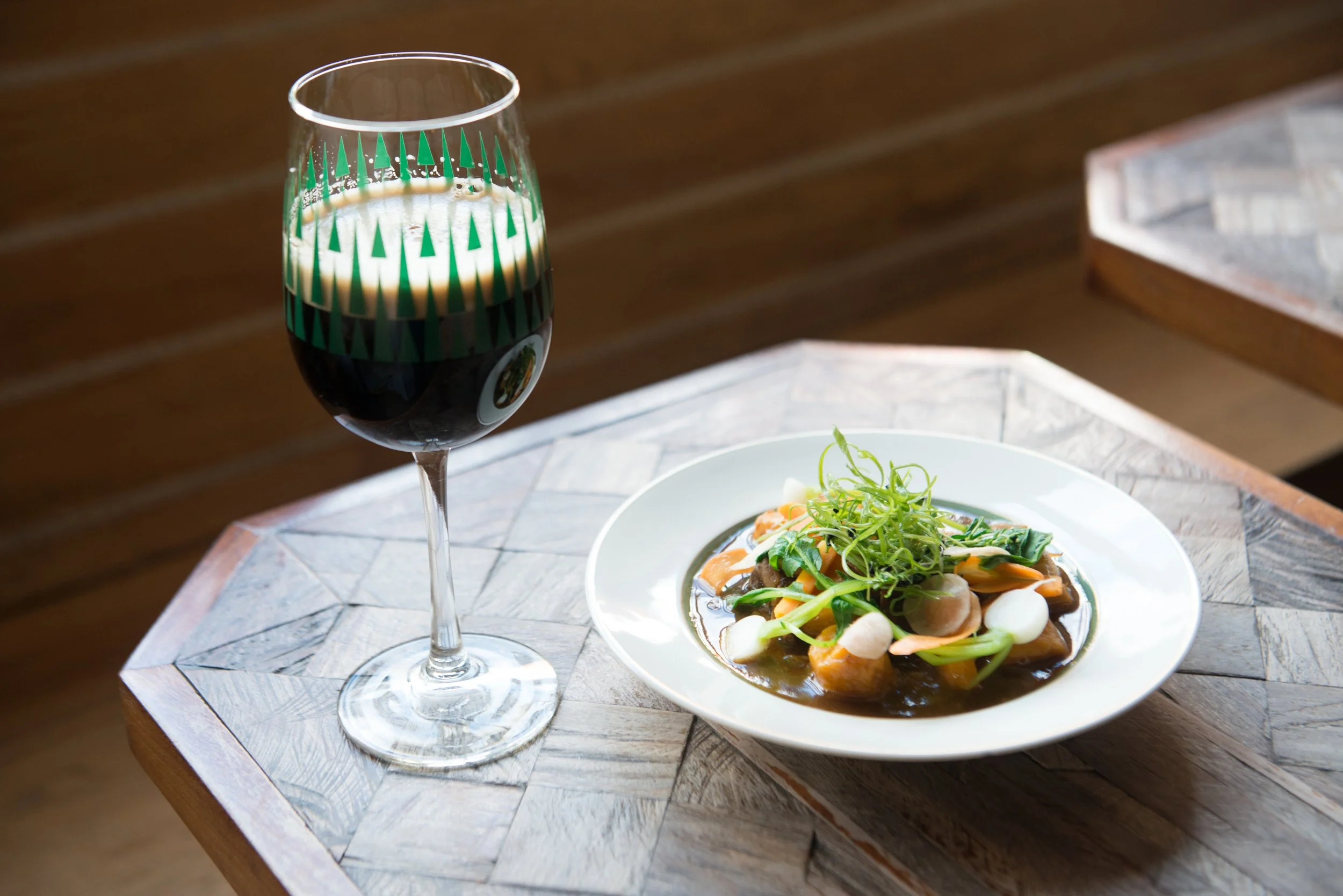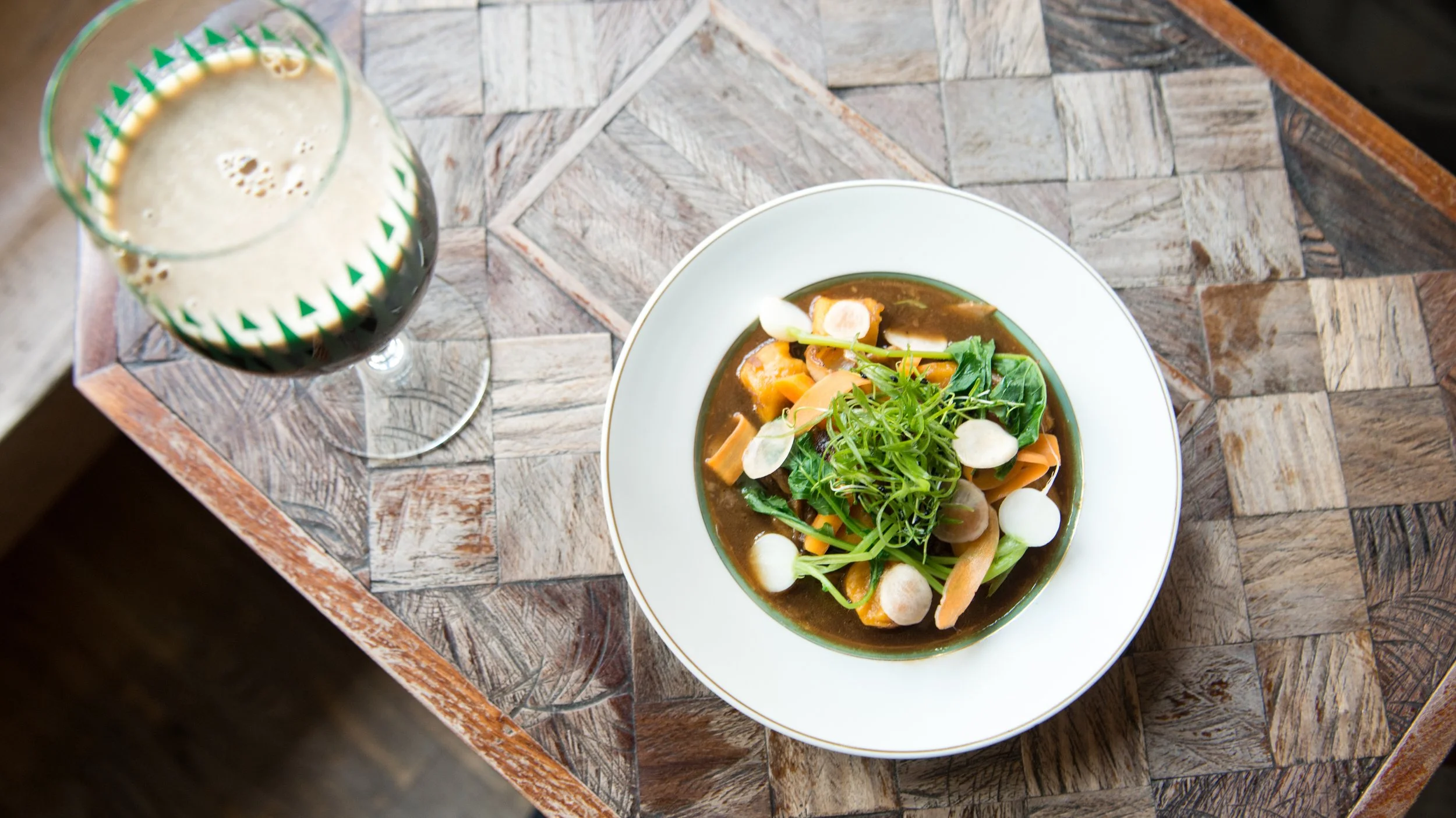 Braised Lamb Neck Curry, Coconut Milk, Roasted Squash Dumplings, Pickled Pearl Onion, Turnip, Chives