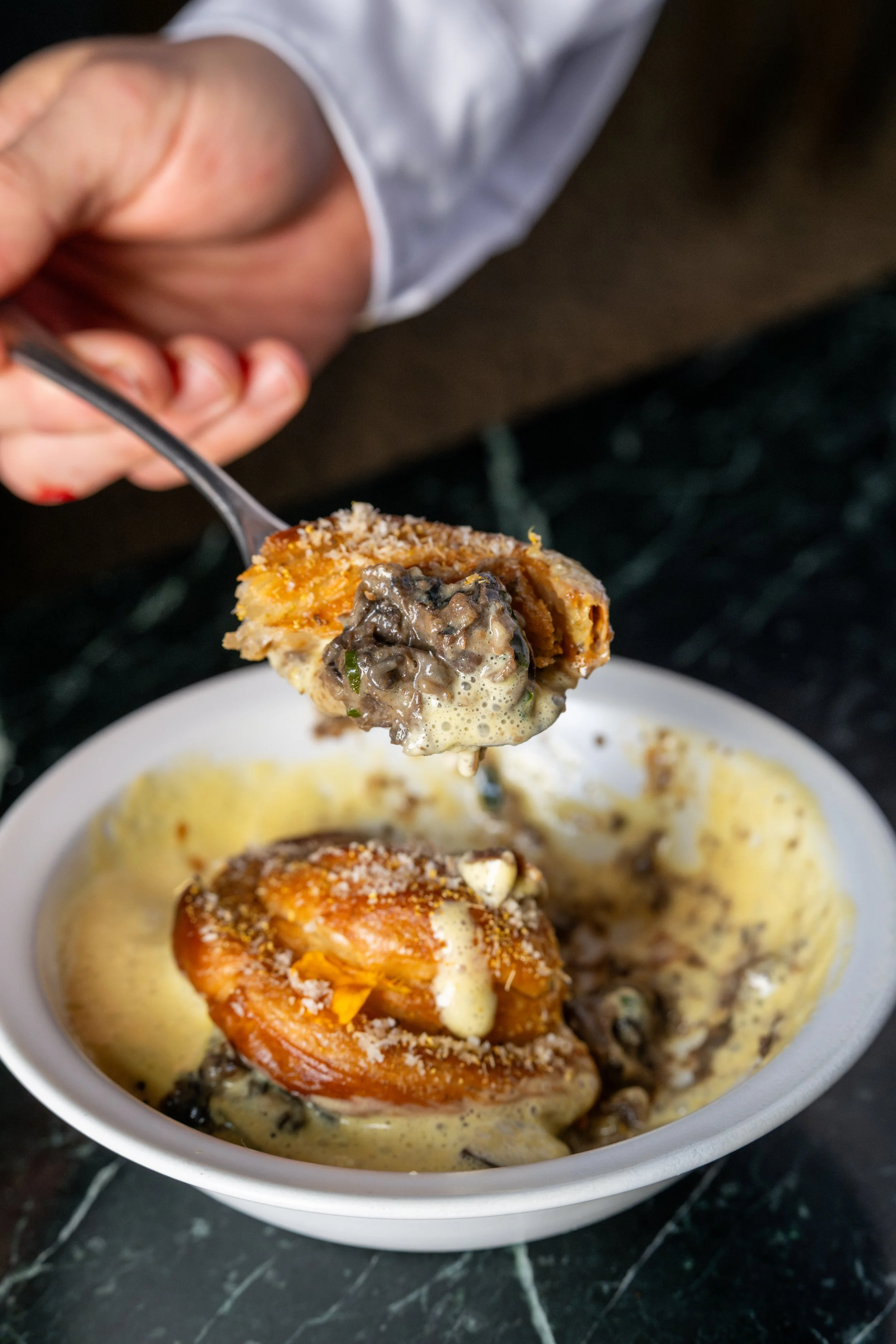 Braised Burgundy Snails, Yellow Chartreuse-Mushroom Duxelles, Yellow Chartreuse-Saffron Butter Foam, Snail Butter Puff Pastry, Shaved Roasted Hazelnuts, Hazelnut Oil, Fennel Pollen