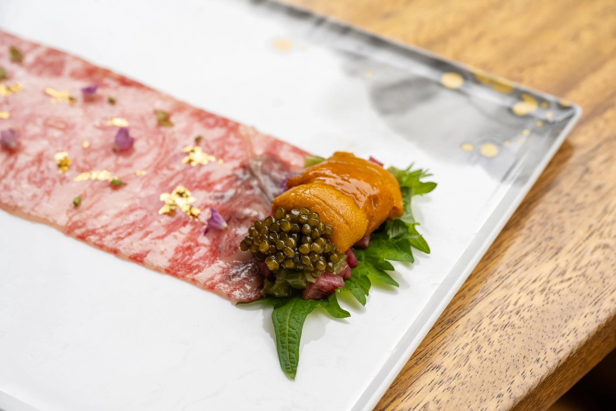 The Three Kings: Japanese Wagyu, Hokkaido Uni, Osetra Caviar, Watermelon Radish, Pickled Wasabi Root, Dashi Soy Jelly, Shiso Leaf