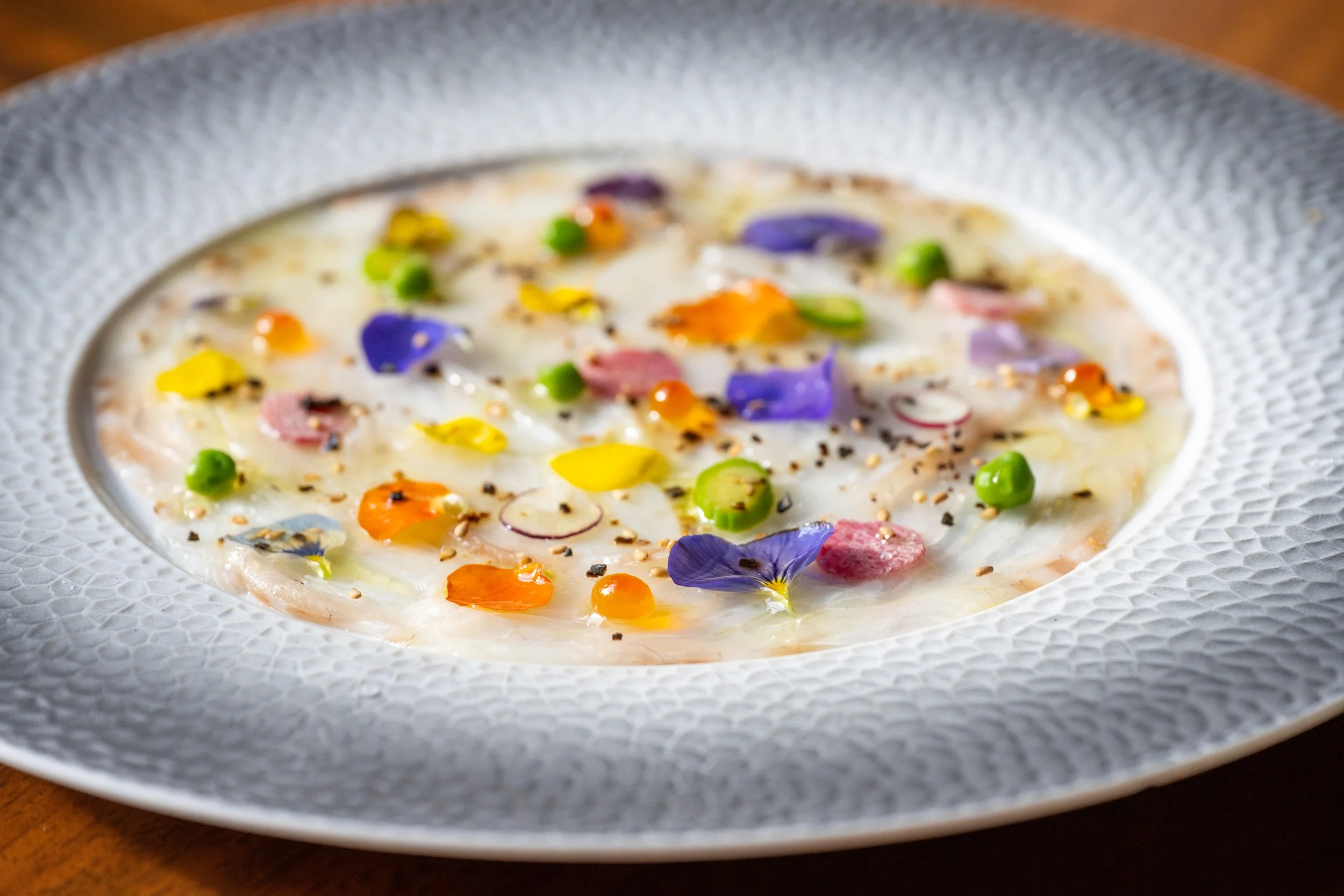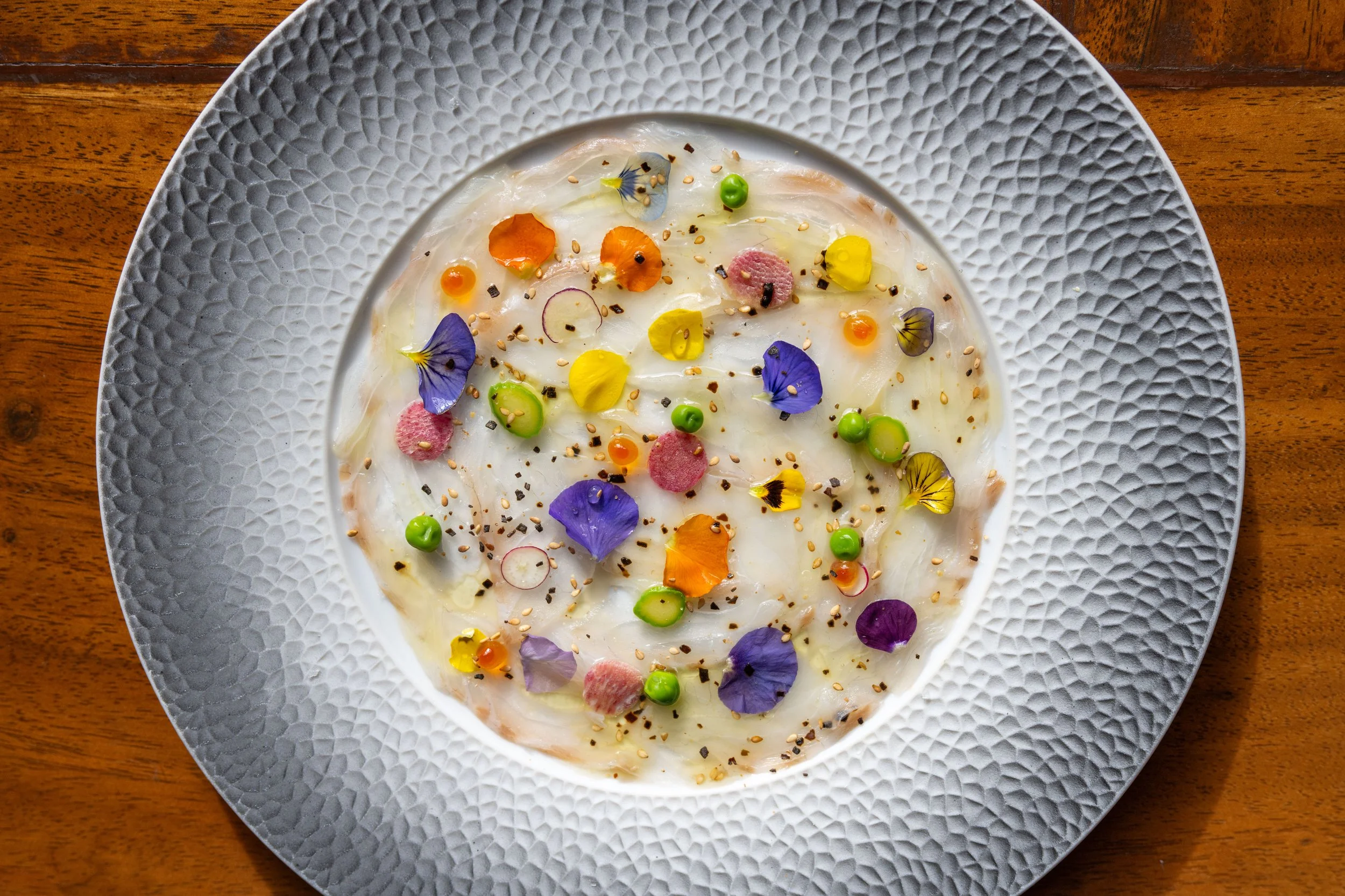 Madai Usuzukuri: Sea Bream, White Soy, Lemon, Shio Kombu, Watermelon Radish, Asparagus, Peas, Salmon Roe, Sesame Seeds, Violas