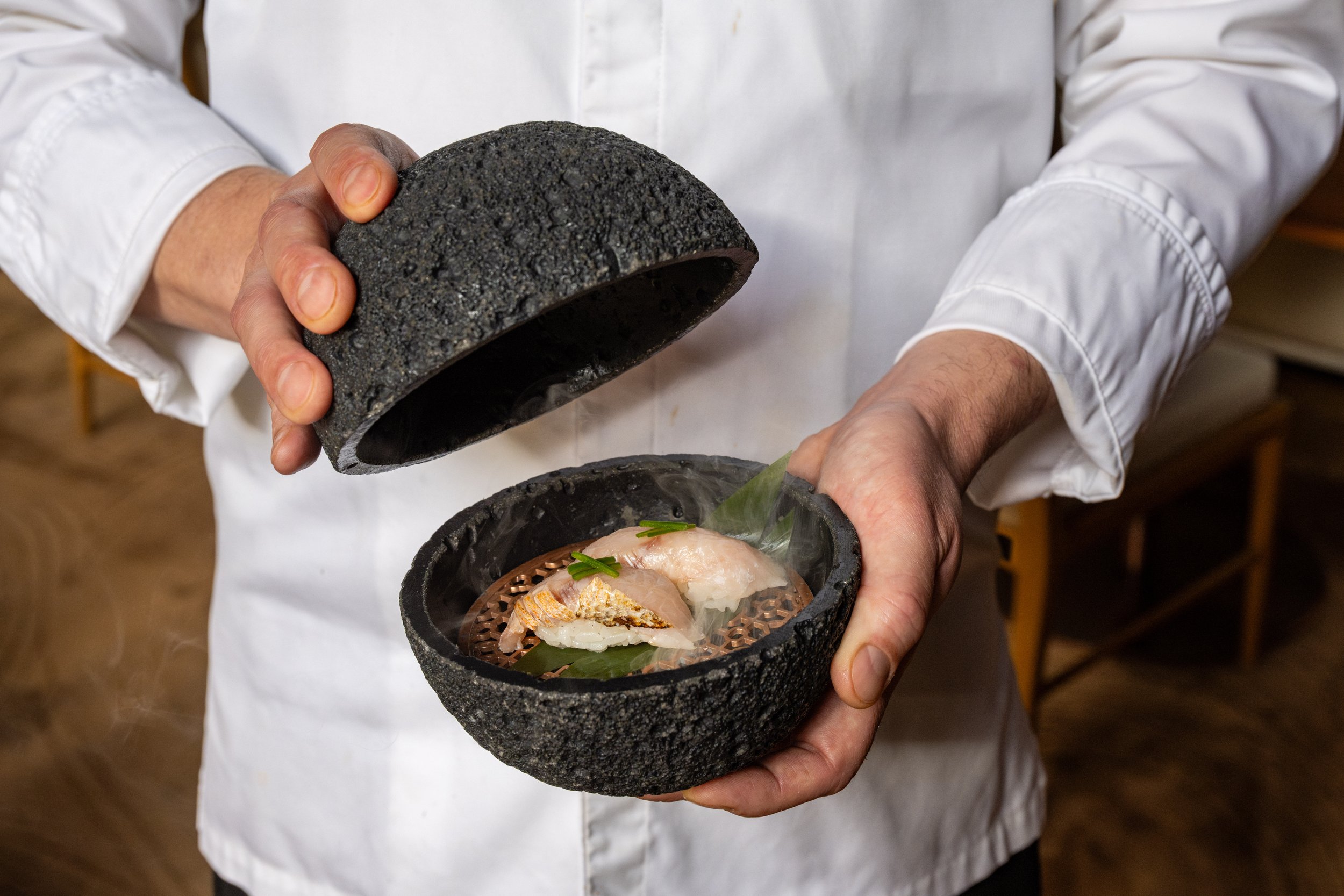 Torched Black Throat Sea Perch Nigiri, Irizake, Green Chile, Moshio, Smoked Cedar, Sushi Rice