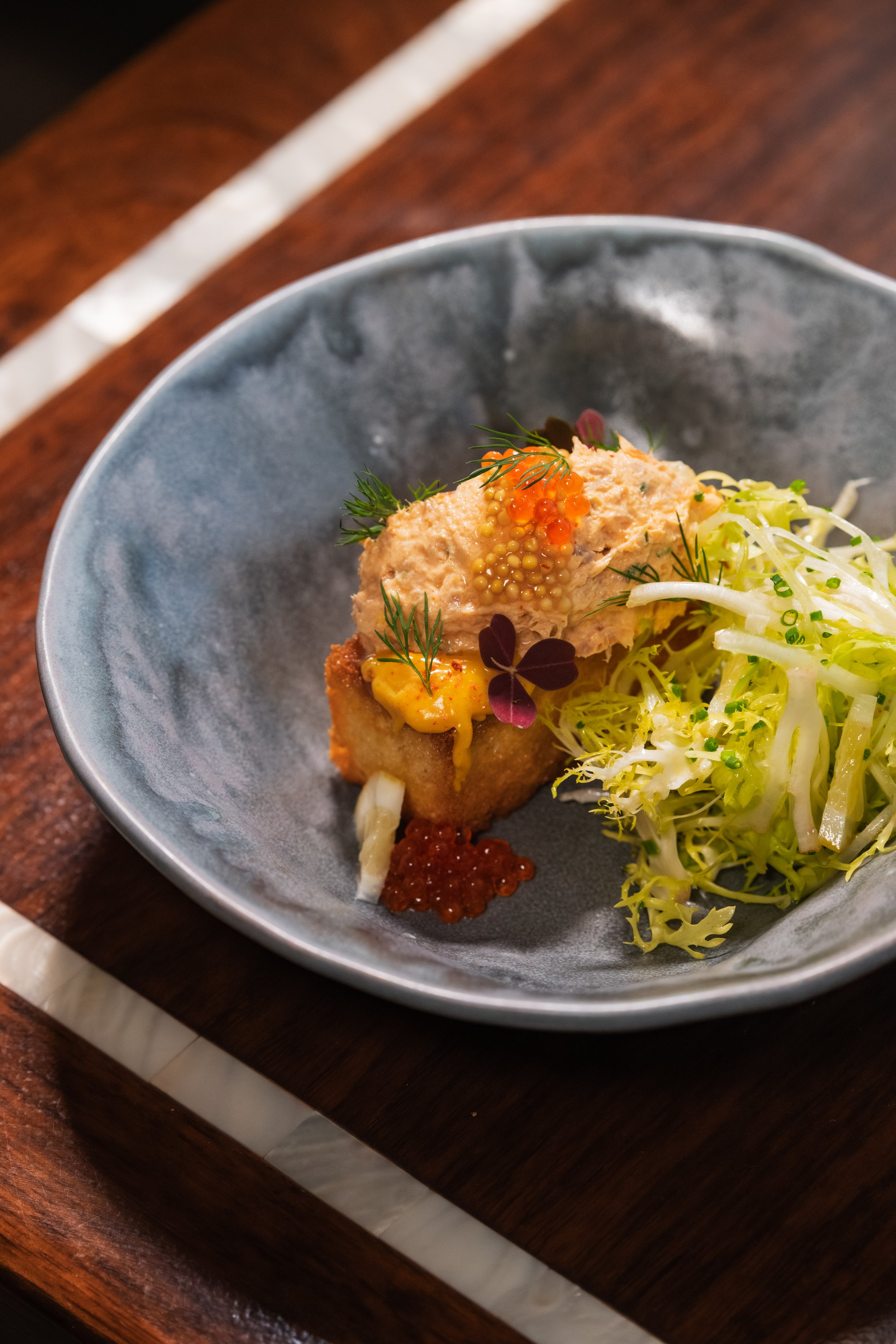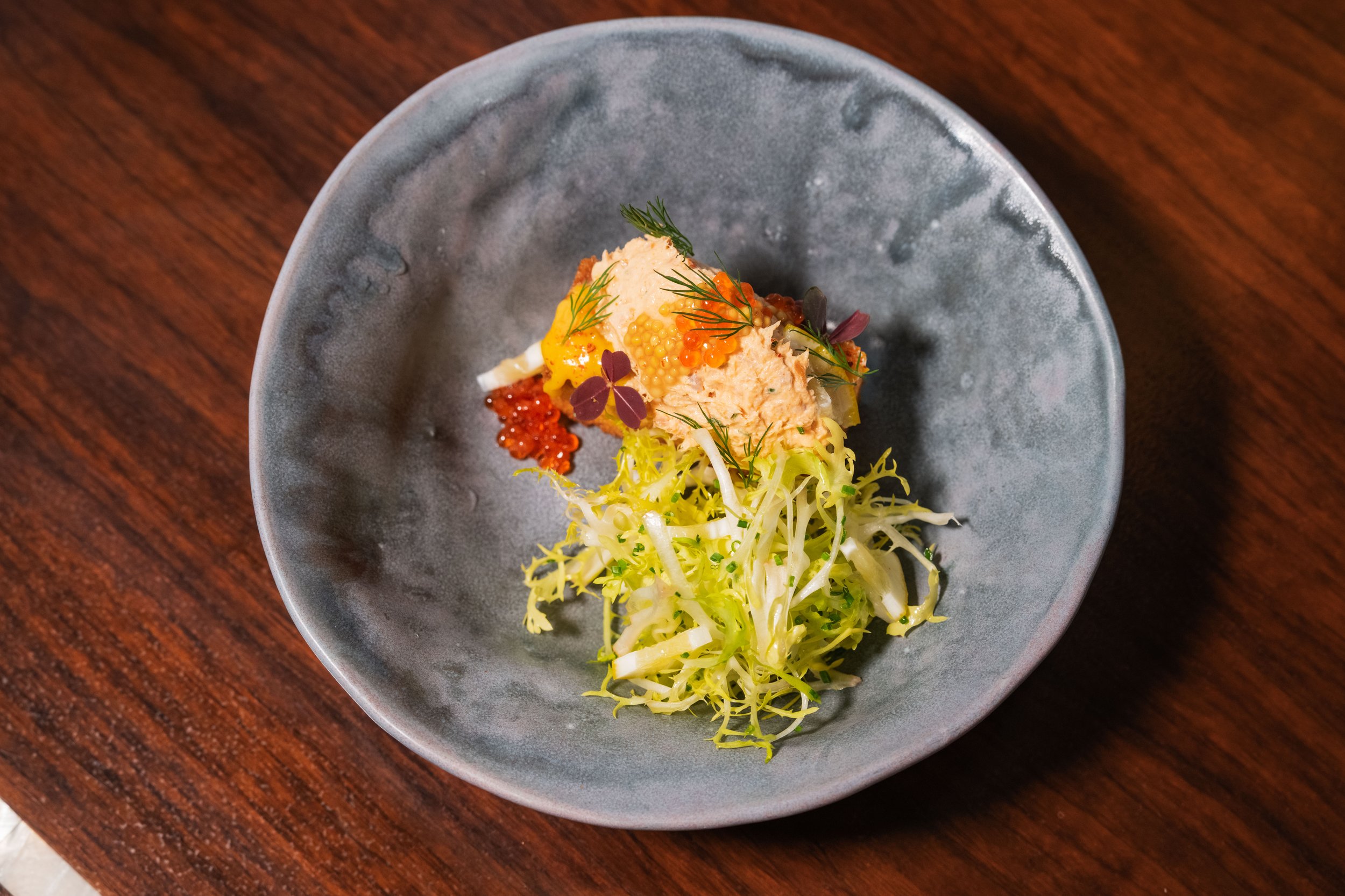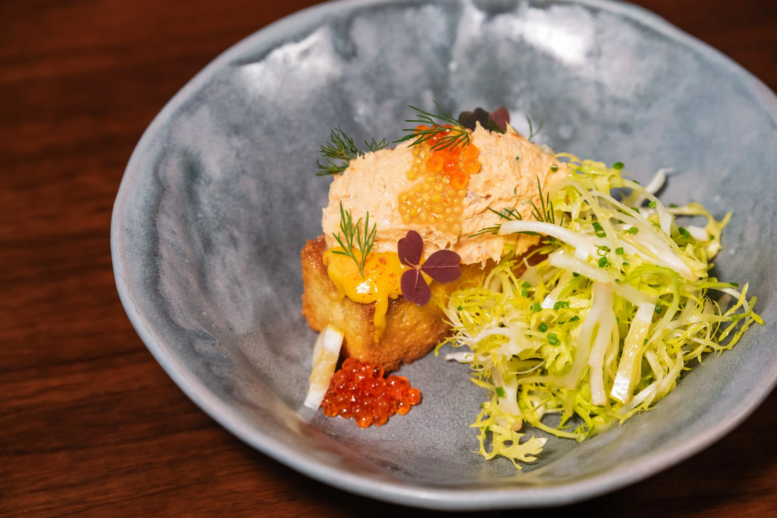 Applewood-Smoked Trout Dip, Toasted Brioche, Frisée Salad, Egg Yolk Jam, Compressed Lemon, Smoked Trout Roe, Dill